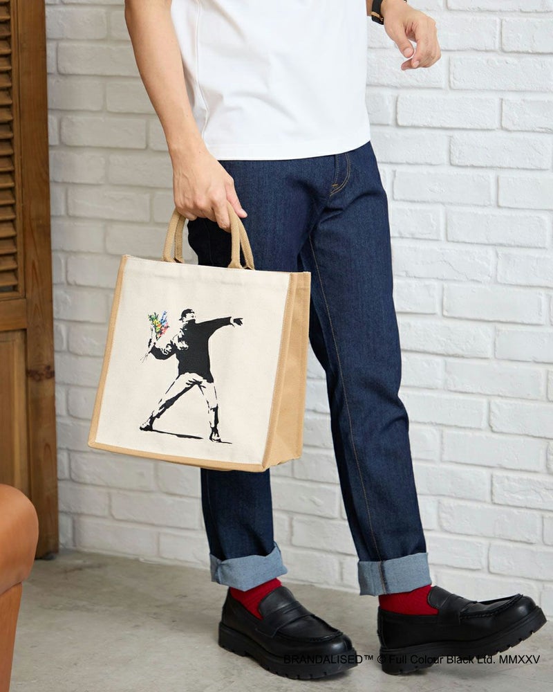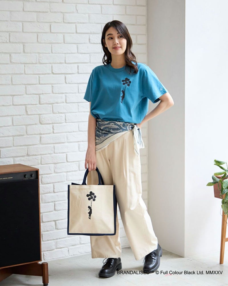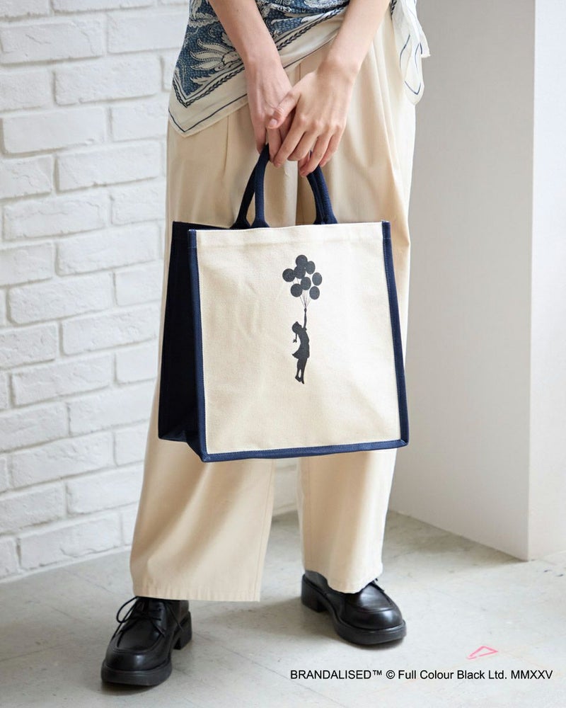 『BRANDALISED』 イギリスの Full Colour Black 社によるグラフィティプロジェクト。 覆面アーティスト・バンクシー (Banksy) のグラフィティ写真を使用したアイテムやブランドコラボレーションを展開。 BRANDALISEDとのコラボレーションによる バンクシーのグラフィティ写真を使用したトートバッグです。 きっと多くの人がどこかで一度は目にしたことのある、バンクシーの代表作『Balloon Girl』 『Yellow Lines』 『Flower Bomber』 『Jerusalem Balloon Girl』をセレクト。 丈夫なキャンバス地のトートバッグにアートをプリント。ハンドルとサイドの配色がポイントです。A4サイズがすっぽり入り、マチも18cmとボリュームも十分。Tシャツと同じ作品をそれぞれプリントした4カラー展開です。 ウィメンズサイズのBRANDALISED Tシャツはこちら メンズサイズのBRANDALISED Tシャツはこちら Golden Bear WOMEN アクセサリ (WOMEN) 家族コーディネートアイテムはこちら 【着用アイテム】467R4432 BRANDALISEDTシャツ 468R3751 スカート 468R3760 ストレートパンツ
