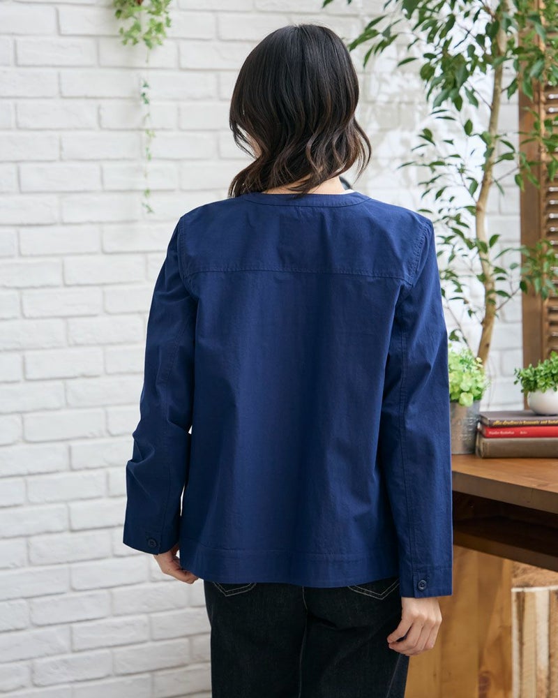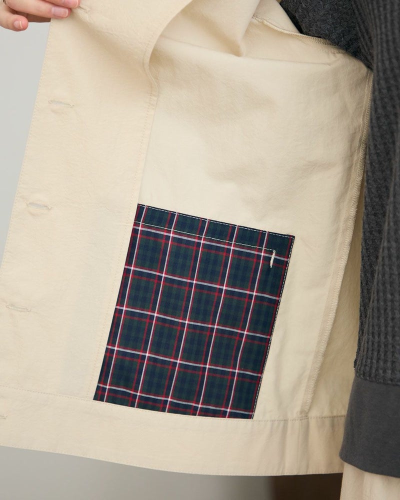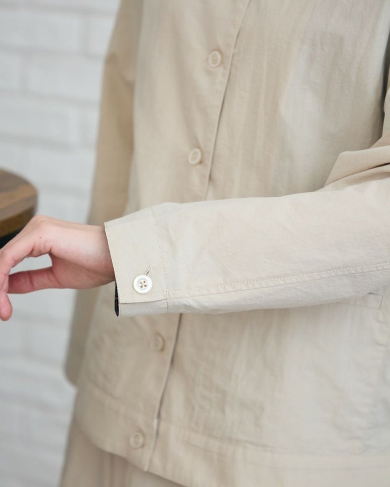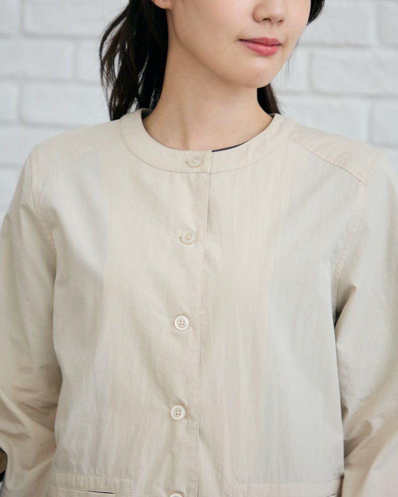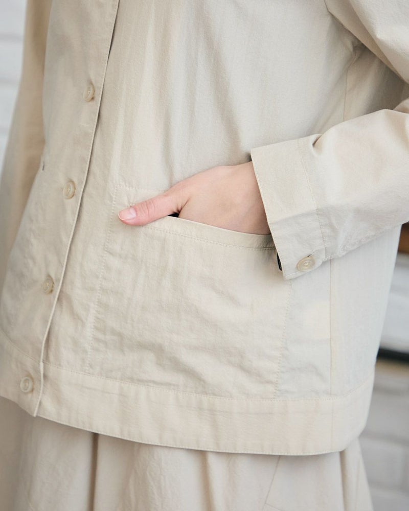 生地の表面に細かいシワ加工をかけた綿ナイロン素材のジャケットです。シワ加工により、程よいラフ感を出しました。見返し部分はGBオリジナルチェックをポイントで使用しています。デザインはシンプルなノーカラーの前ボタン開きになります。色はベージュとネイビーの2色展開です。467R4703 のスカートと同素材を使用していますので、セットアップとしてもお楽しみ頂けます。 モデル身長: 166 cm 着用サイズ: M サイズ Golden Bear WOMEN アウター (WOMEN) 【着用アイテム】467R4402 ジャカードTシャツ 467R5435 GBロゴTシャツ 467R4702 テーパードパンツ 467R4703 スカート