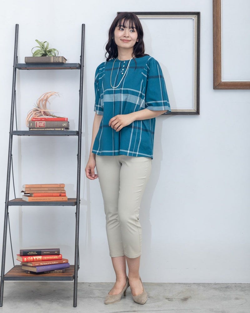 サステナブルな廃棄植物由来染料を使用したBIGチェックブラウスです。ゆったりとしたアームホールのフレアースリーブが二の腕カバーになるデザインです。デニム合わせがおすすめです。 モデル身長: 168 cm 着用サイズ: M サイズ Golden Bear WOMEN ブラウス (WOMEN) 同デザイン大きい(3L,4Lサイズ)はこちら 【着用アイテム】467R4731 テーパードパンツ 468R3760 ストレートパンツ