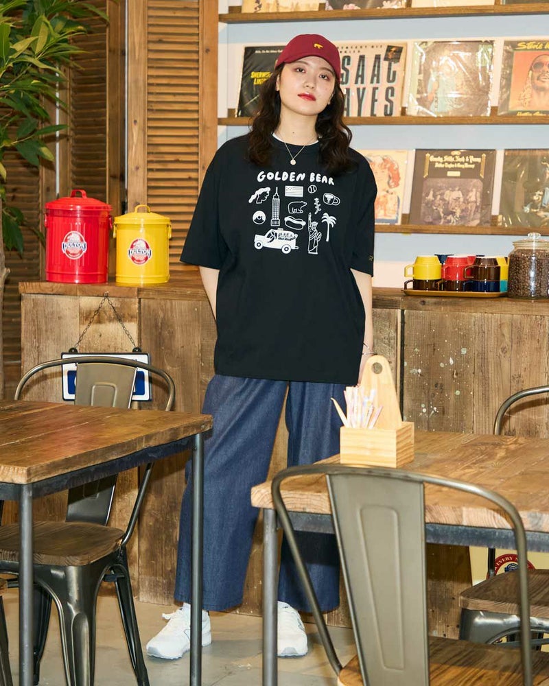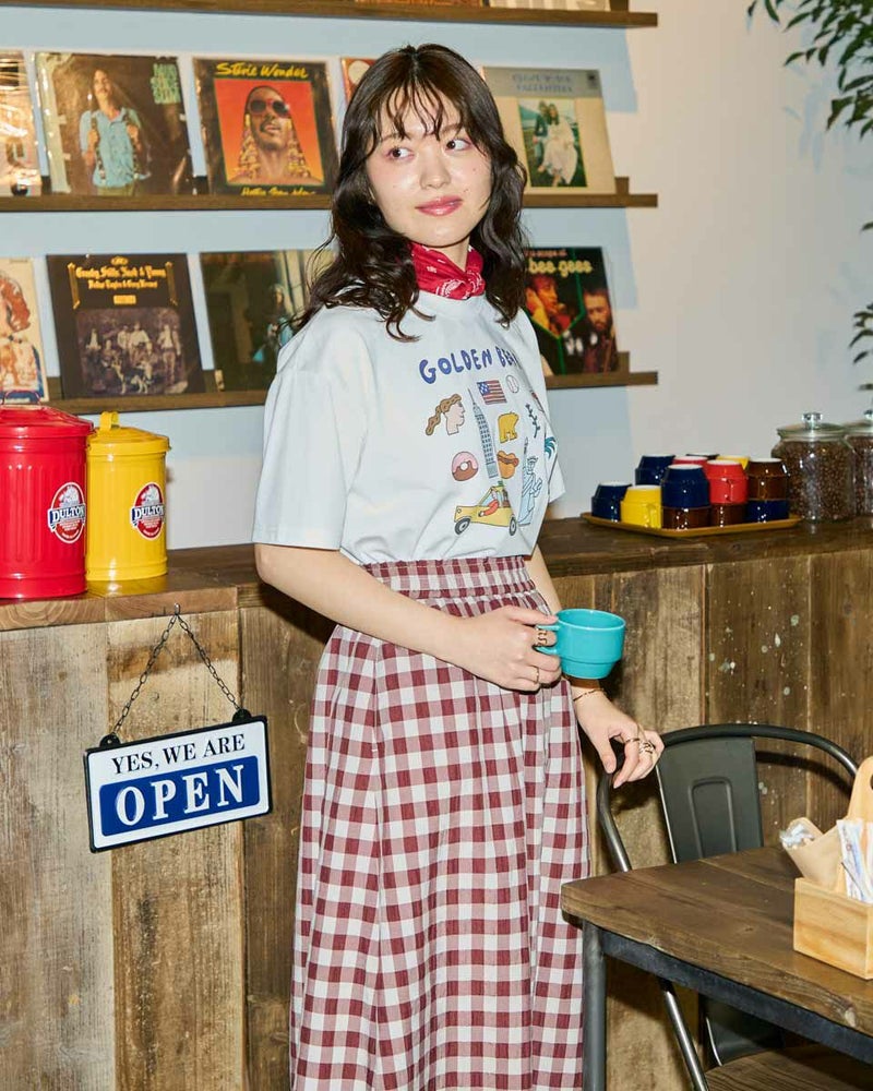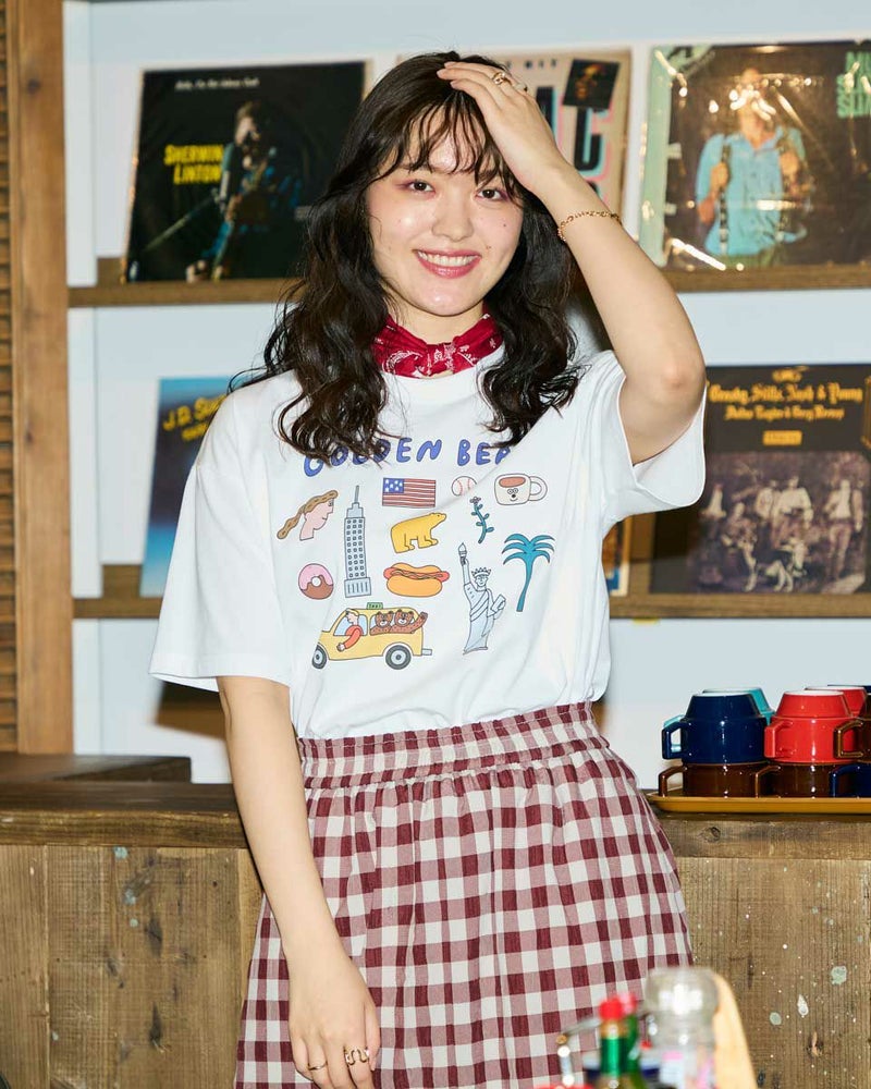 【Collaboration with Saki Morinaga】 Golden Bearの「ブランドとアイコンである金熊を、もっと多くの方に知ってもらいたい」——そんな想いから、イラストレーターとの特別なコラボレーションが実現。 様々なモチーフを散りばめたイラストTシャツです。 少し力の抜けた可愛らしいモチーフでアメリカを表現していただきました。 素材は接触冷感・透け防止・吸水速乾性に優れたプレーティング天竺生地。 襟はバインダー仕様にすることで100回洗濯してもよれにくくなっています。 ややゆとりを持たせたシルエットでざっくりとラフに着ることができるサイズ感に仕上げました。 モデル身長: 170 cm 着用サイズ: M サイズ Golden Bear WOMEN カットソー (WOMEN) カープリントTシャツ / Saki Morinaga コラボレーションはこちら メンズサイズはこちら 家族コーディネートアイテムはこちら 【着用アイテム】468R6760 チェックスカート