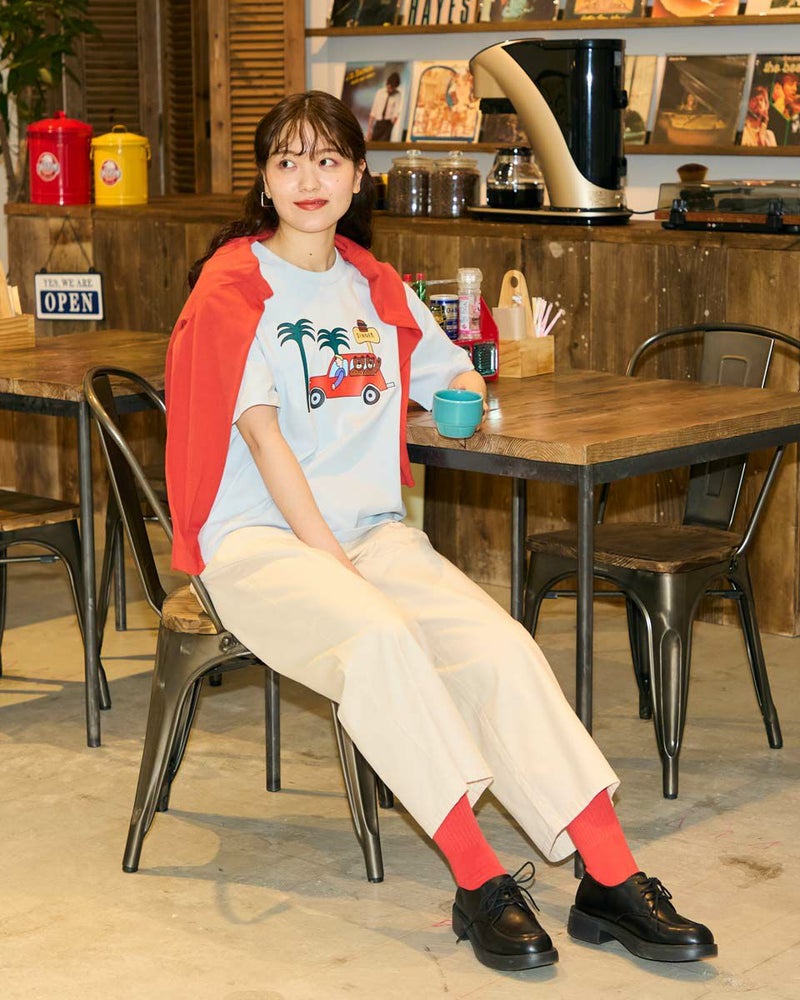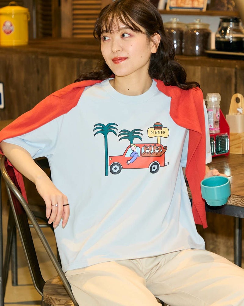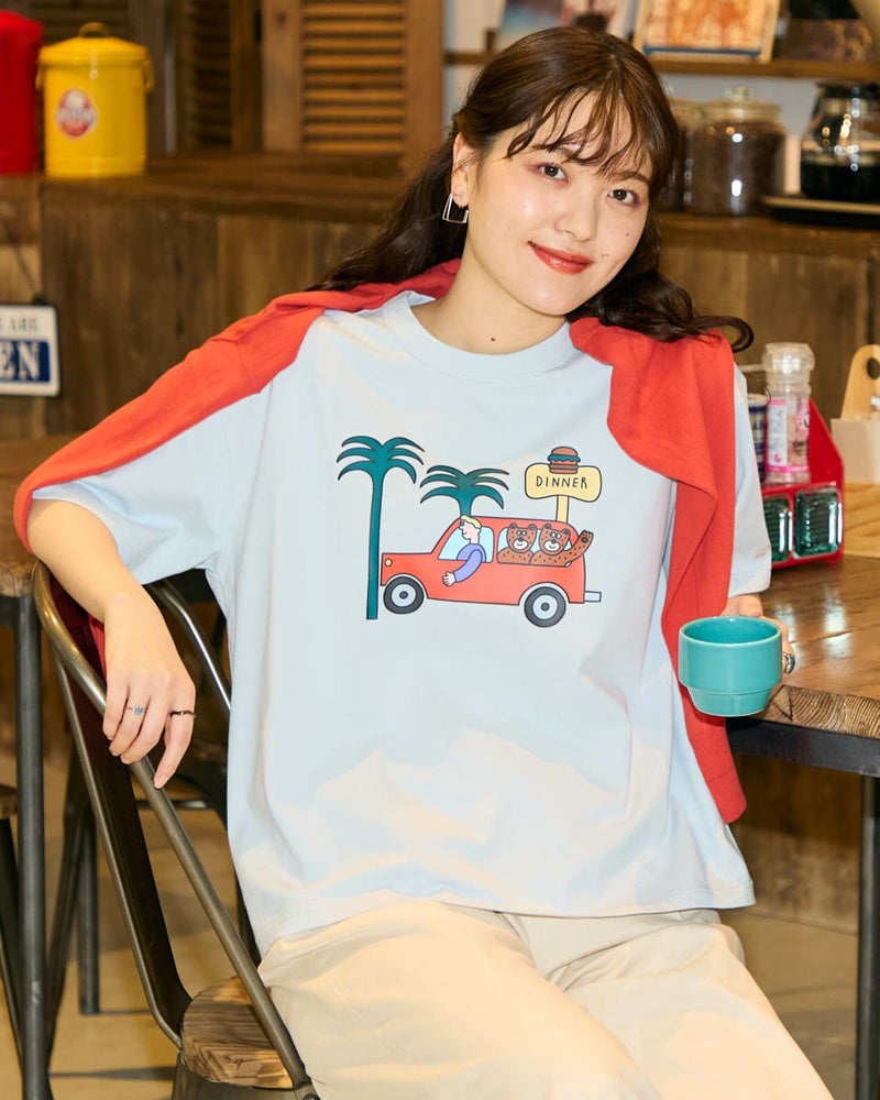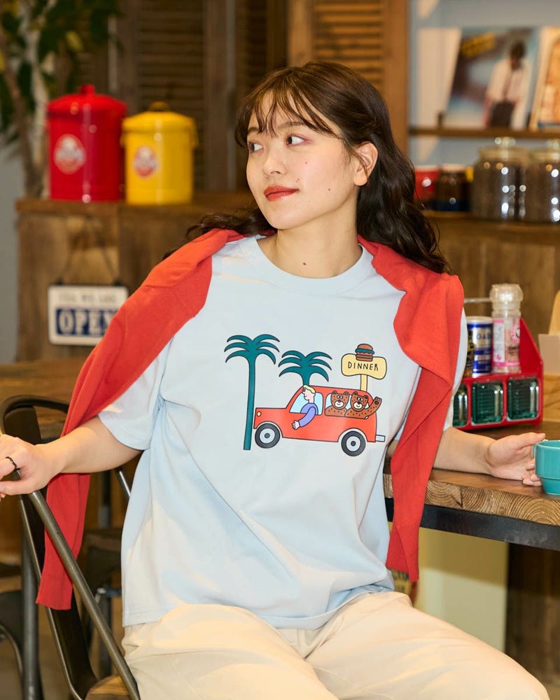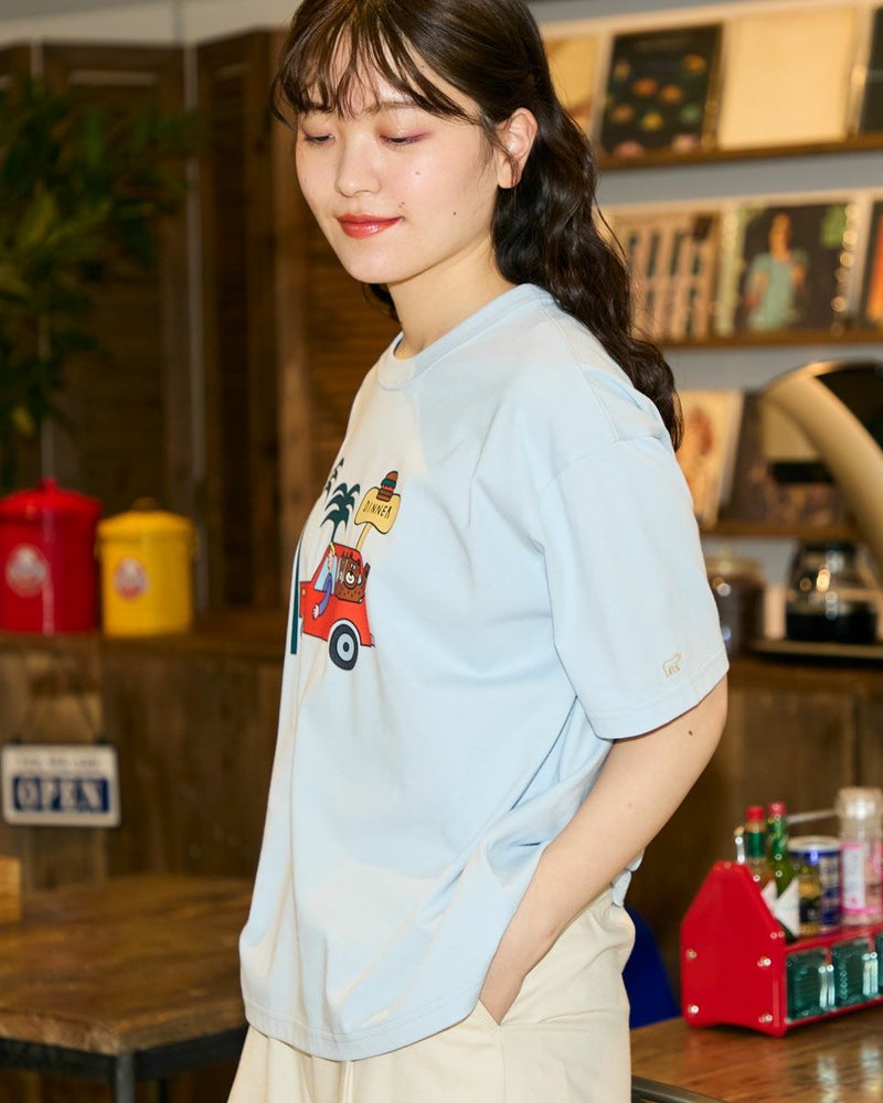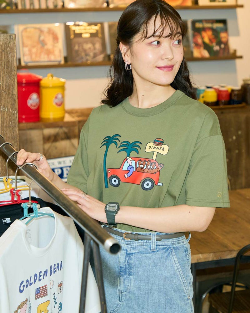 【Collaboration with Saki Morinaga】 Golden Bearの「ブランドとアイコンである金熊を、もっと多くの方に知ってもらいたい」——そんな想いから、イラストレーターとの特別なコラボレーションが実現。 窓から2匹のクマが顔をのぞかせたオレンジの車が印象的なイラストTシャツです。 素材は接触冷感・透け防止・吸水速乾性に優れたプレーティング天竺生地。 襟はバインダー仕様にすることで100回洗濯してもよれにくくなっています。 ややゆとりを持たせたシルエットでざっくりとラフに着ることができるサイズ感に仕上げました。 モデル身長: 170 cm 着用サイズ: M サイズ Golden Bear WOMEN カットソー (WOMEN) モチーフプリントTシャツ / Saki Morinaga コラボレーションはこちら メンズサイズはこちら 家族コーディネートアイテムはこちら