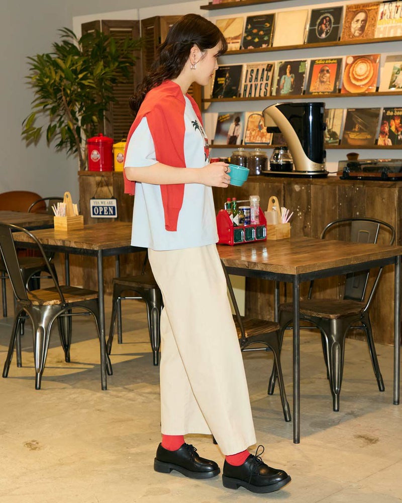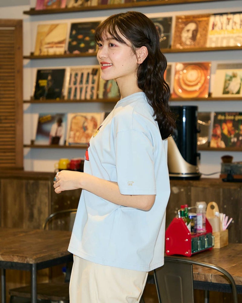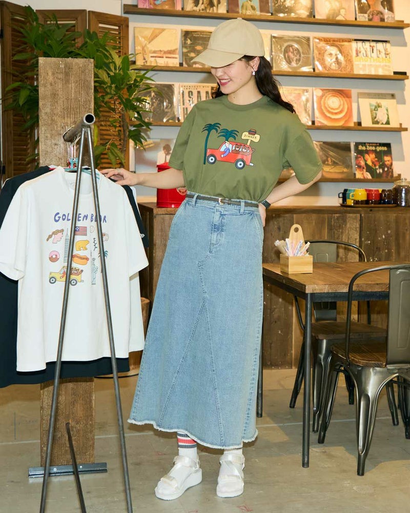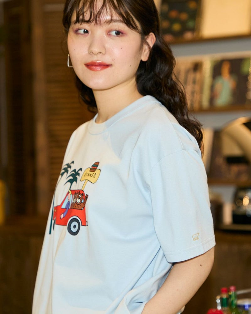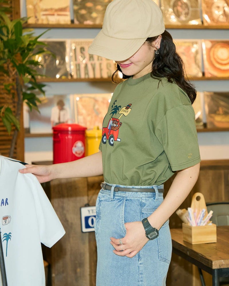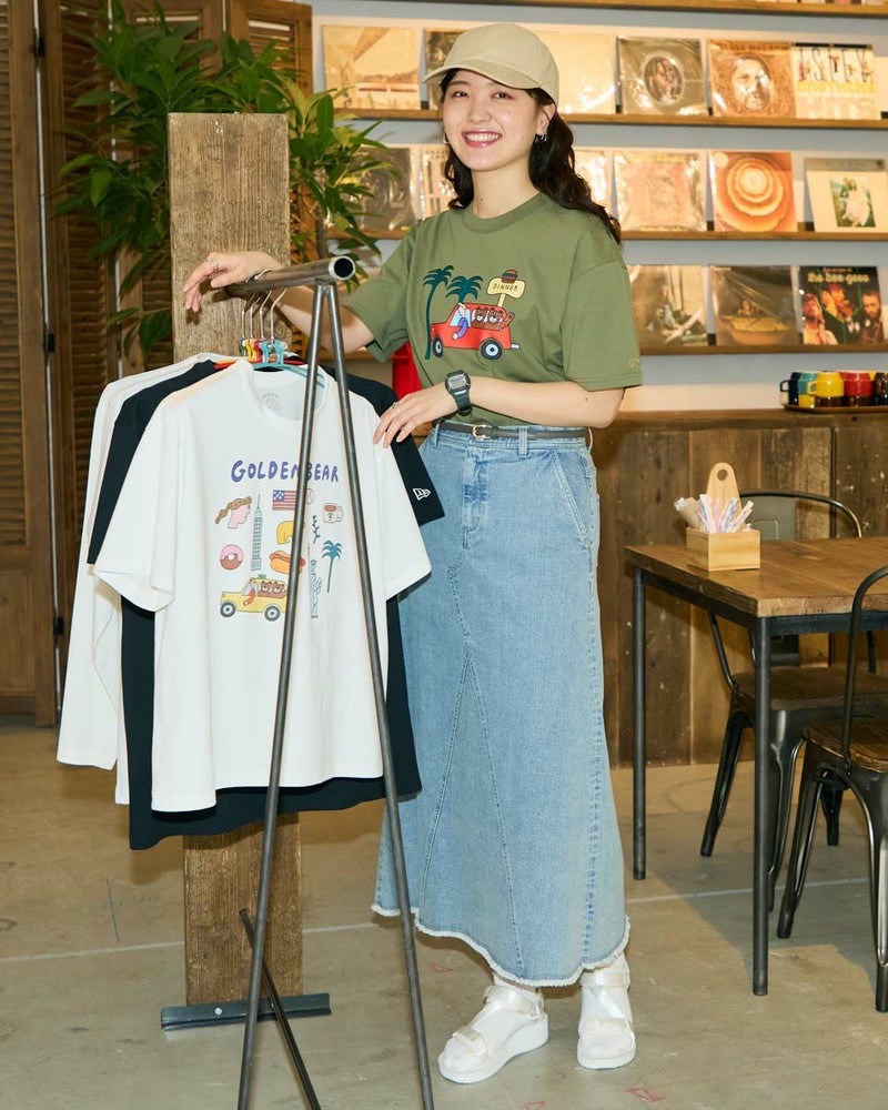 【Collaboration with Saki Morinaga】 Golden Bearの「ブランドとアイコンである金熊を、もっと多くの方に知ってもらいたい」——そんな想いから、イラストレーターとの特別なコラボレーションが実現。 窓から2匹のクマが顔をのぞかせたオレンジの車が印象的なイラストTシャツです。 素材は接触冷感・透け防止・吸水速乾性に優れたプレーティング天竺生地。 襟はバインダー仕様にすることで100回洗濯してもよれにくくなっています。 ややゆとりを持たせたシルエットでざっくりとラフに着ることができるサイズ感に仕上げました。 モデル身長: 170 cm 着用サイズ: M サイズ Golden Bear WOMEN カットソー (WOMEN) モチーフプリントTシャツ / Saki Morinaga コラボレーションはこちら メンズサイズはこちら 家族コーディネートアイテムはこちら