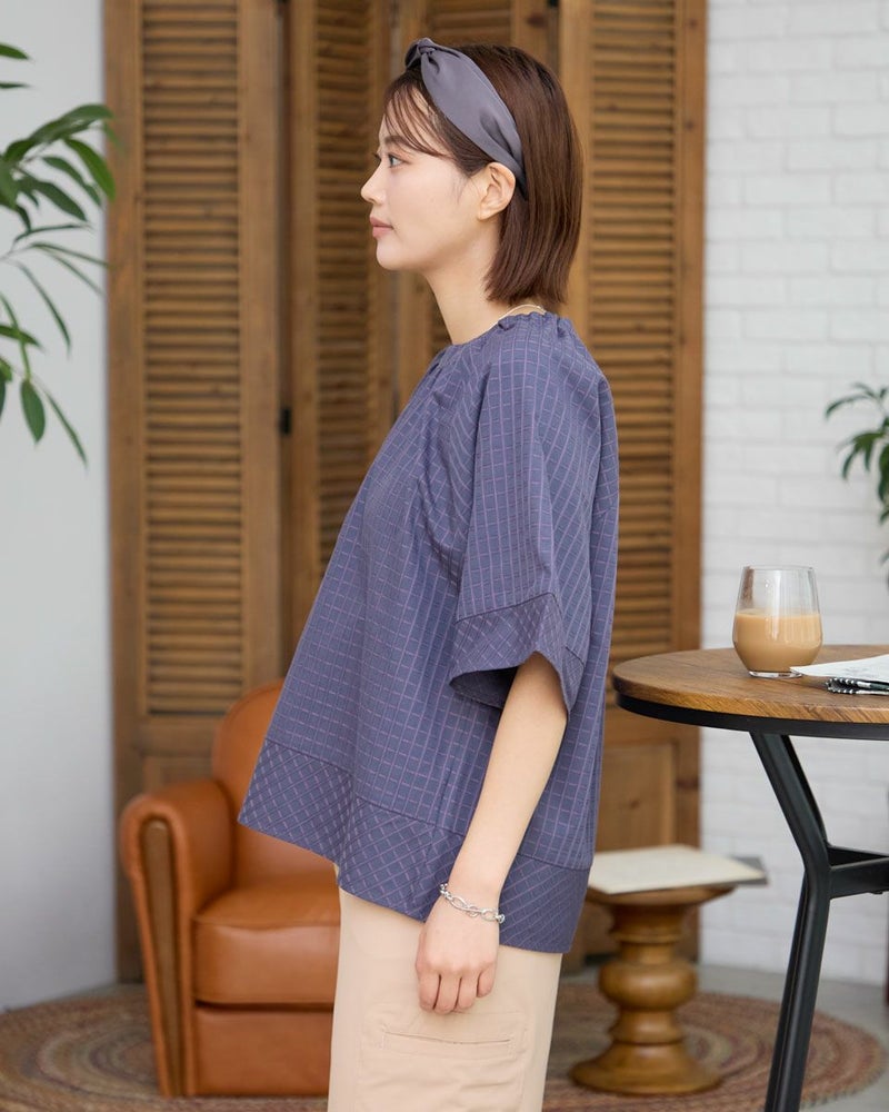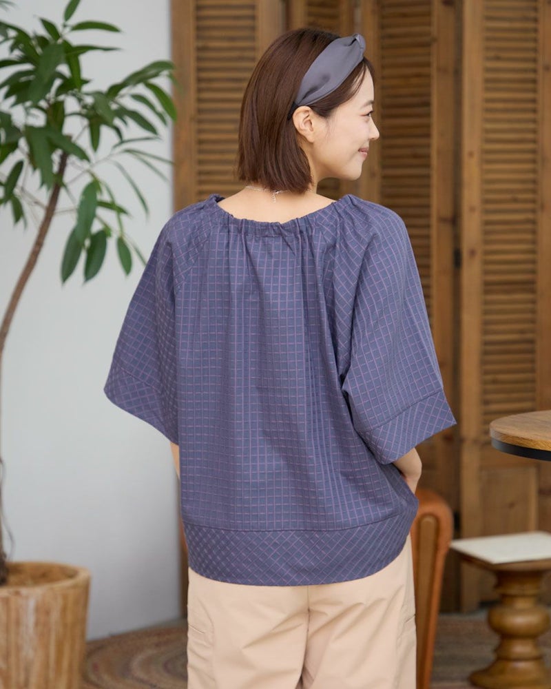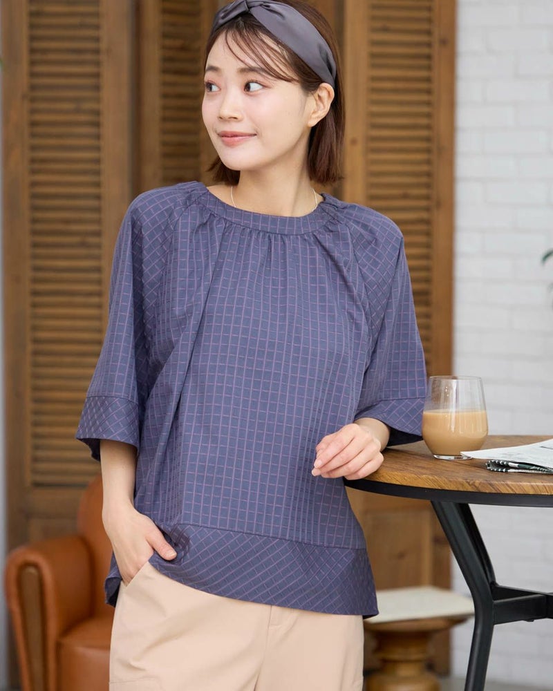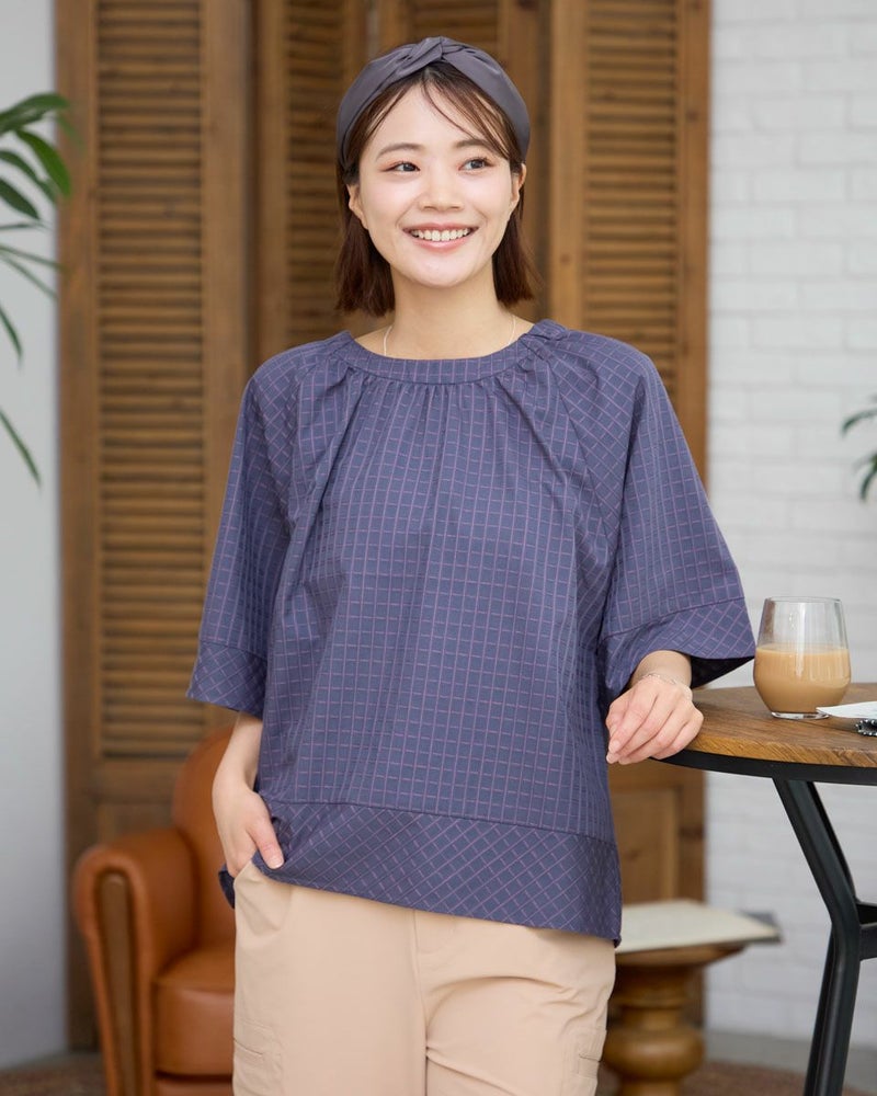 スモックタイプのブラウスです。襟元はゴムの仕様で簡単に着用いただけます。ボトムとバランスがとりやすい短めな着丈です。織りと配色でチェックを表現。さりげない中に存在感のある素材となっています。 モデル身長: 167 cm 着用サイズ: M サイズ Golden Bear WOMEN ブラウス (WOMEN) 【着用アイテム】467R7711 ストレートカーゴパンツ 467R8702 セミワイドパンツ