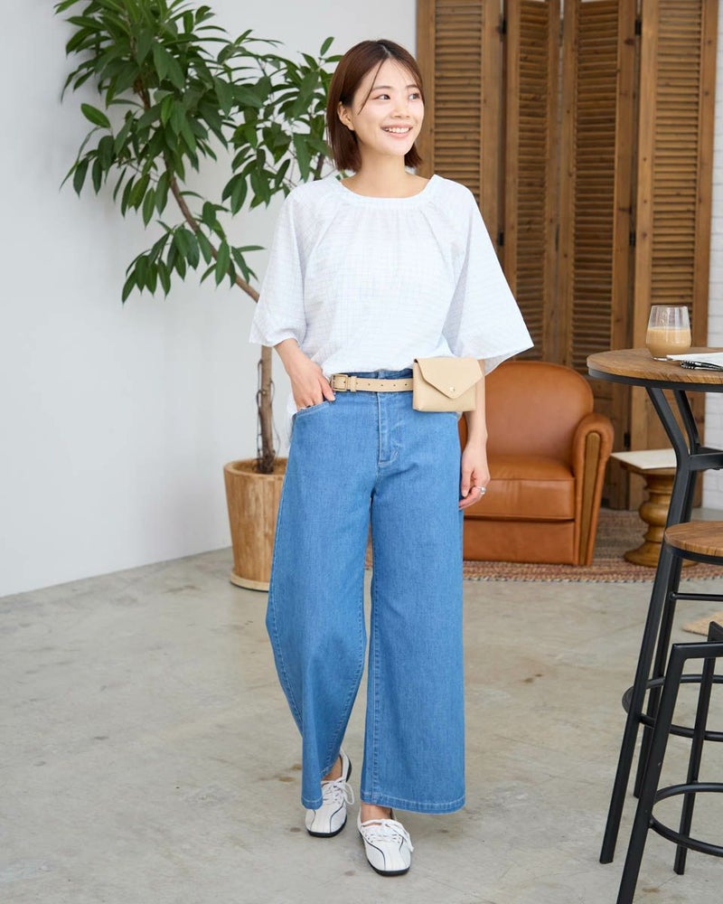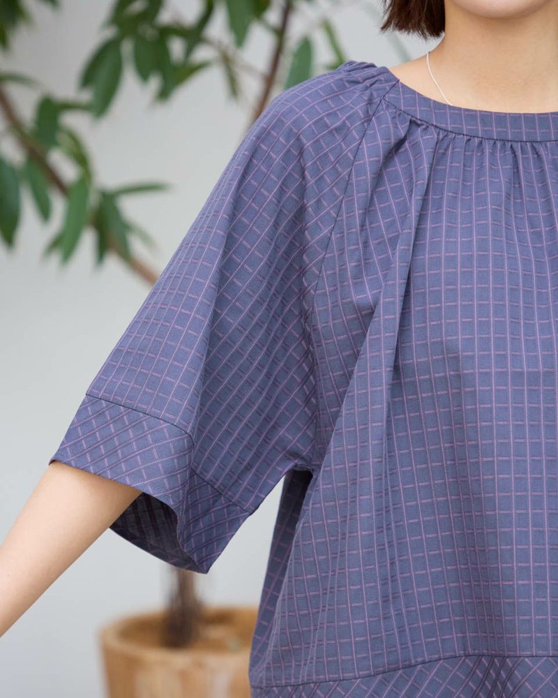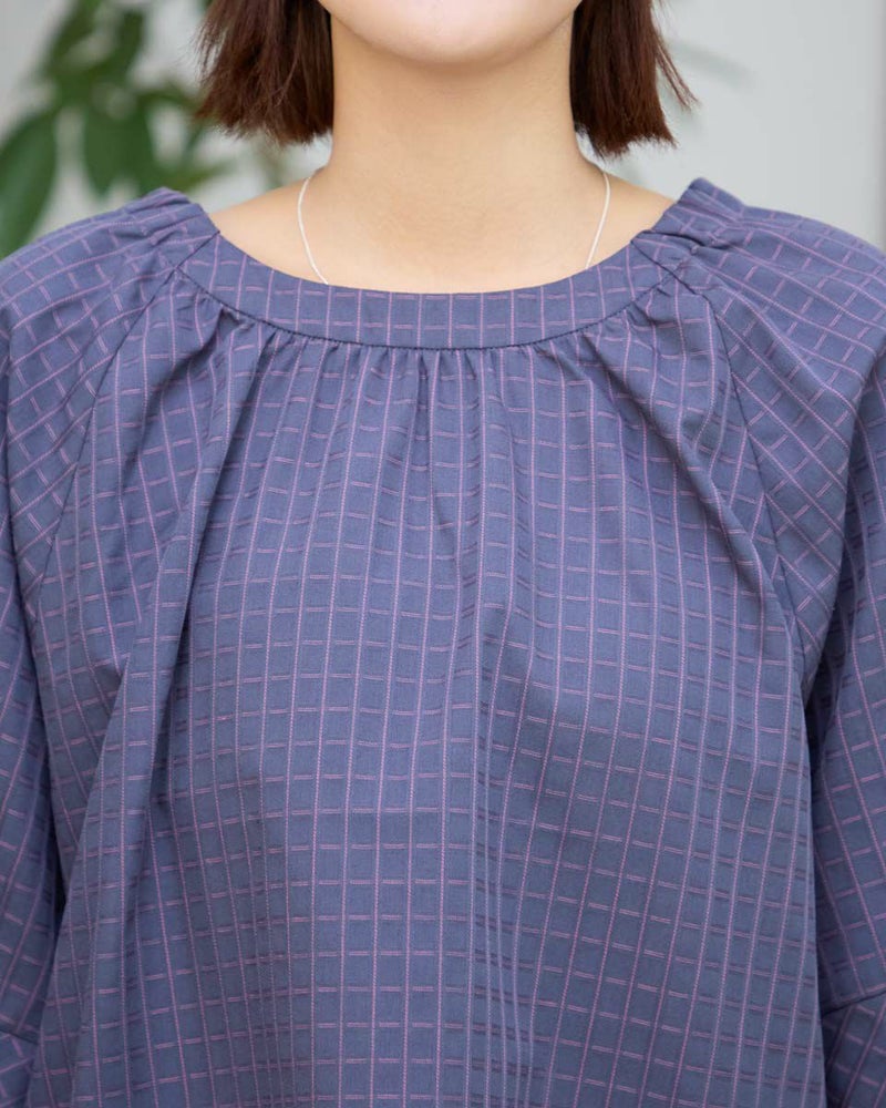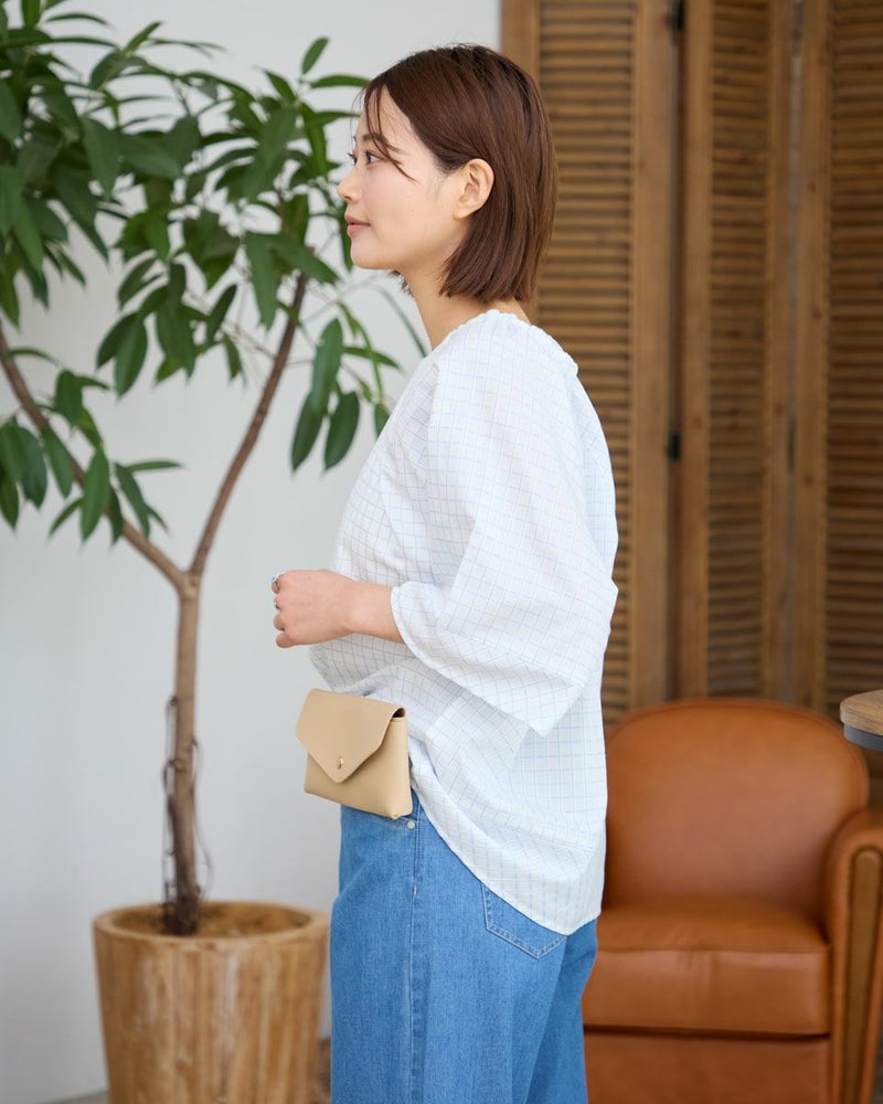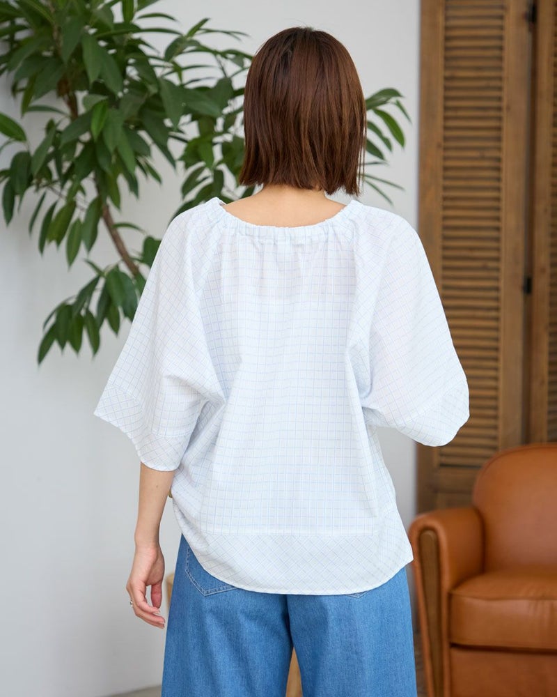 スモックタイプのブラウスです。襟元はゴムの仕様で簡単に着用いただけます。ボトムとバランスがとりやすい短めな着丈です。織りと配色でチェックを表現。さりげない中に存在感のある素材となっています。 モデル身長: 167 cm 着用サイズ: M サイズ Golden Bear WOMEN ブラウス (WOMEN) 【着用アイテム】467R7711 ストレートカーゴパンツ 467R8702 セミワイドパンツ