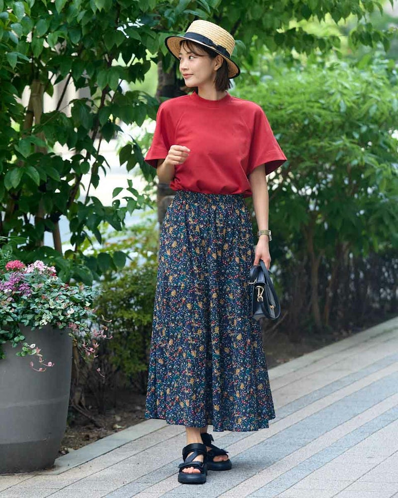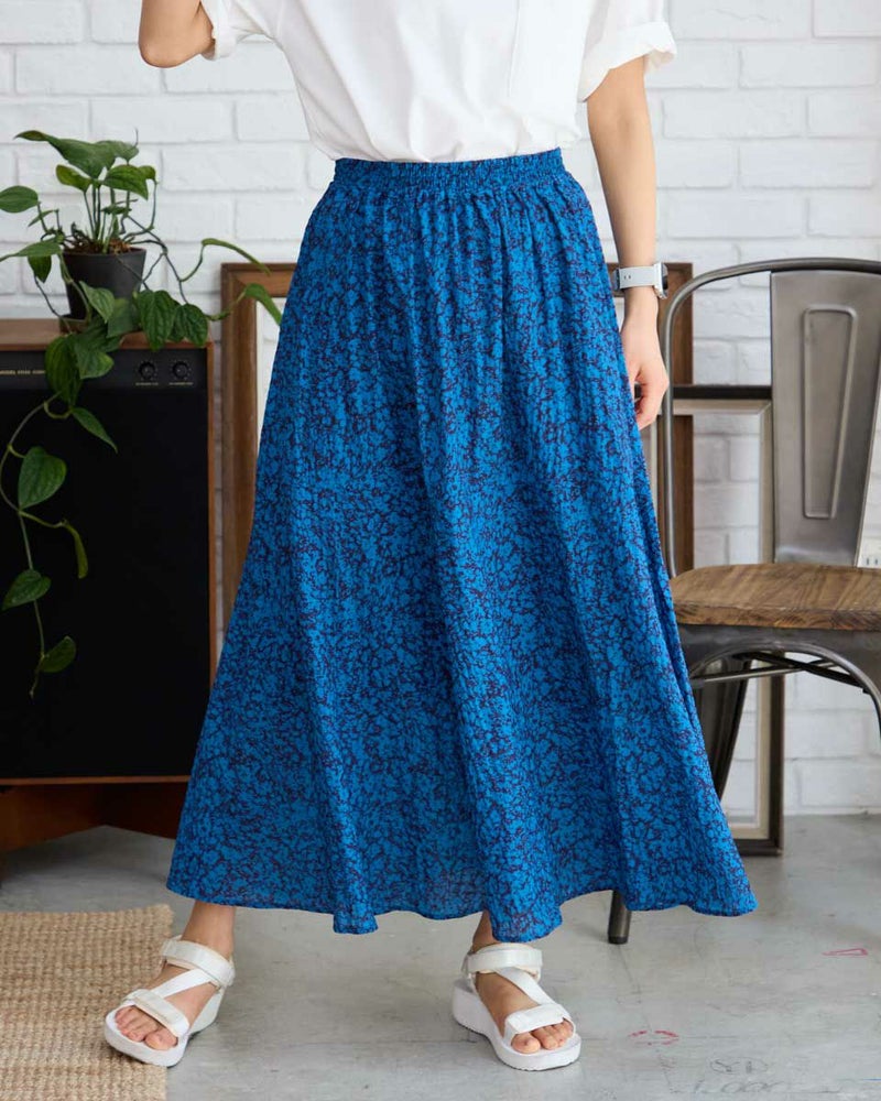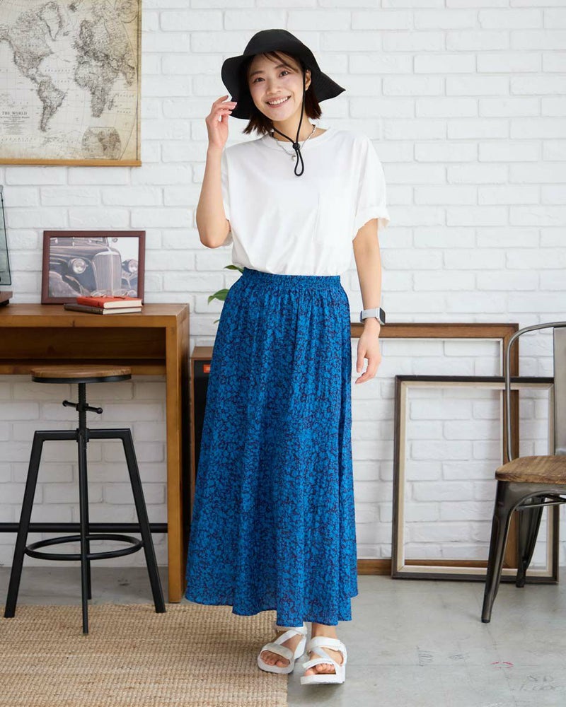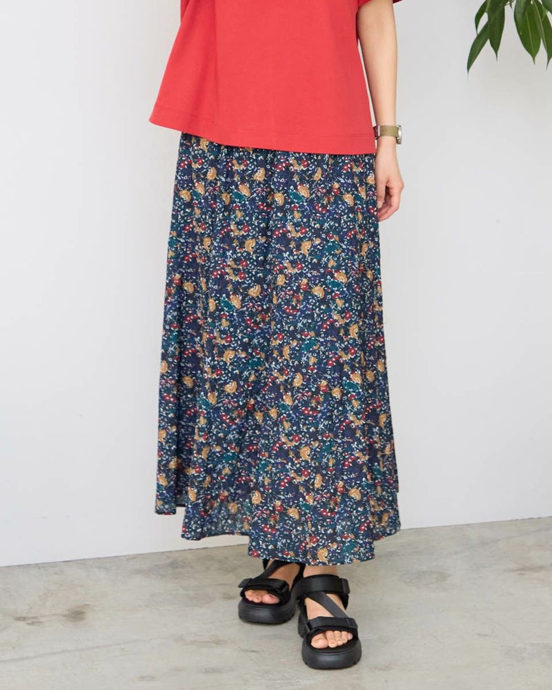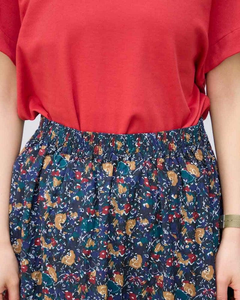 たてに波のような細かい畝の有る素材にプリントしたスカートです。表情のある素材で透け感が有り、濃色でも重さを感じさせないように仕上げました。裏地付きです。ウエストはオールゴムの開き無しで、ヒップライン辺りから、裾に向けフレアー分量を増やしたシルエットです。 モデル身長: 167 cm 着用サイズ: M サイズ Golden Bear WOMEN ボトムス (WOMEN) 【着用アイテム】468R7460 ハイネックプルオーバー 467R7002 ツバ広ハット