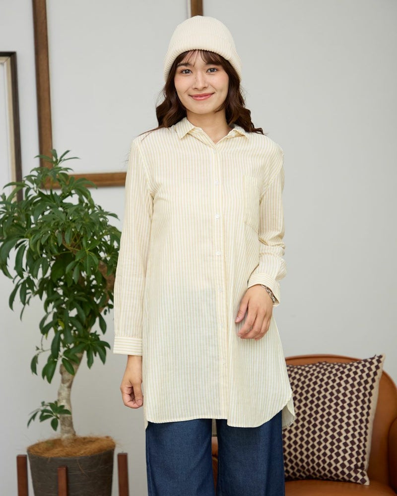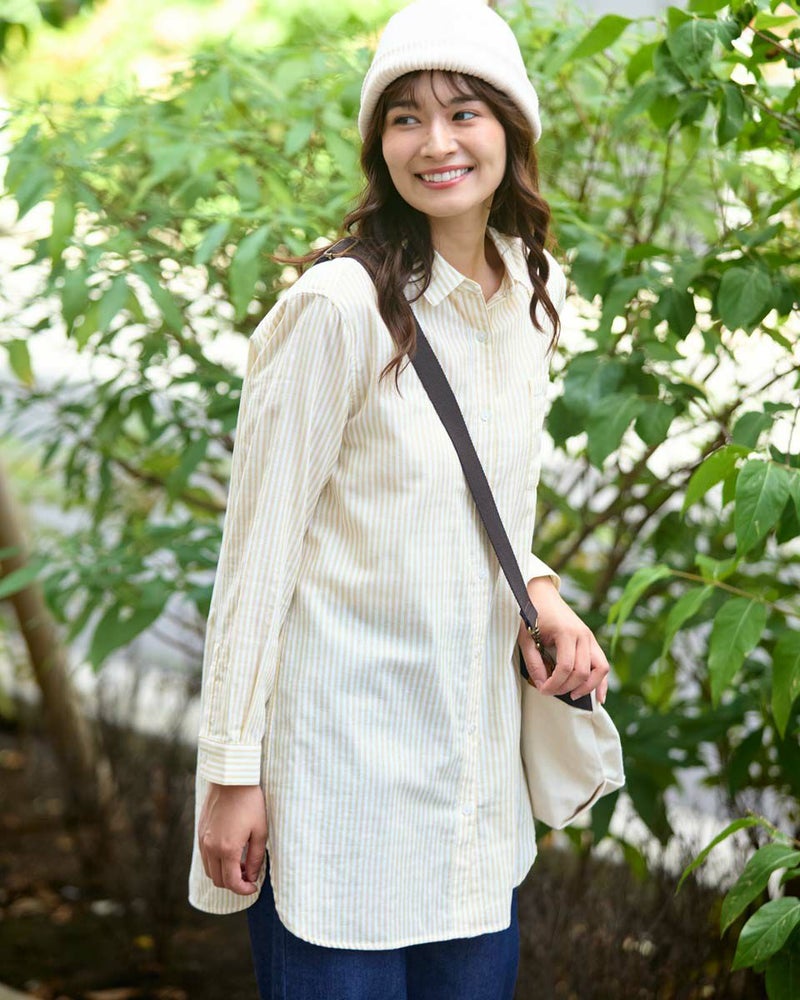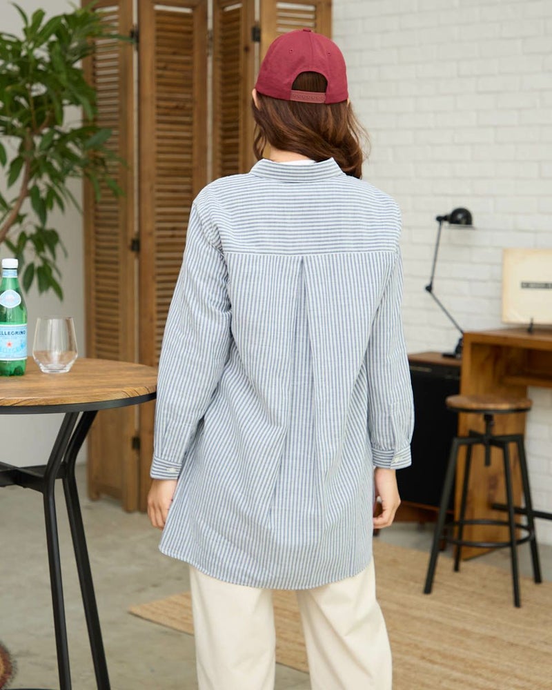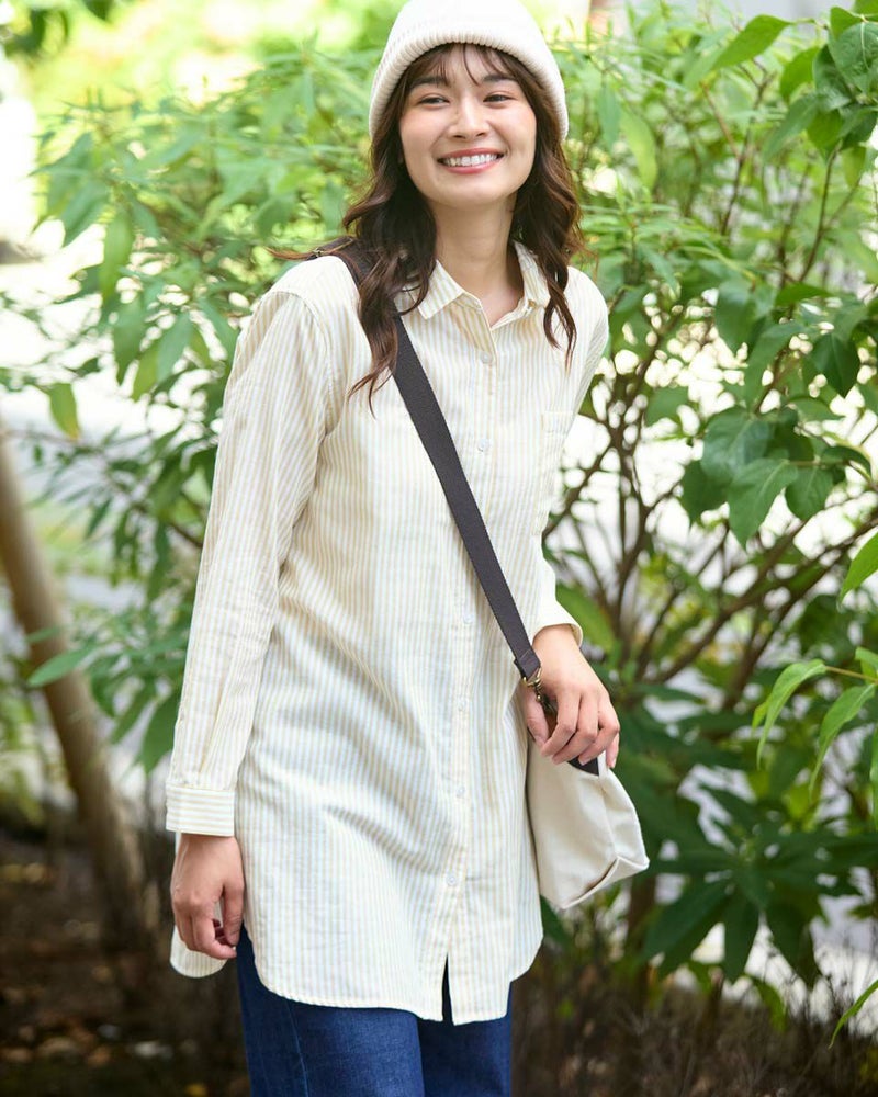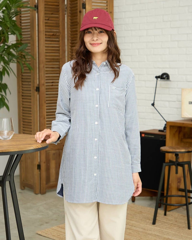 オーガニックコットン100%のふんわりとした膨らみ感が特徴のWガーゼ素材を使用したストライプ柄のシャツです。風合いが柔らかく肌触りの良い素材で一枚着としても夏の羽織物としても着用頂けます。左胸のポケットに枠くま刺繍を入れています。