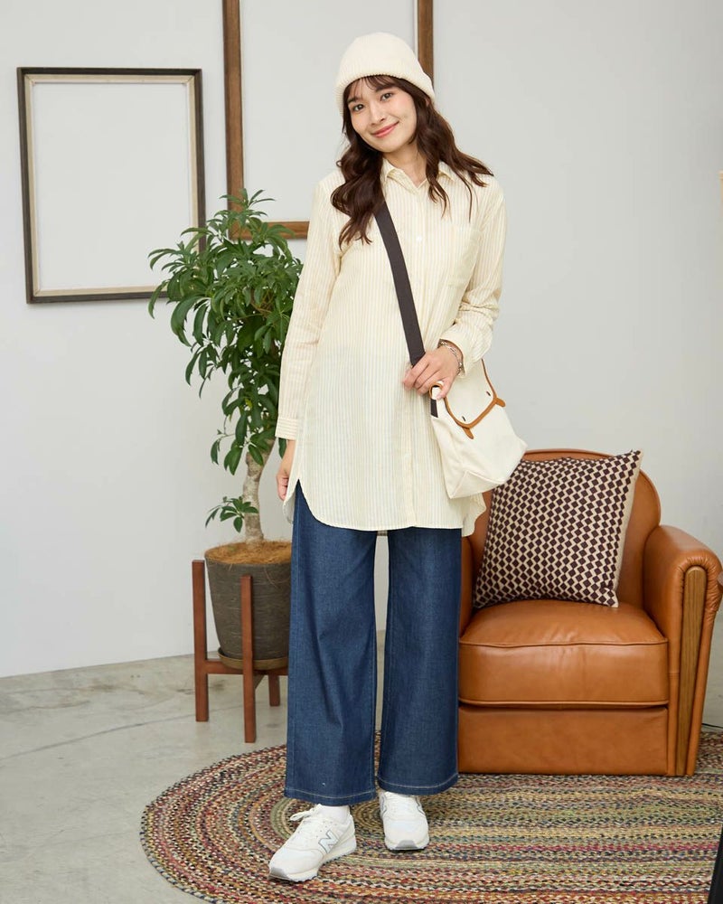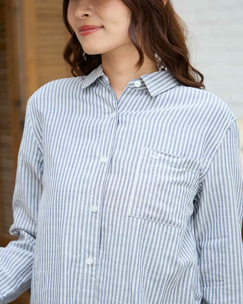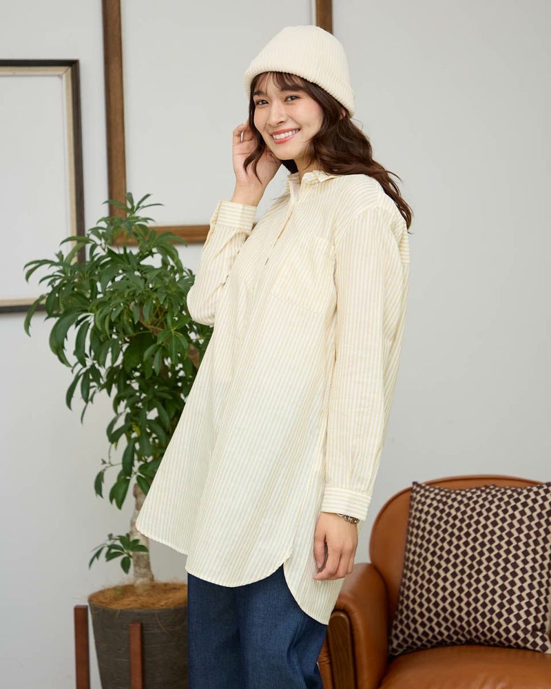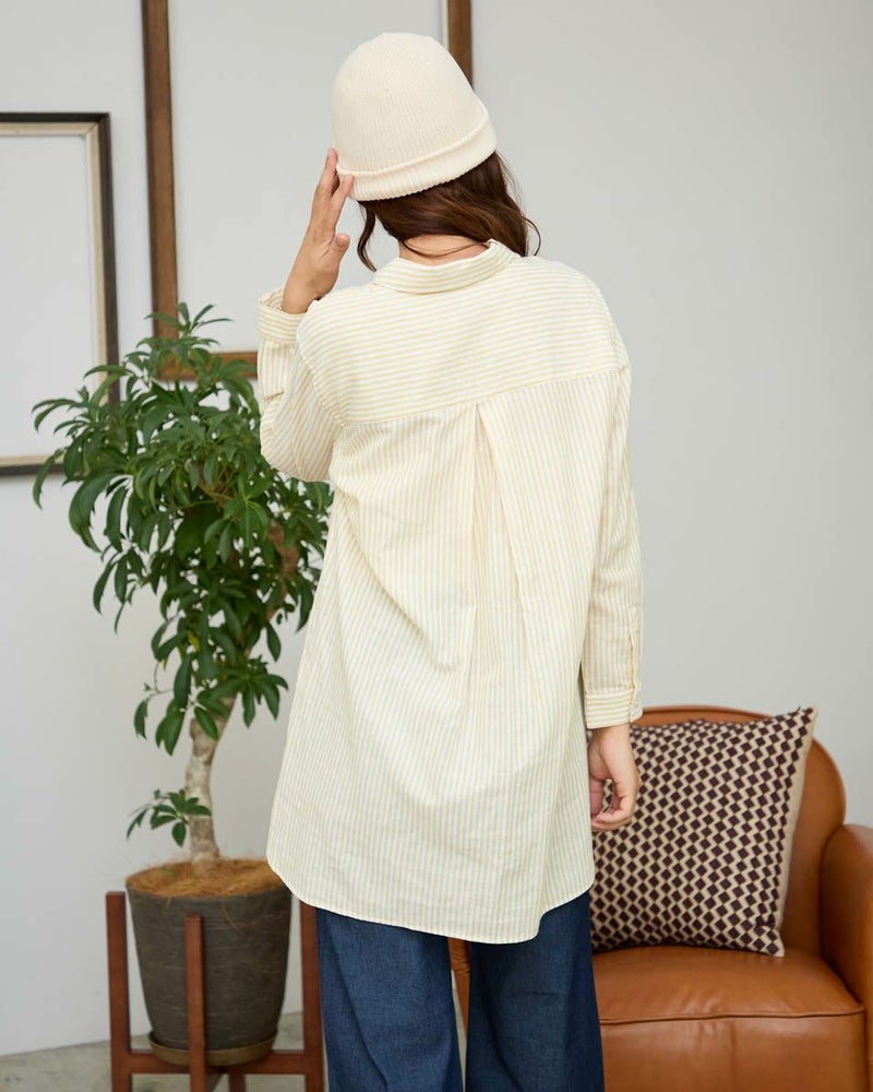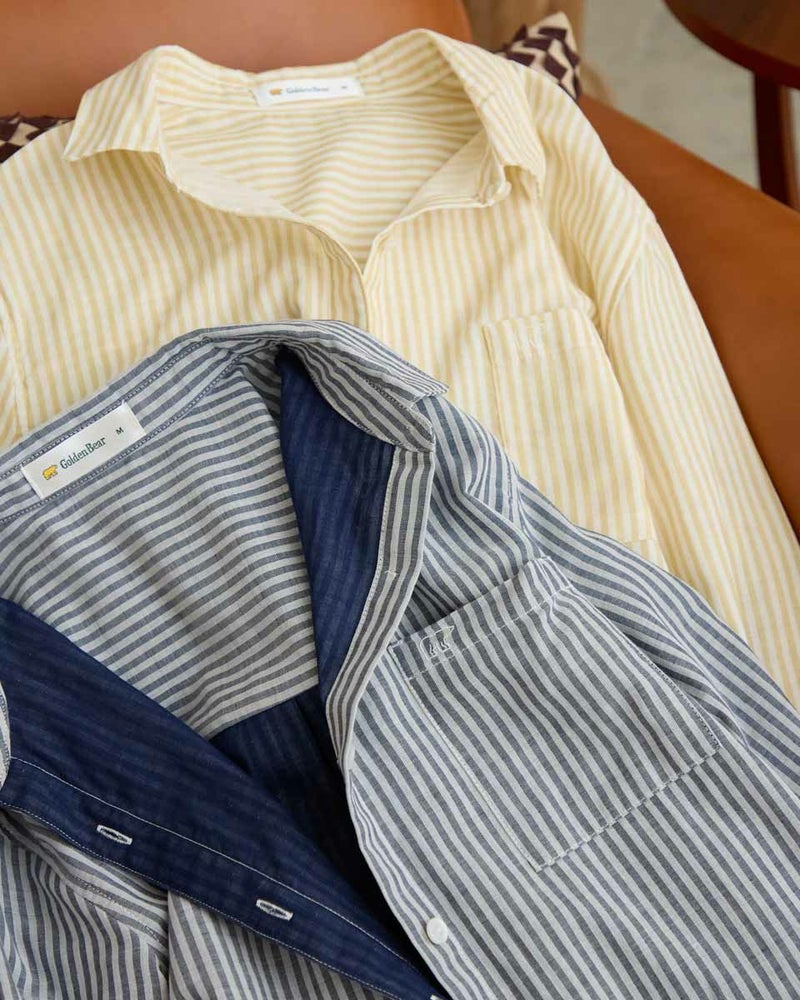オーガニックコットン100%のふんわりとした膨らみ感が特徴のWガーゼ素材を使用したストライプ柄のシャツです。風合いが柔らかく肌触りの良い素材で一枚着としても夏の羽織物としても着用頂けます。左胸のポケットに枠くま刺繍を入れています。