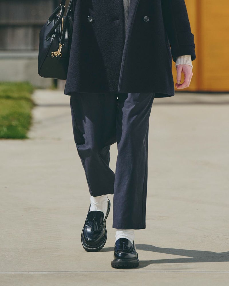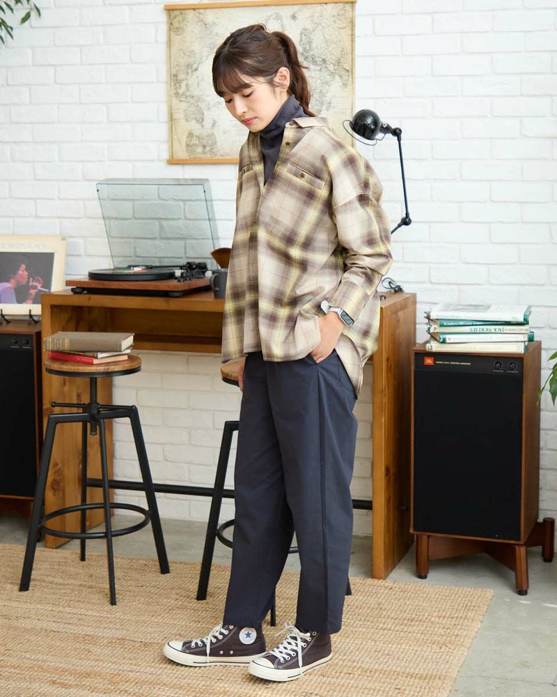 467RC102とセットアップで着用いただけるJKと同素材のパンツです。ストレッチ素材とゆとりを出したシルエットでストレスフリーに着用いただけます。ウエストゴム仕様で楽ちんなパンツです。 モデル身長: 168 cm 着用サイズ: S サイズ Golden Bear WOMEN ボトムス (WOMEN) 【着用アイテム】467RC301 オンブレチェックシャツ羽織り 467RC402 ドライタッチタートル長袖Tシャツ 471RD150 ウールPコート