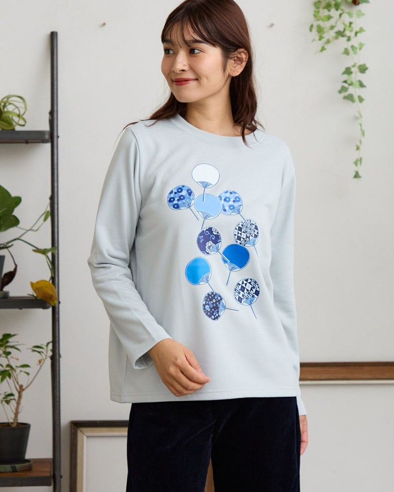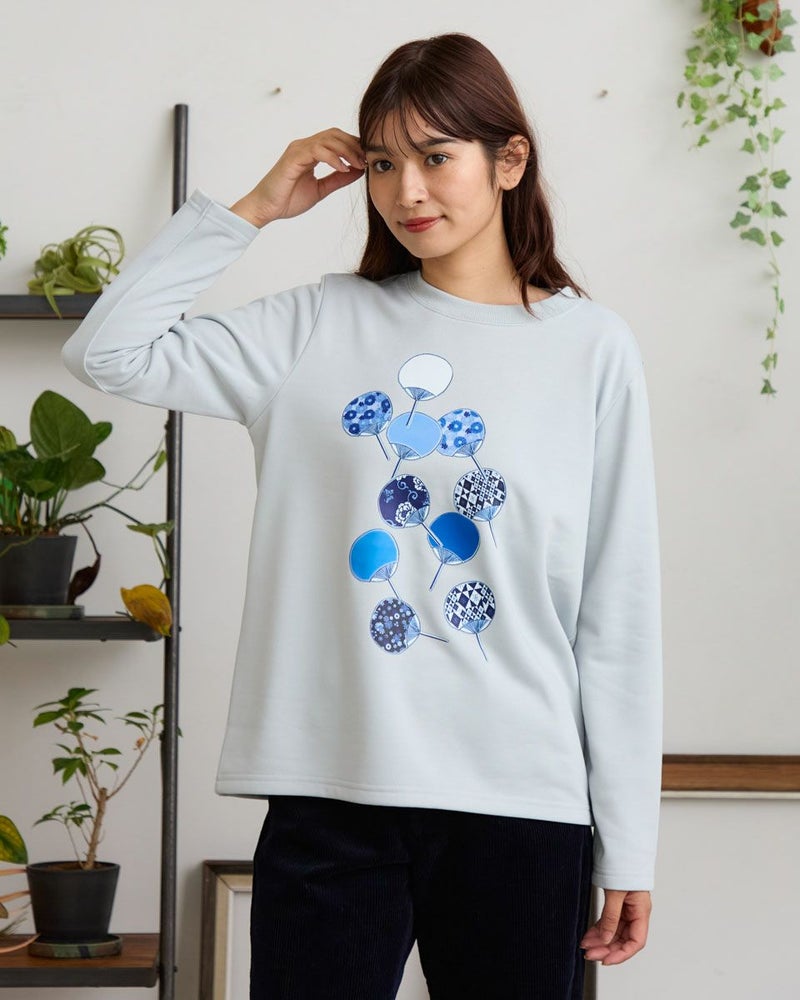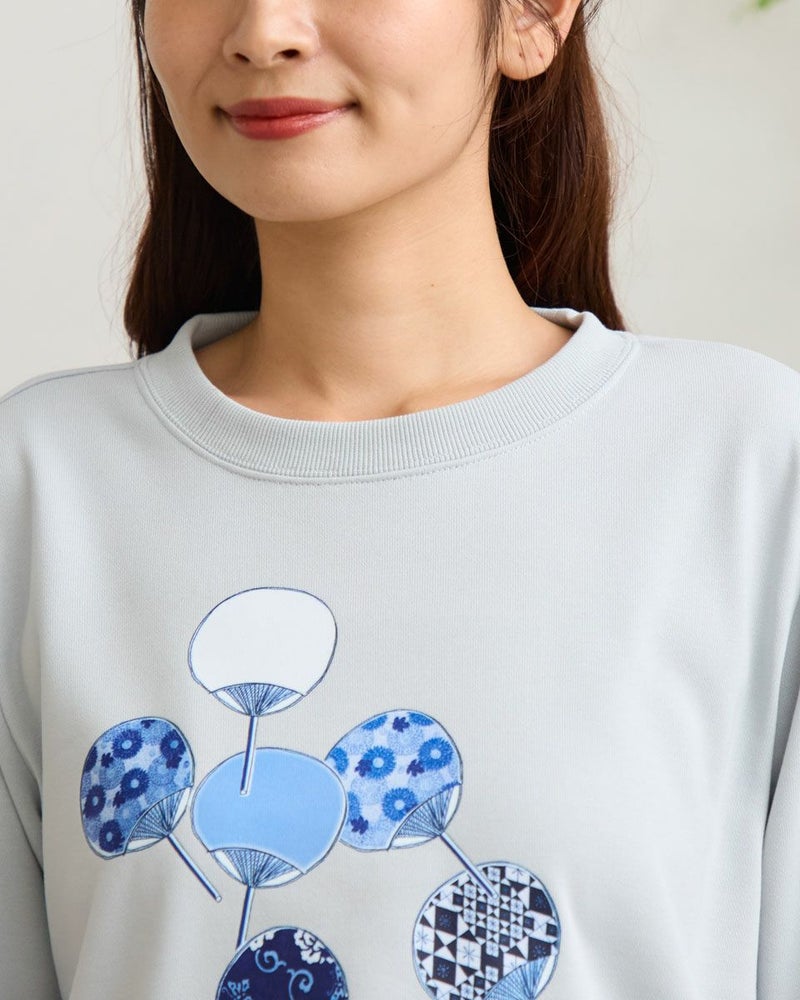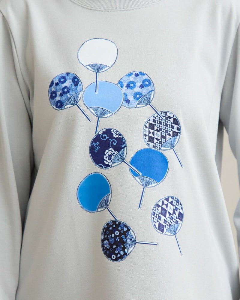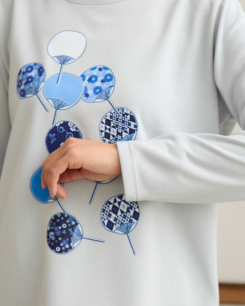 プリントのデザインには、榛原さんが取り扱う伝統的な柄をあしらったうちわを流れるように散りばめました。色数を抑えつつ、それぞれの柄が際立つよう、何度もやり取りさせていただきながら完成したこだわりのデザインです。