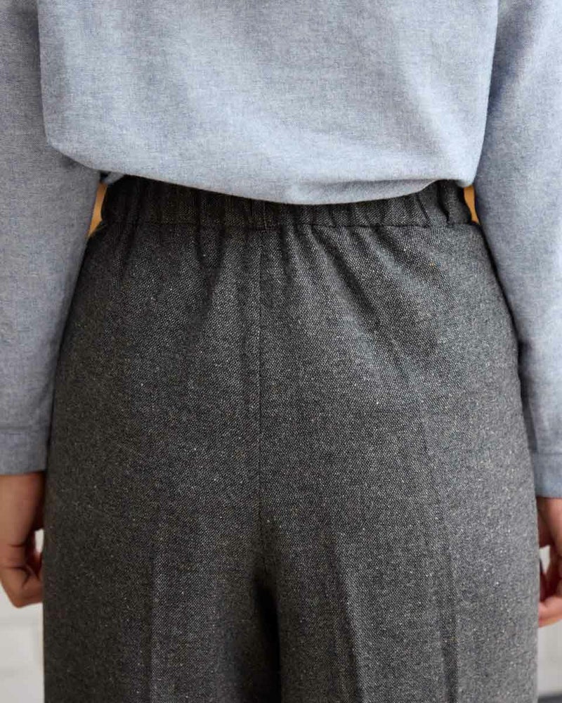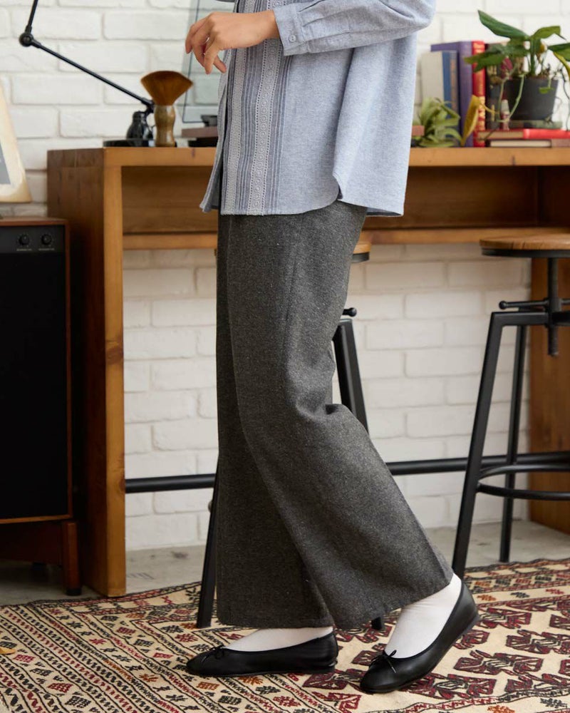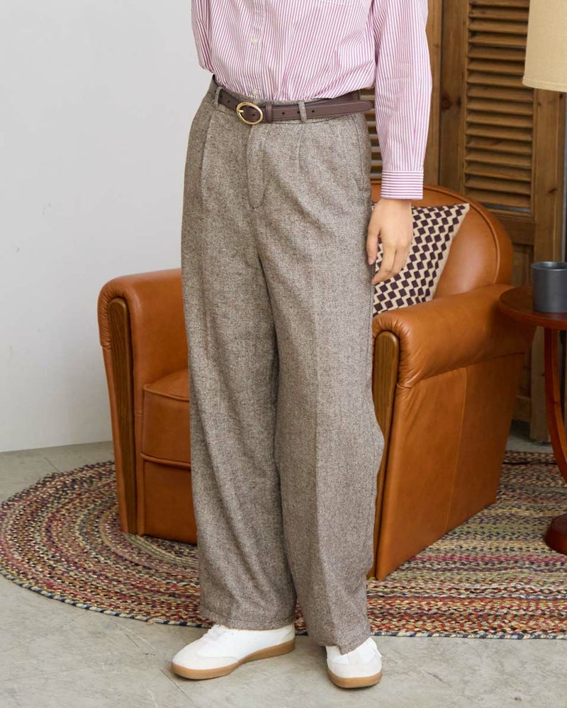 ウール混のネップツイードを使用した裏地付きストレートパンツです。折山プレスを入れキレイ目に仕上げました。後ろウエスト部分にギャザーゴムを入れはきやすいような仕様にしています。 モデル身長: 168 cm 着用サイズ: 61 サイズ Golden Bear WOMEN ボトムス (WOMEN) 【着用アイテム】467RE302 ピンタックレースシャツ 467RE303 ストライプシャツ 467RE631 クマロゴニット 467RD133 スーパーソフトダウンジャケット