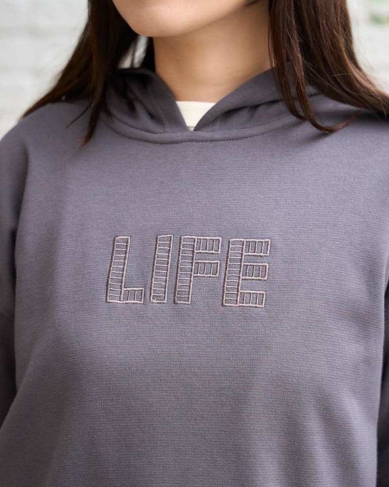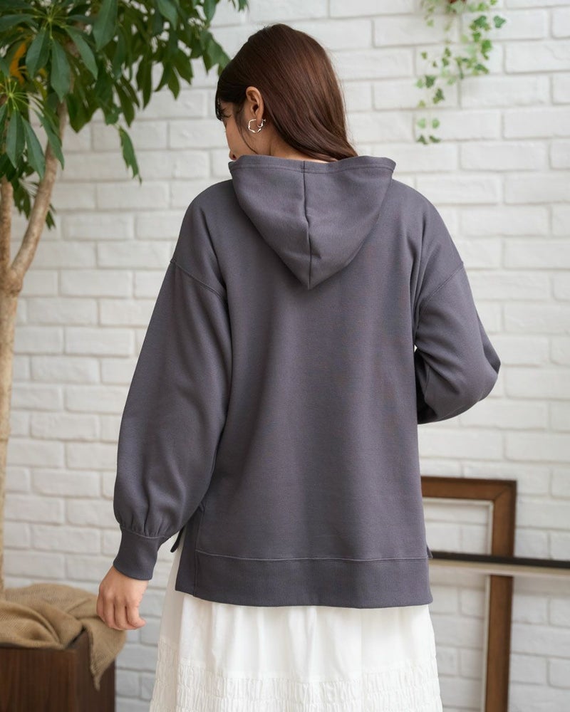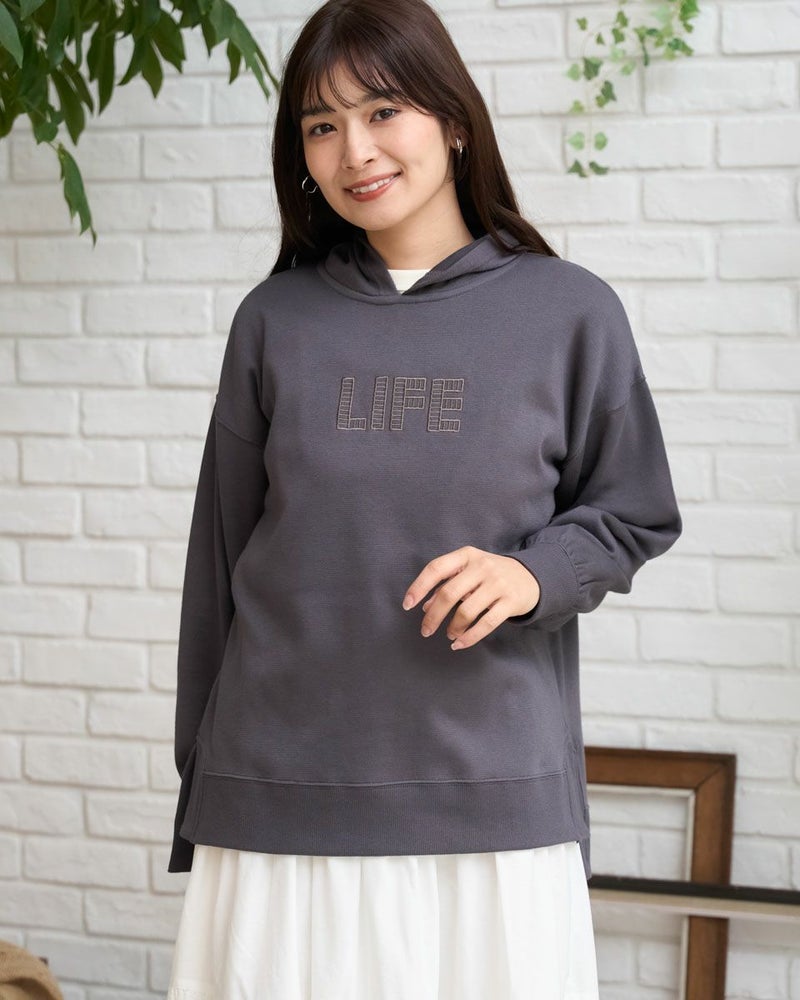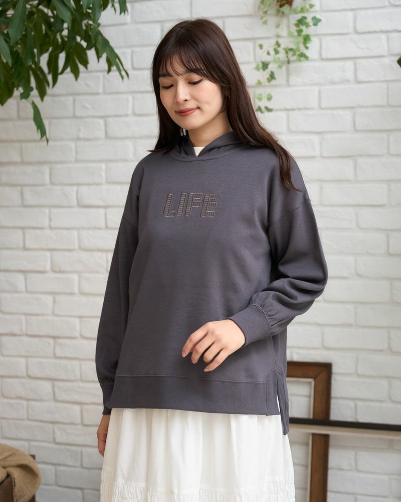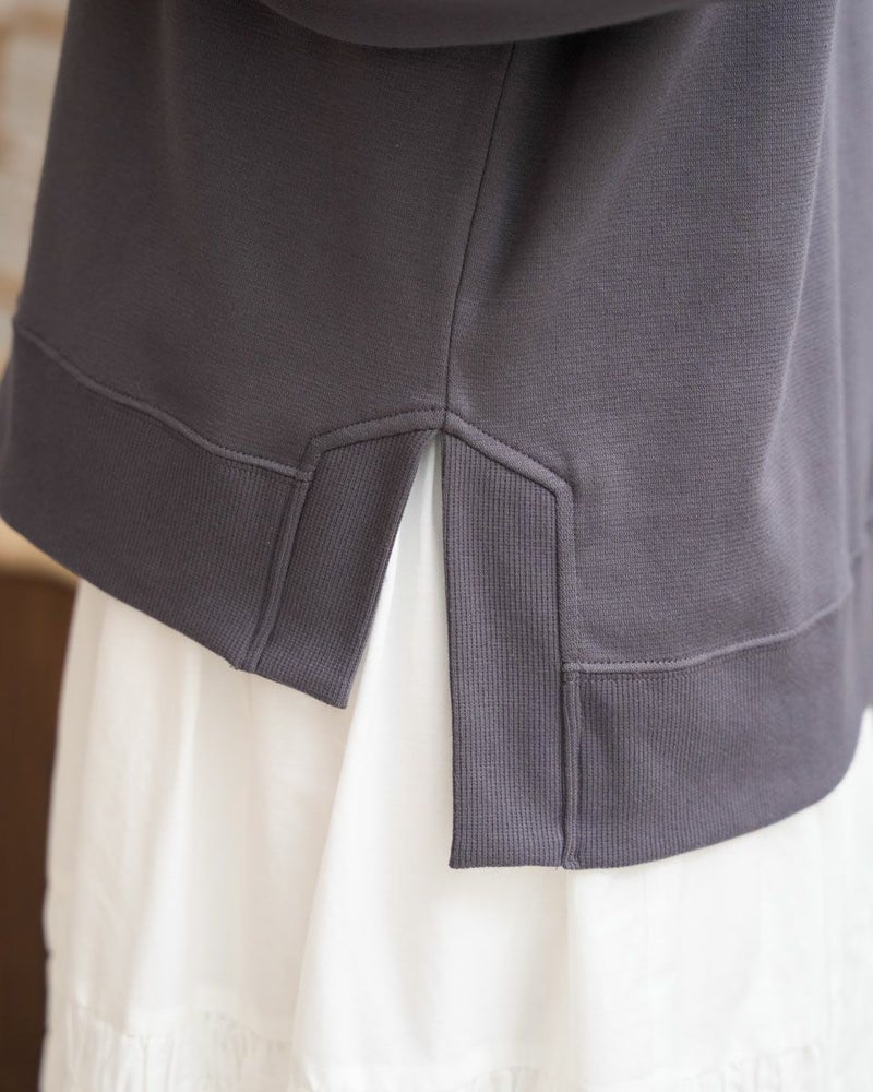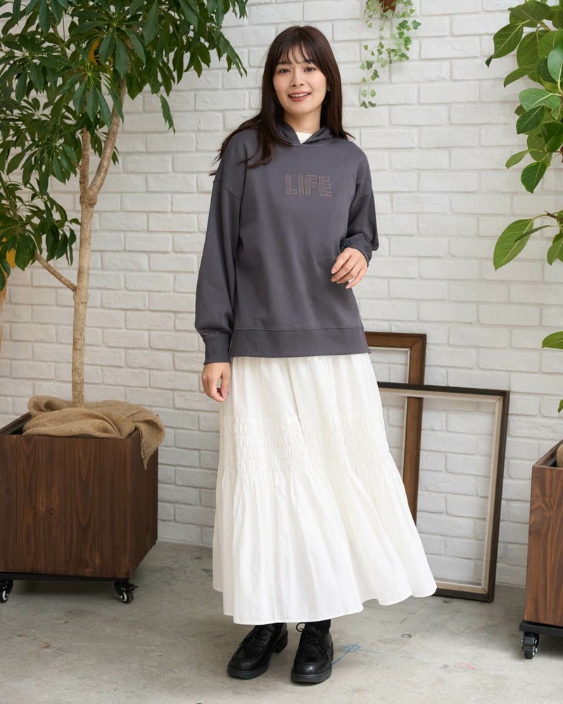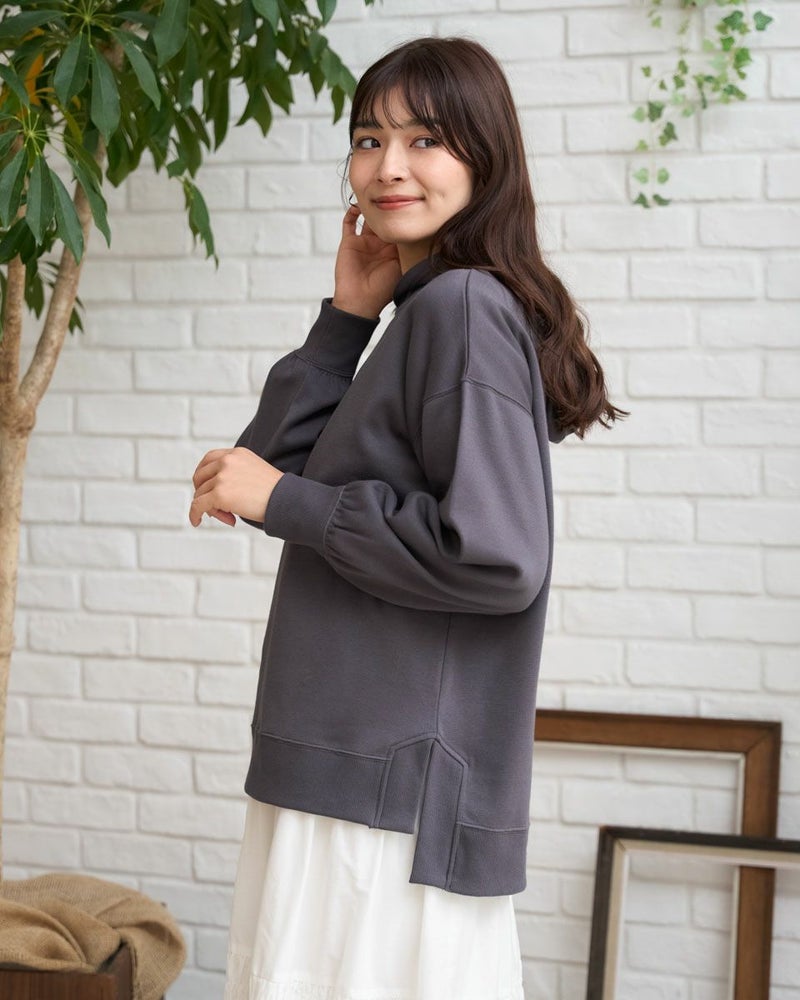 裾のリブスリットデザインがアクセントになったロングフーディ。胸元のさりげない刺繍がポイントです。綿混の軽いポンチ素材を使用して、動きやすく快適な着心地です。 モデル身長: 168 cm 着用サイズ: M サイズ Golden Bear WOMEN カットソー (WOMEN) 【着用アイテム】467U2402 オーガニックコットン長袖Tシャツ 467U2404 ミニ裏毛ジャケット 467U2703 シャーリングスカート 467U2731 超ストレッチパンツ 467RD002 キルトショルダーバッグ