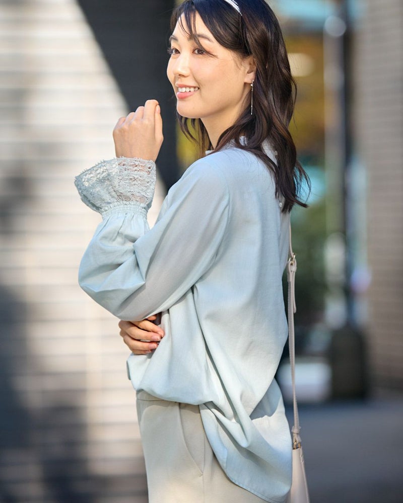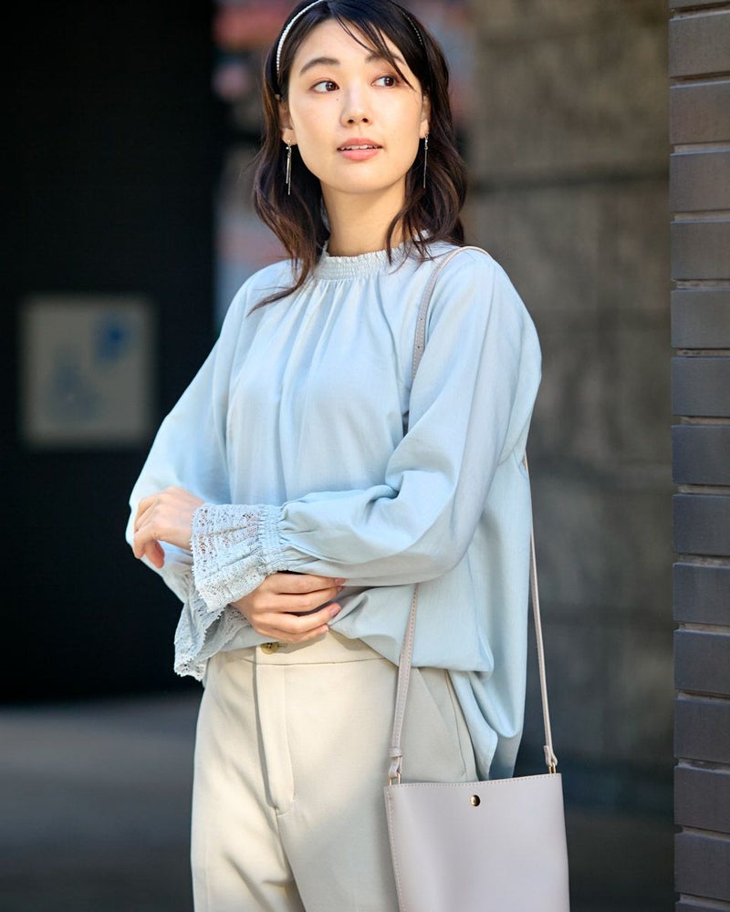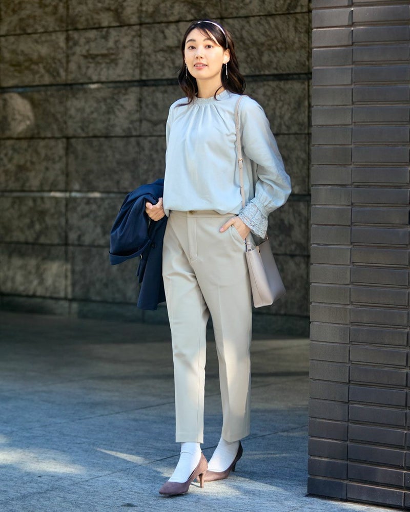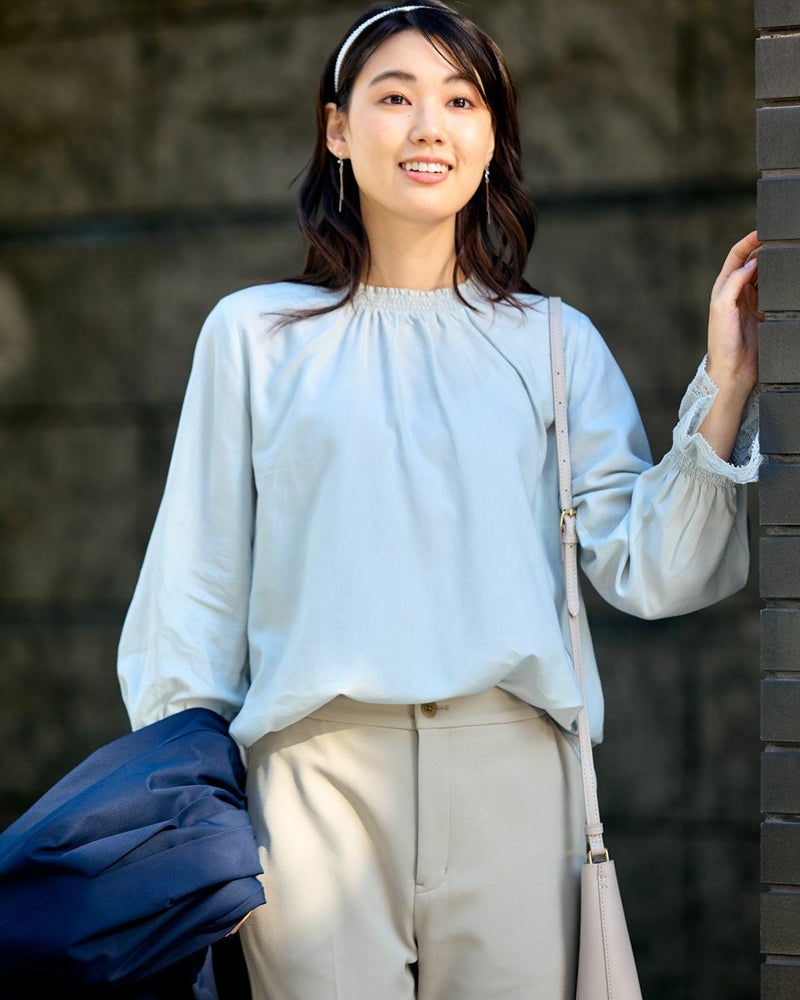 細かくツイルに織られた生地は、ほのかに光沢もありナチュラルすぎないところが魅力。滑らかですが身体のラインを拾いすぎないソフトタッチな被りのブラウス。少し立ち上げた襟と袖口に施したシャーリングで生地に立体感が足され華やかさも一緒に纏えるアイテム。ジャケットやカーディガンとの相性も良く、オフィス使いにおすすめ。優しい春カラーでパールを添えて謝恩会など親しい方とのパーティでお召しになっても素敵です。 モデル身長: 166 cm 着用サイズ: M サイズ Golden Bear White Label (WOMEN) ブラウス (WOMEN) 【着用アイテム】468R1150 ショートトレンチコート 468R1750 ストレートパンツ 468R2750 テーパードパンツ