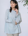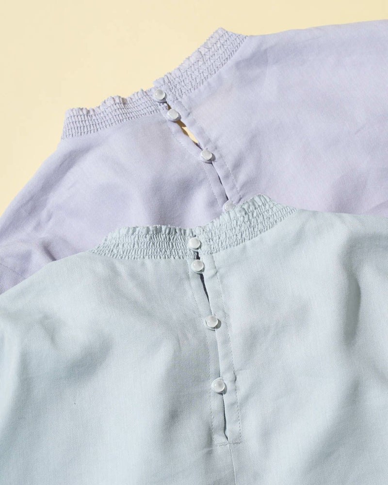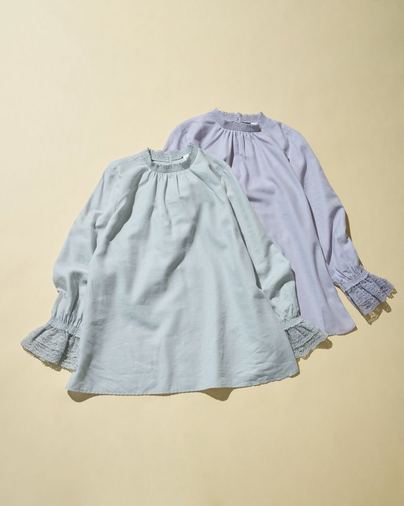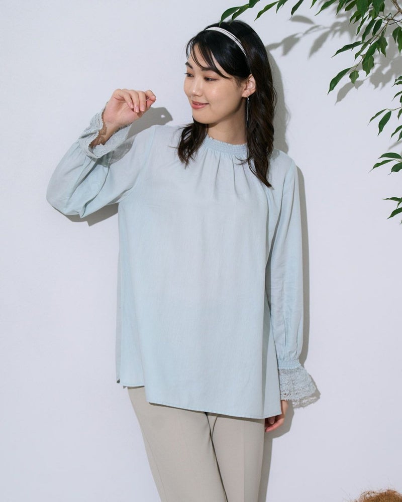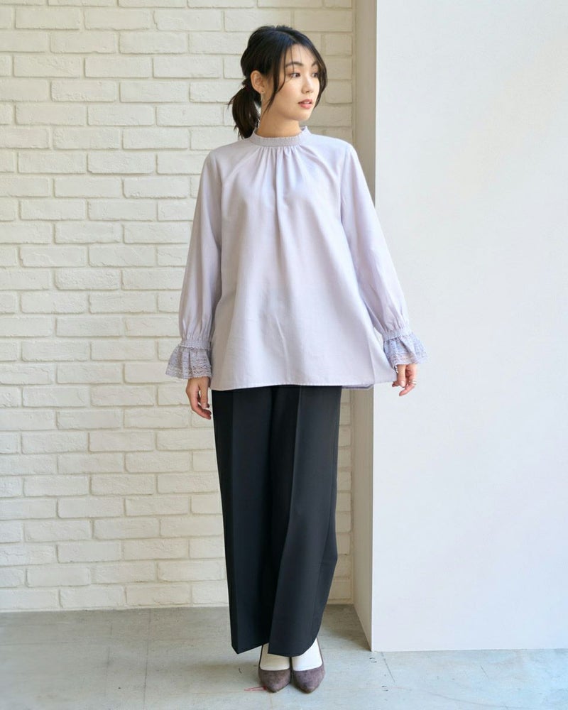 細かくツイルに織られた生地は、ほのかに光沢もありナチュラルすぎないところが魅力。滑らかですが身体のラインを拾いすぎないソフトタッチな被りのブラウス。少し立ち上げた襟と袖口に施したシャーリングで生地に立体感が足され華やかさも一緒に纏えるアイテム。ジャケットやカーディガンとの相性も良く、オフィス使いにおすすめ。優しい春カラーでパールを添えて謝恩会など親しい方とのパーティでお召しになっても素敵です。 モデル身長: 166 cm 着用サイズ: M サイズ Golden Bear White Label (WOMEN) ブラウス (WOMEN) 【着用アイテム】468R1150 ショートトレンチコート 468R1750 ストレートパンツ 468R2750 テーパードパンツ