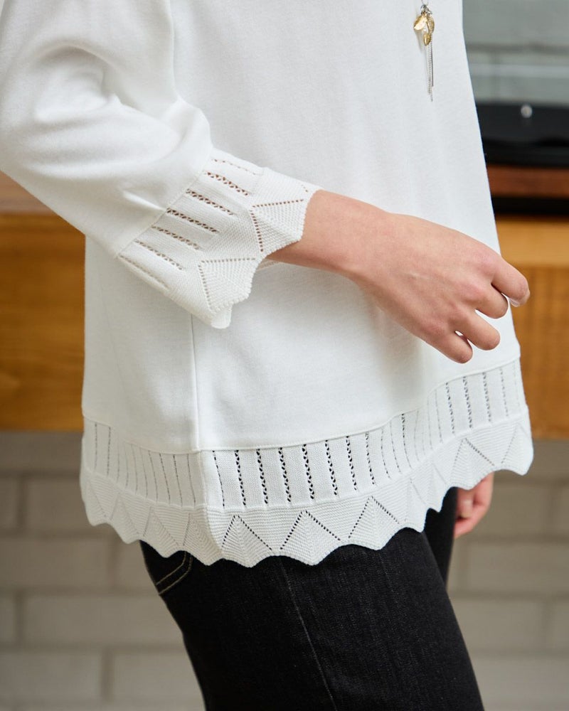 表裏ともにキメが整った編み地でキレイ見えするスムースを使用。ソフトで肌馴染みも良くホームケアが簡単な所も魅力です。袖口と裾にあしらった透かし柄のニットが上品なアイテムです。透かし部分から肌がのぞく様子や、スカラップの柔らかいラインが手元を美しく飾ります。ジャストな肩幅設定でブルゾンやカーディガンとの重ね着もスムーズ。フラットに仕上げた襟元にネックレスを添えた着こなしも素敵です。 モデル身長: 167 cm 着用サイズ: M サイズ Golden Bear White Label (WOMEN) カットソー (WOMEN) 【着用アイテム】467R4331 GBチェックシャツ 467R4702 テーパードパンツ