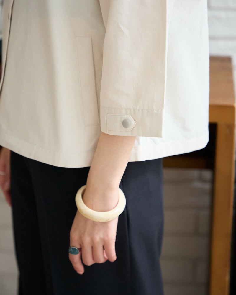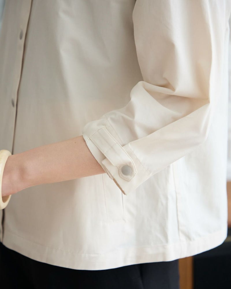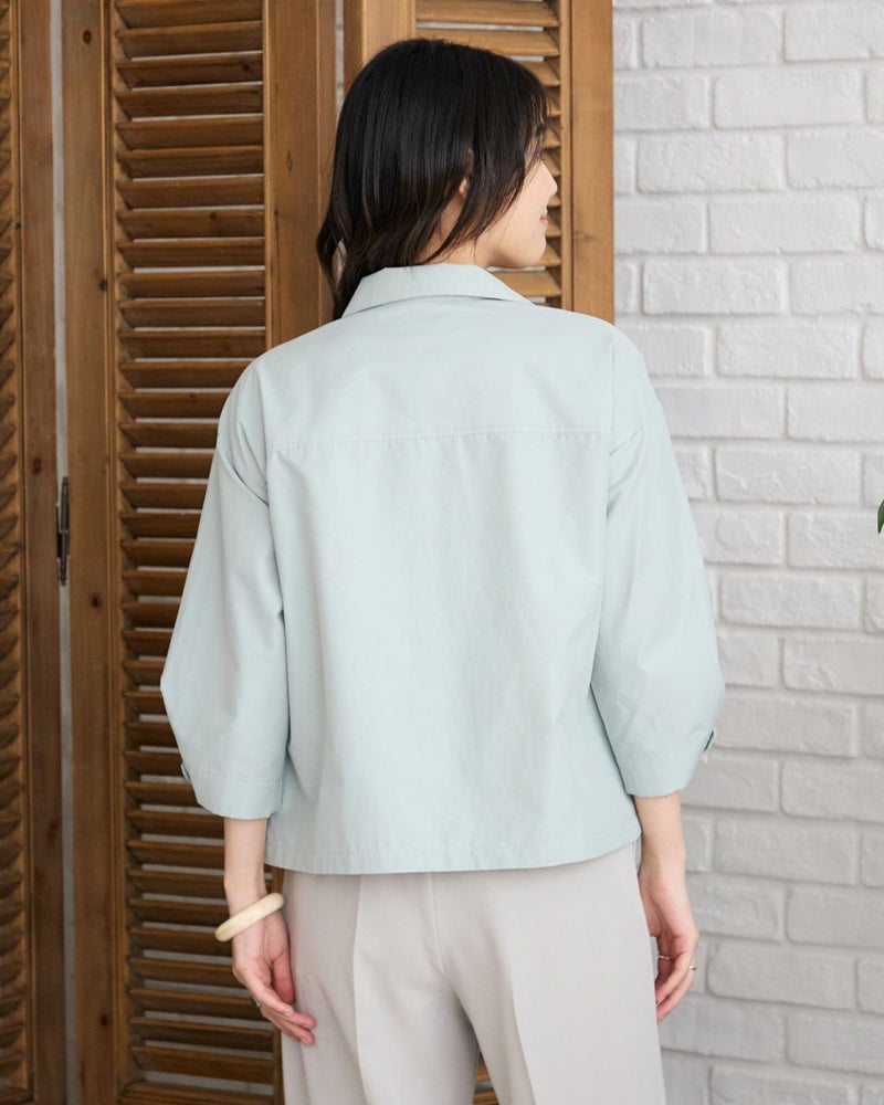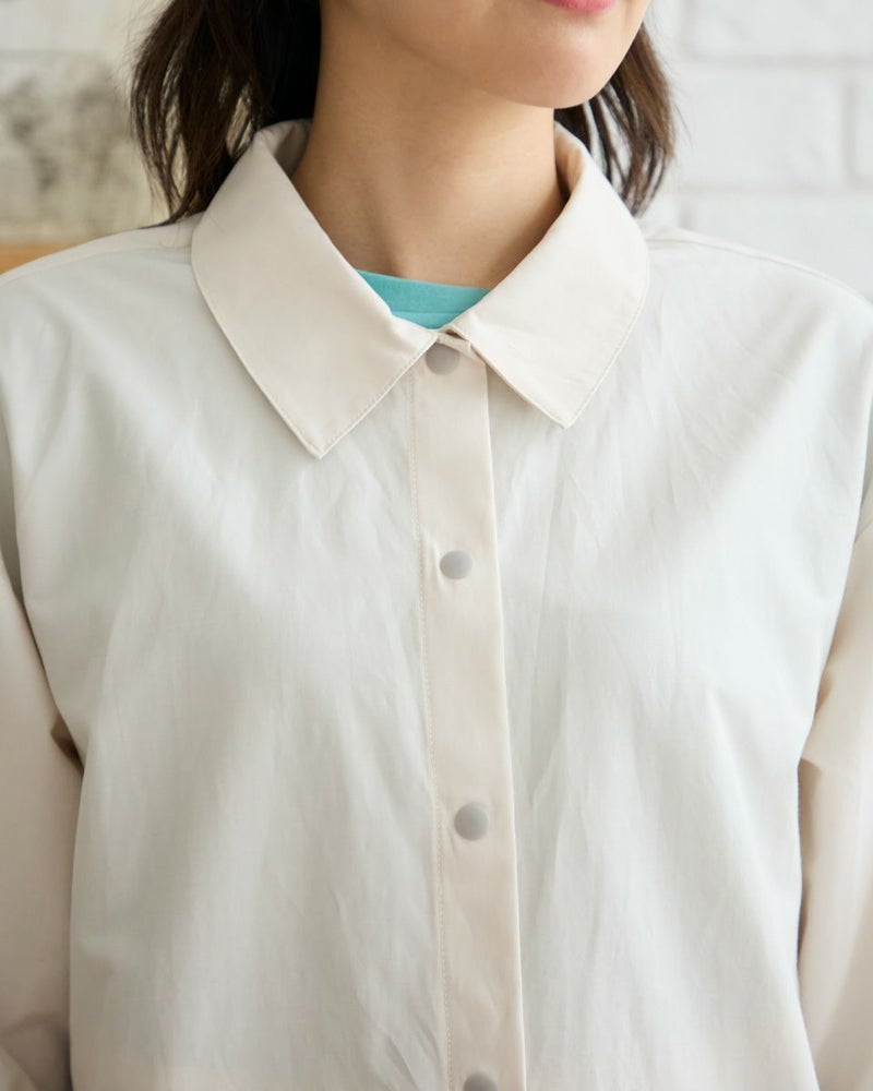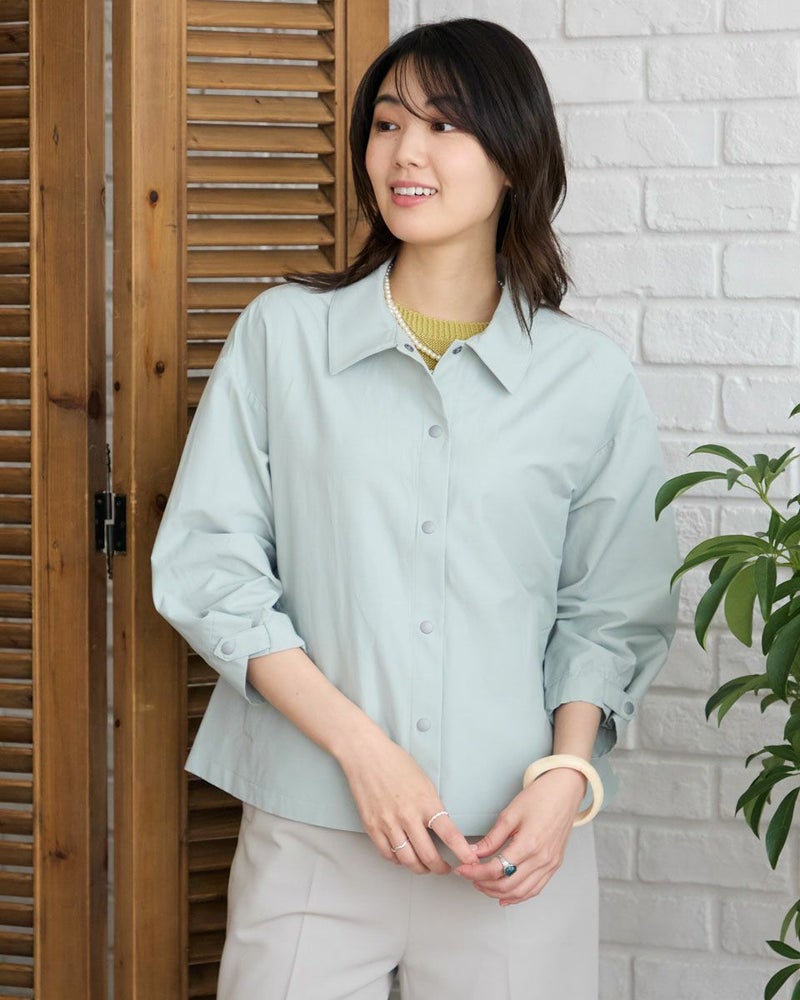 毎シーズン人気のシャツジャケット。サラッとした手触りで軽く、羽織るだけでコーデが決まる便利アイテム。今期は撥水の機能を加え、より日々の生活に寄り添う1着に。ほどよい張り感でボックス調のシルエットを保ち身体に付かず離れず涼しくお召しいただけます。トレンドに合わせショート丈に設定しているためスカートや太めのパンツとの相性も抜群。襟付きなので砕けた印象が薄れオフィスや学校行事での着用も可能です。 モデル身長: 166 cm 着用サイズ: M サイズ Golden Bear White Label (WOMEN) ブラウス (WOMEN) 【着用アイテム】467R4610 ホールガーメントベスト 468R4461 フレンチスリーブTシャツ 468R4760 サスペンダーパンツ