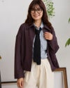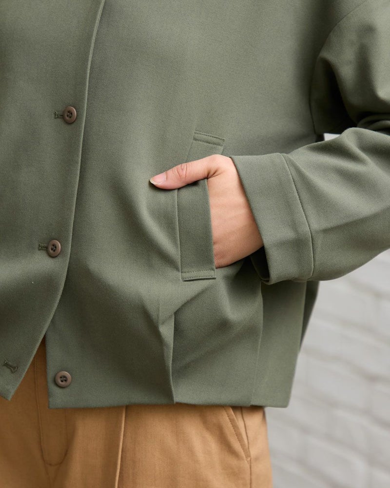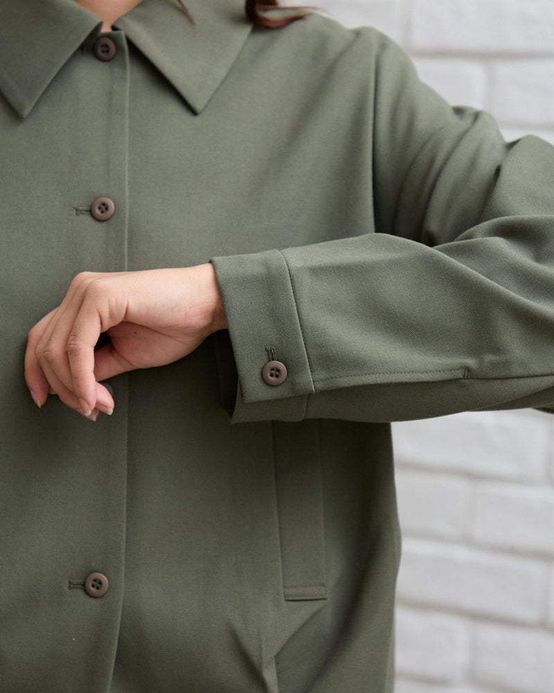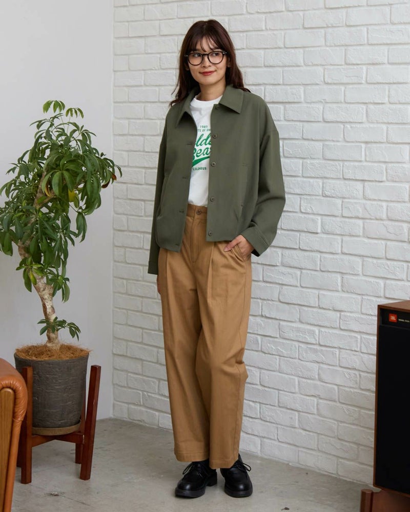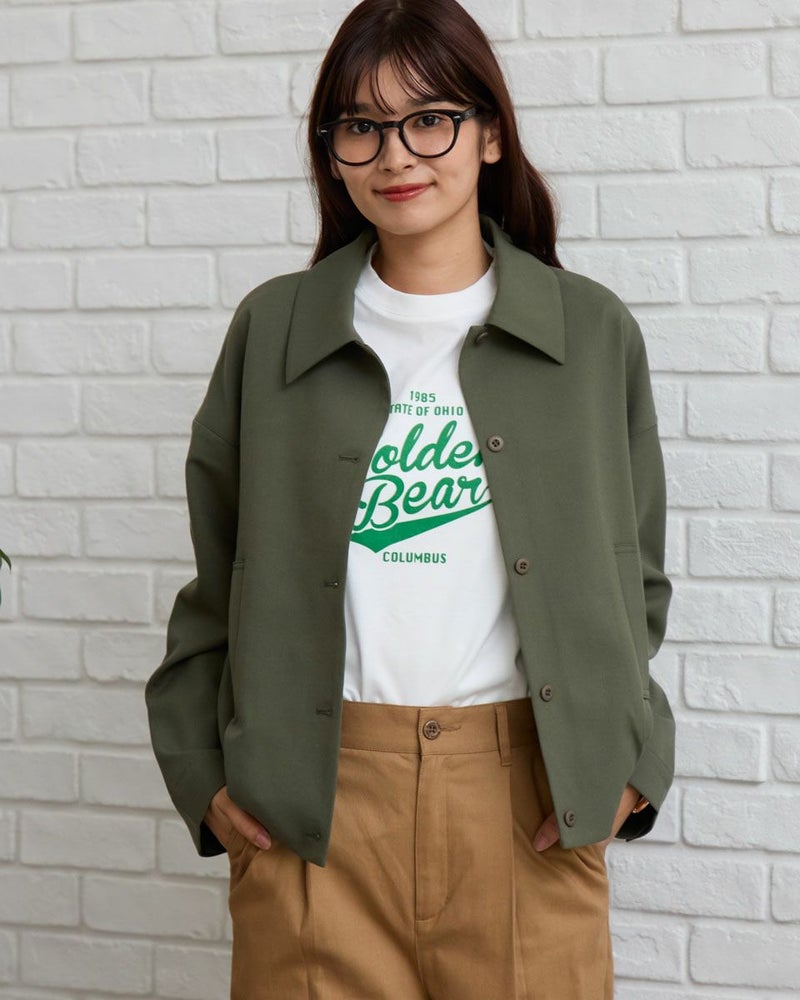 ほのかに光沢のあるツイルを使ったシャツジャケット。平織りに比べ糸の交差する点が少なく柔軟性に富んでいますが、適度にハリがあるためダレず清潔にお召しいただける1着。大きな襟先がチャーミングで顔周りに華やかさをプラス。潔く短くした着丈が幼さを消し、コーディネートのハズシに使える洒落たアイテムです。ロンTやサロペットに羽織るスタイルも素敵ですが、釦を閉じスラックスやバレル型のボトムスと合わせたメンズライクな着こなしも裾のタックが利きおすすめ。秋冬シーズンは、リップやレザー小物でツヤを加えたワーキングウーマンのようなスタイリングもお試しください。