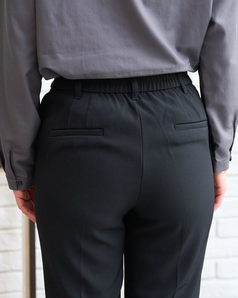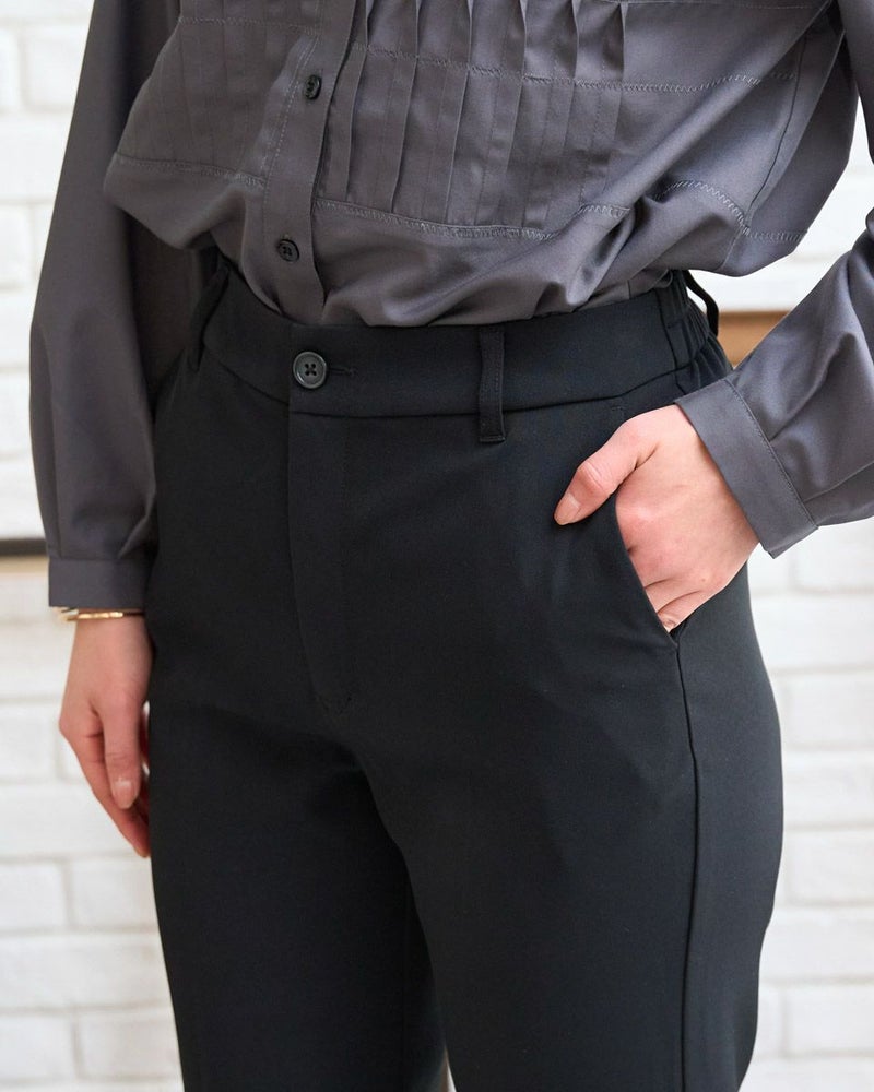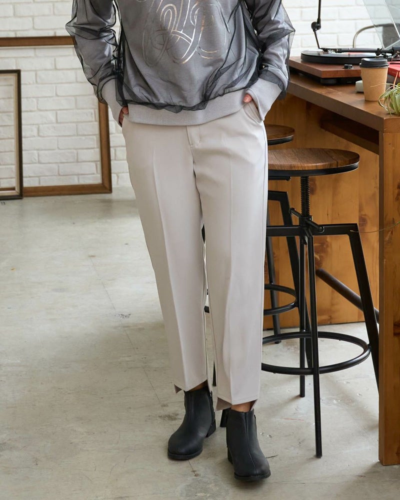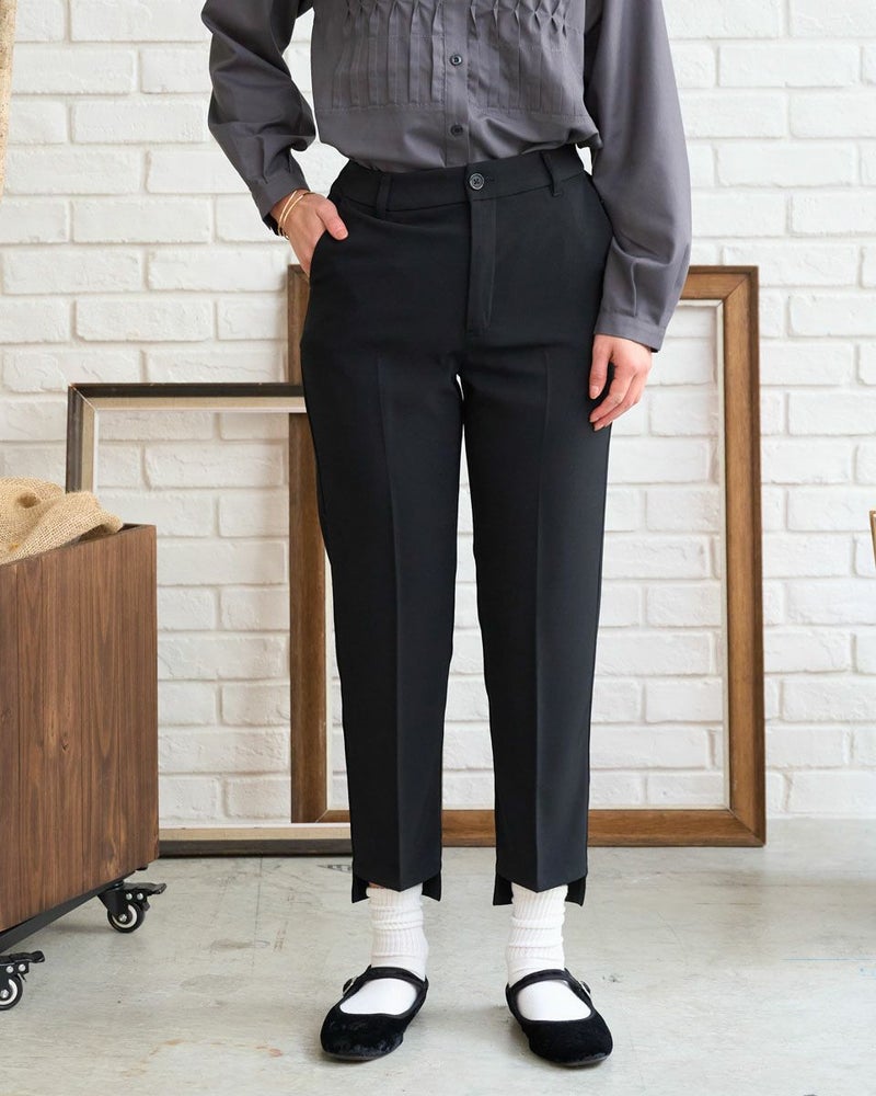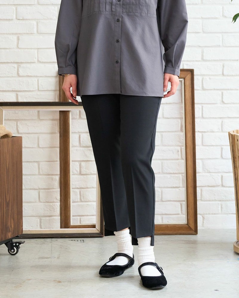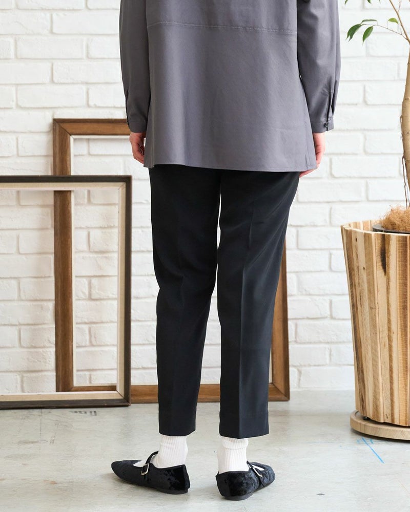ほのかな光沢と細かいツイルの織り目が新しい季節を感じるテーパードパンツ。細みのシルエットとクリアな生地が醸し出す『素敵なお姉さん』感はダントツです。後ろ裾に比べ前の裾を4㎝ほど短くしたリズムのあるヘムは歩くたびに肌が覗き、裾が足元で溜まり過ぎ無いためアクティブで清潔感のある着こなしが可能です。意外にもシューズを選ばず足の甲がキレイに見えるパンプスの他、ヘルシーに決まるスニーカーもOK。フロントZIPのハンサムな仕様でオフィスや学校行事にお薦めです。スッキリとした筒幅はオーバーサイズのトップスとも相性抜群です。