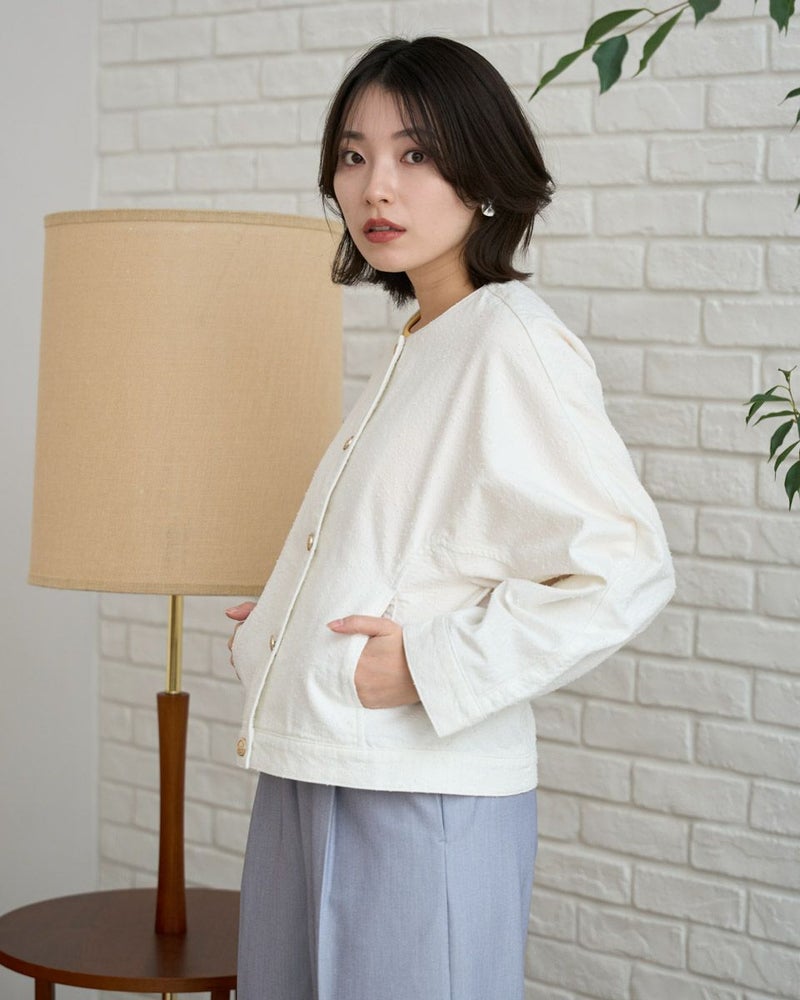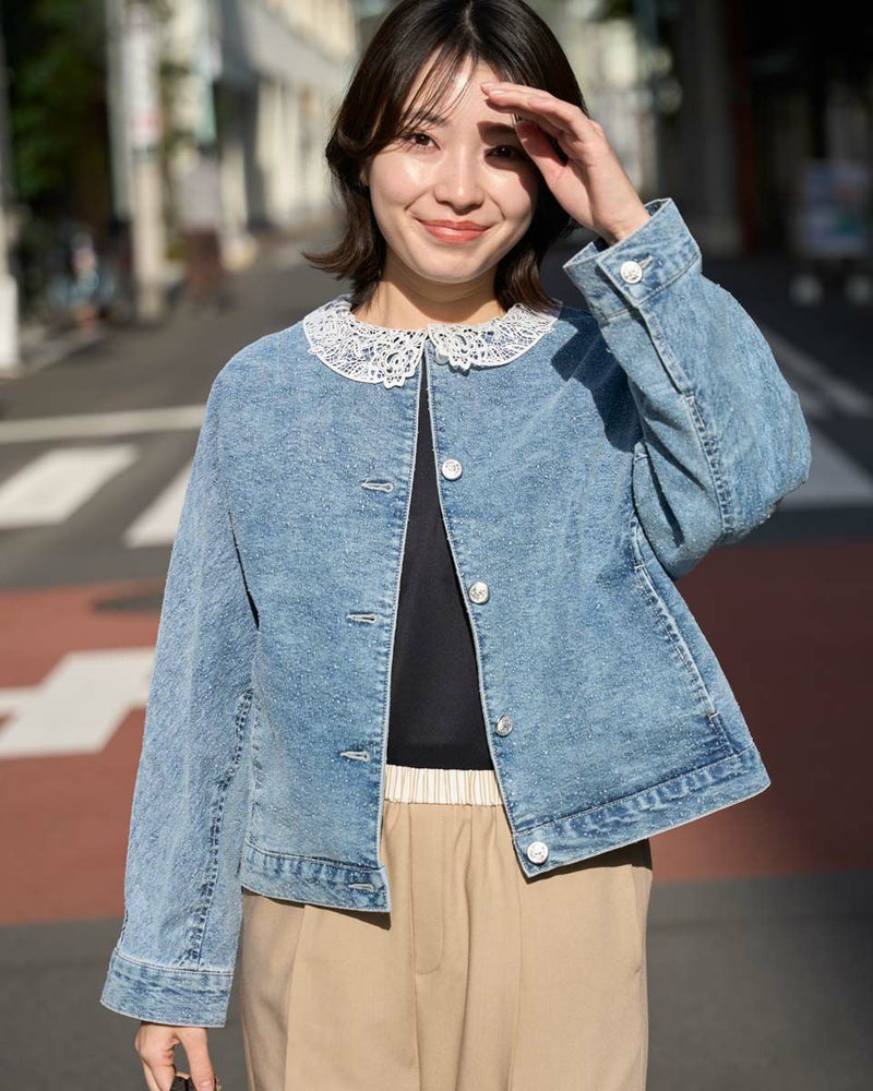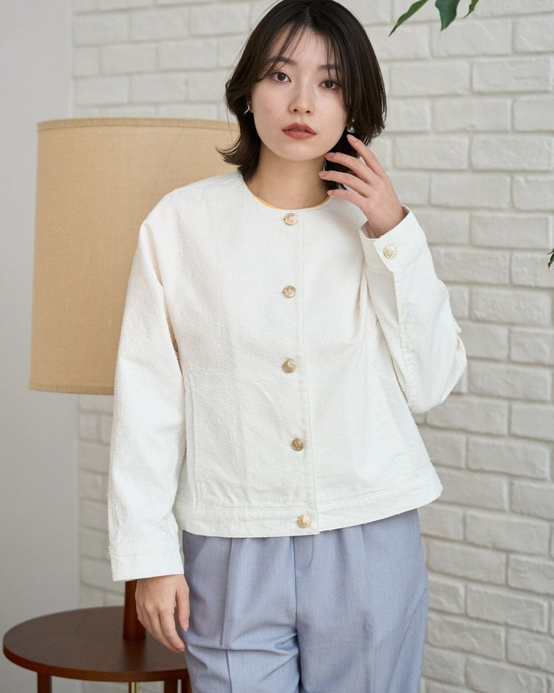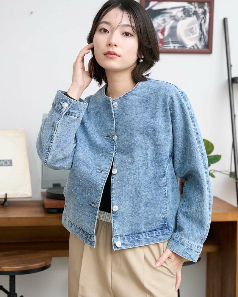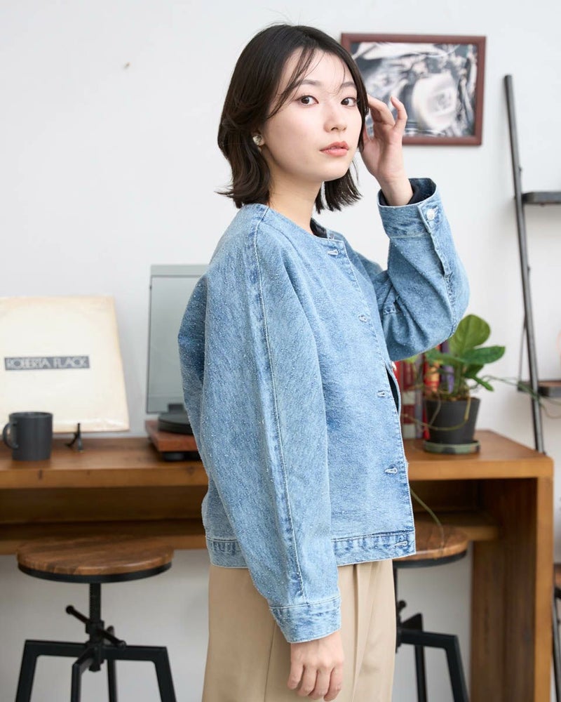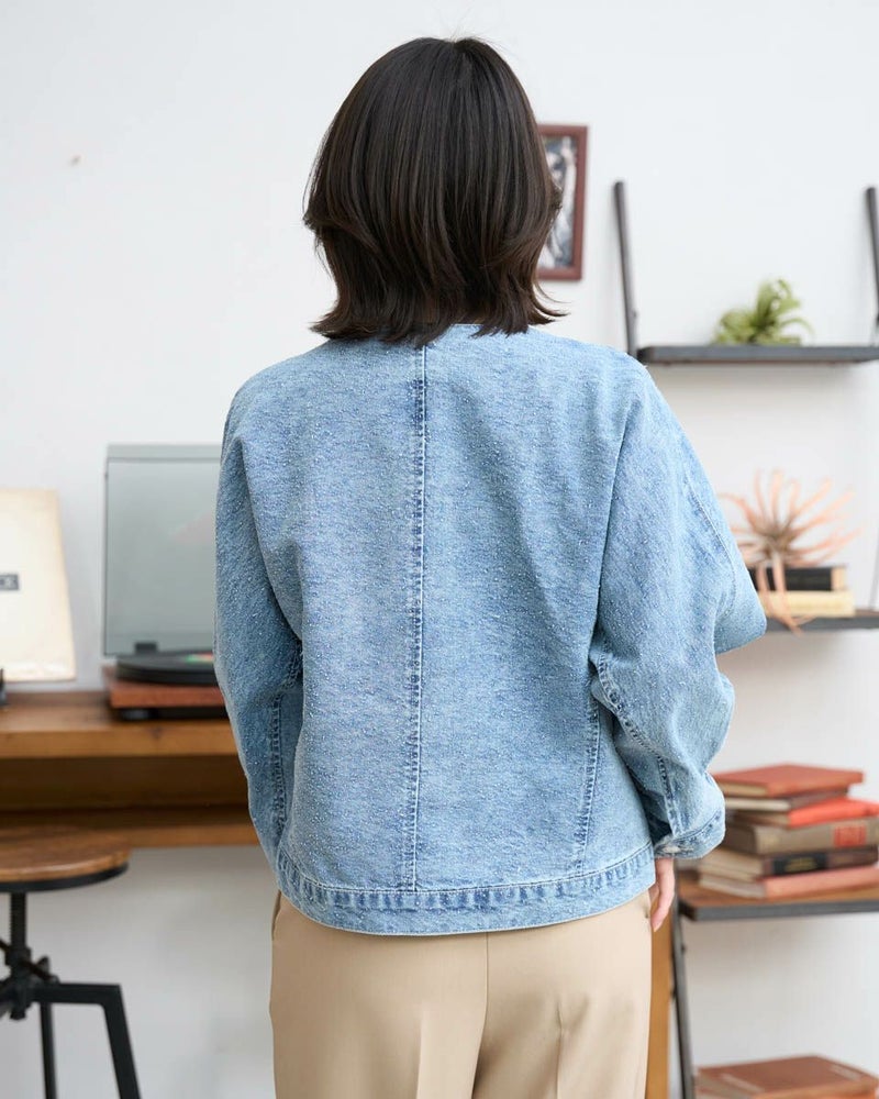 袖と身頃にゆとりのあるドルマンスリーブのデニムジャケット。程よい張りのある9.5オンスのデニムは構築的なシルエットを保ち袖下のたわみ感もお洒落。引っ掻いて表現したつぶつぶのネップにバイオ加工やケミカルウォッシュ加工を施し、独特の色ムラや着込まれたビンテージ感が吹き込まれたボディは圧巻。辛口でハードなテイストに施されたタイトなネックラインや、金ボタンの凛とした佇まいも魅力です。ボトムスはキレイめなスラックスやスカートとのミックスコーデがおススメ。手仕事による技の結晶をお楽しみください。