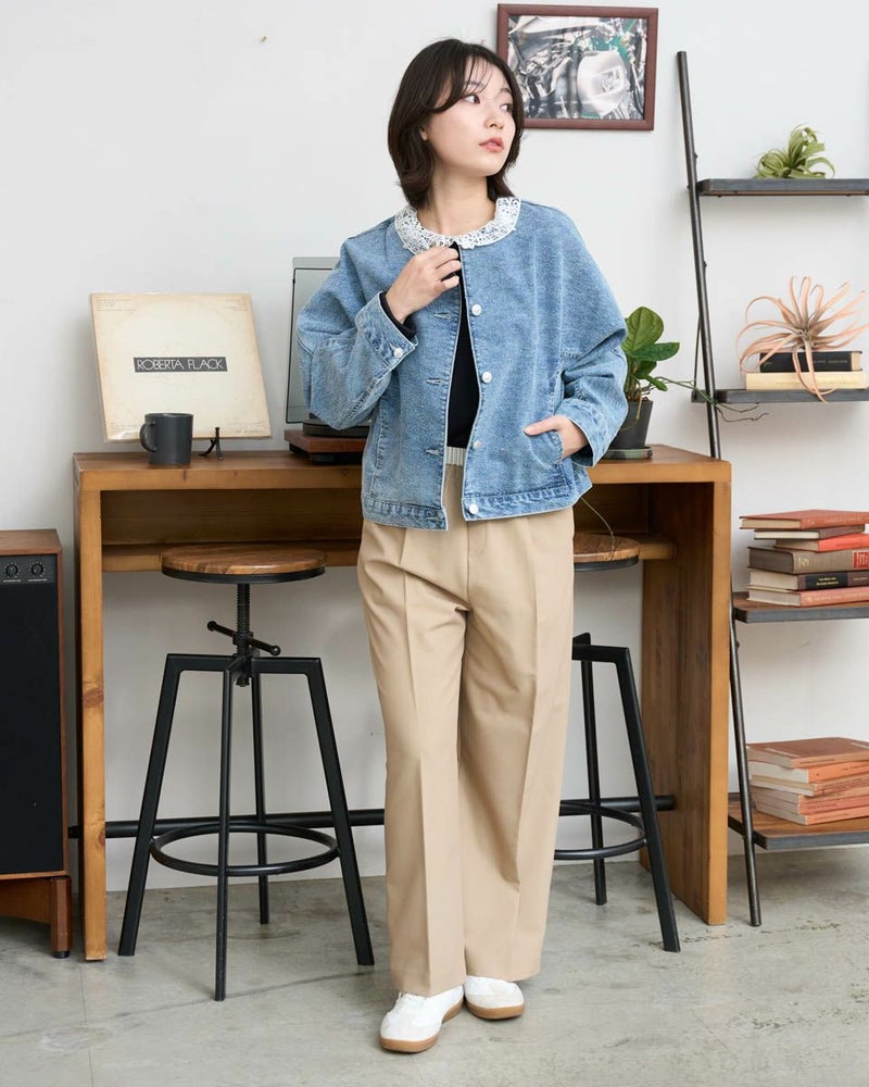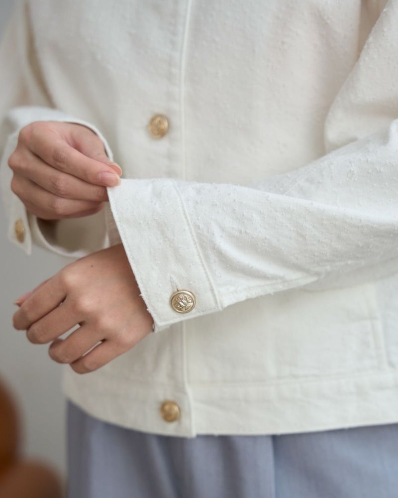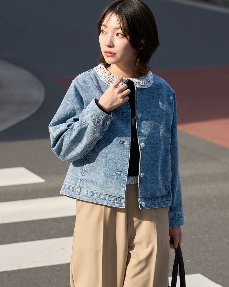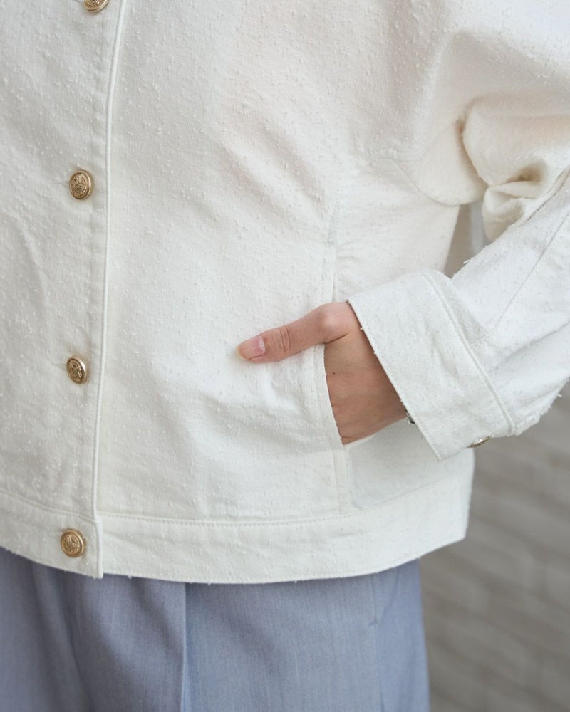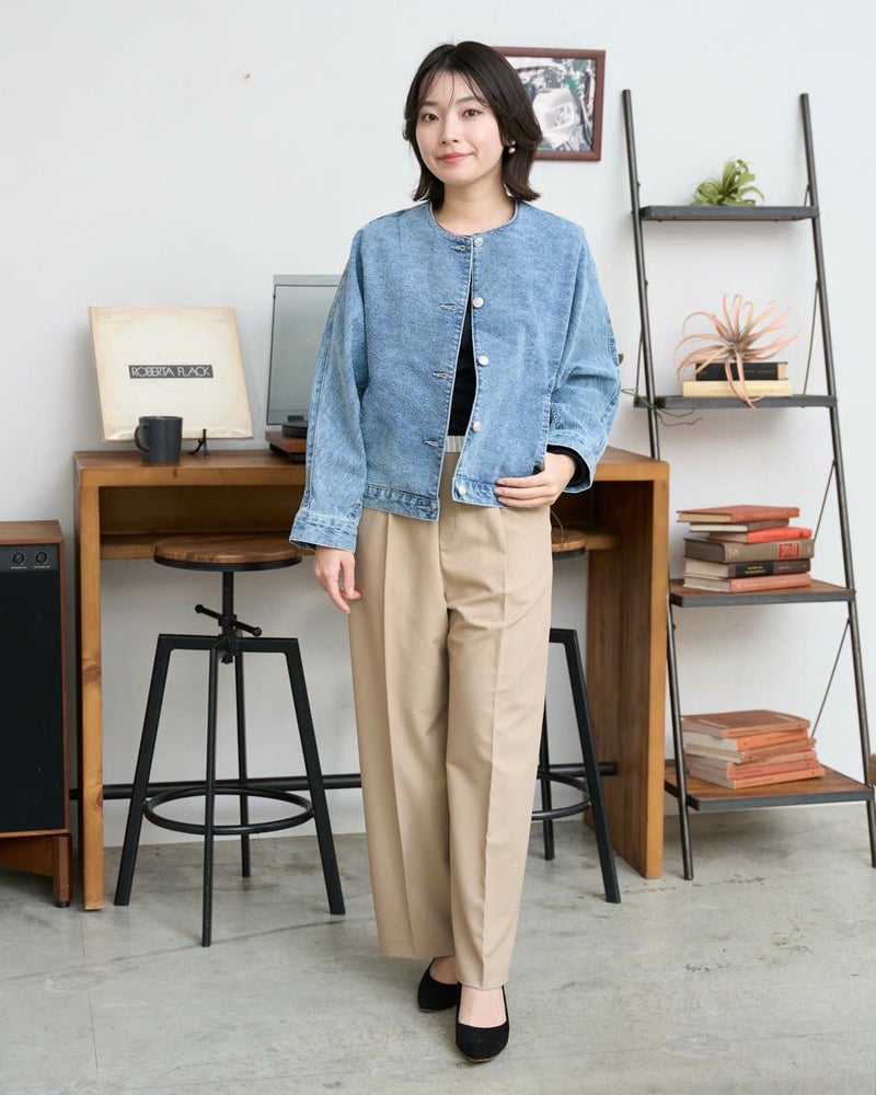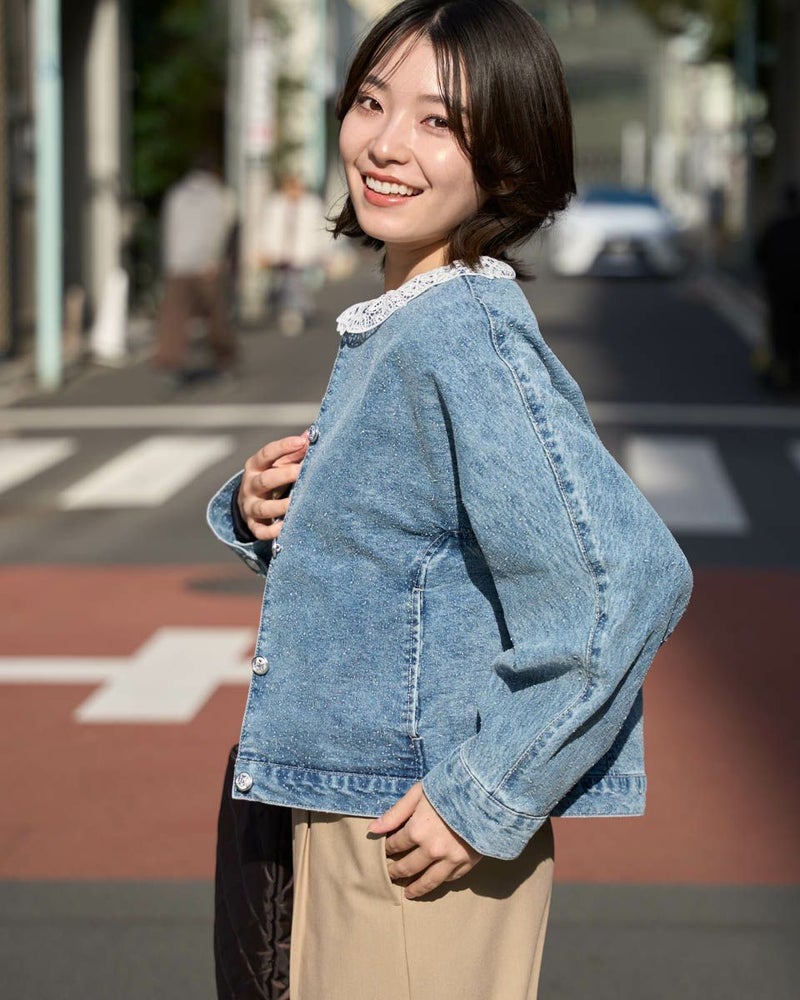 袖と身頃にゆとりのあるドルマンスリーブのデニムジャケット。程よい張りのある9.5オンスのデニムは構築的なシルエットを保ち袖下のたわみ感もお洒落。引っ掻いて表現したつぶつぶのネップにバイオ加工やケミカルウォッシュ加工を施し、独特の色ムラや着込まれたビンテージ感が吹き込まれたボディは圧巻。辛口でハードなテイストに施されたタイトなネックラインや、金ボタンの凛とした佇まいも魅力です。ボトムスはキレイめなスラックスやスカートとのミックスコーデがおススメ。手仕事による技の結晶をお楽しみください。