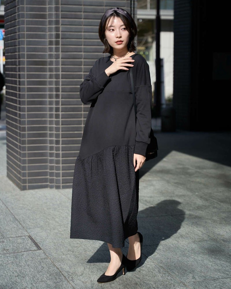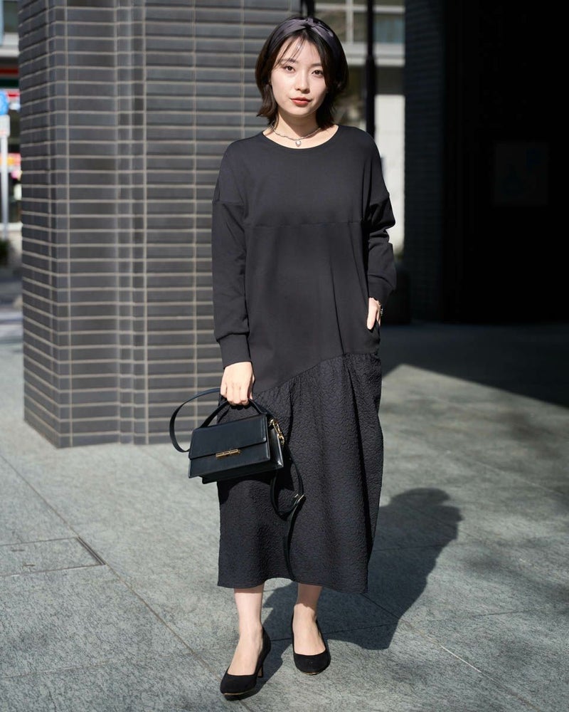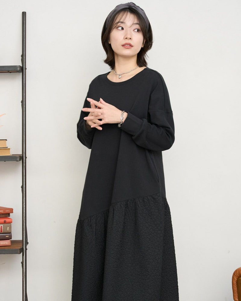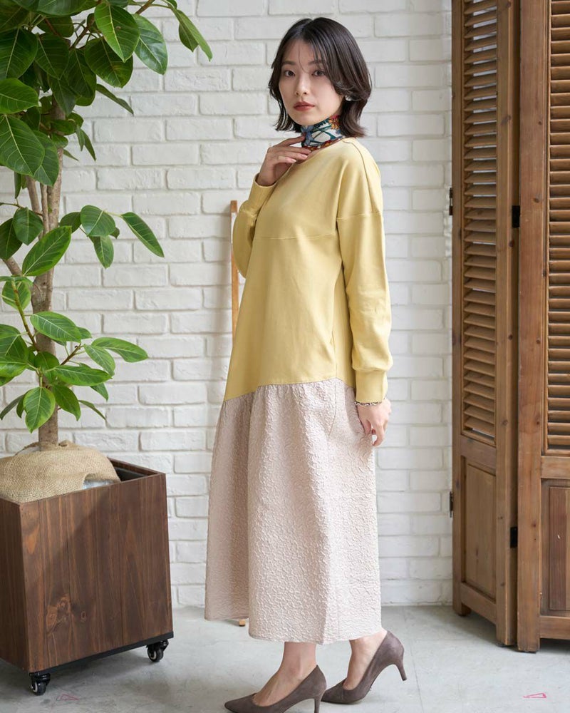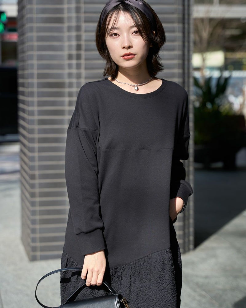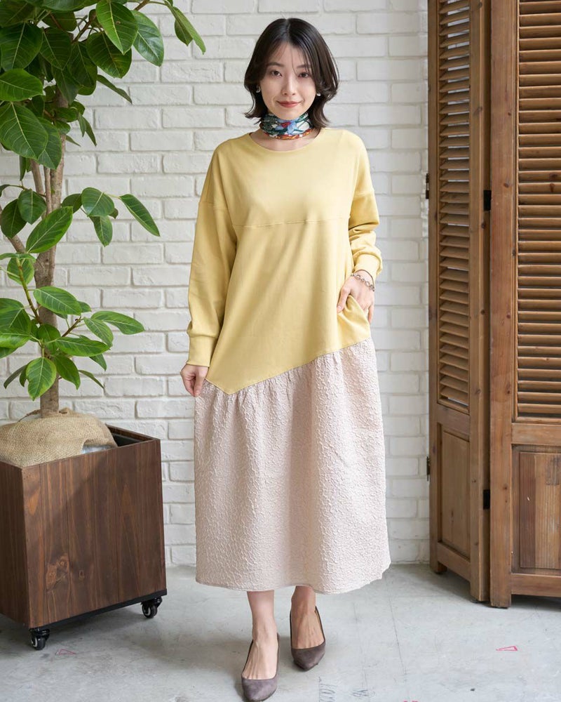 表裏ともにキメの整ったスムースに、ふくらみのある凹凸が映える膨れ織り調の素材を組み合わせた、表情豊かなワンピースです。ロンTよりも手持ち感のあるスムースのボディは、程よくゆとりがあり丸みのある優しい切り替えもポイント。気温に応じてシアーインナーや短丈の羽織りでアレンジしても◎重く単調に見えやすいスカート部分には斜めの切り替えでリズムを付け、フワッと軽く見えるようにしています。華やかな中にも形の定まらない膨らみの凹凸でダークさも兼ね備えた1着。フェミニンとモード、小物をチェンジして異なるスタイルをお楽しみください。便利なポケット付きです。