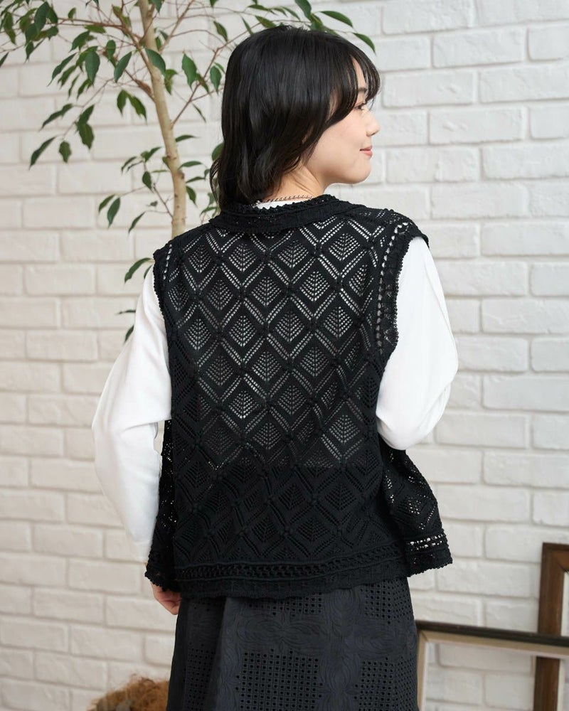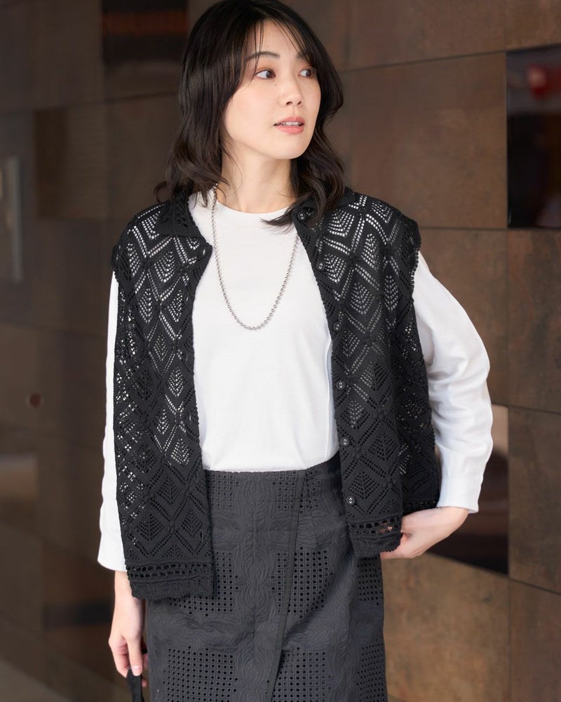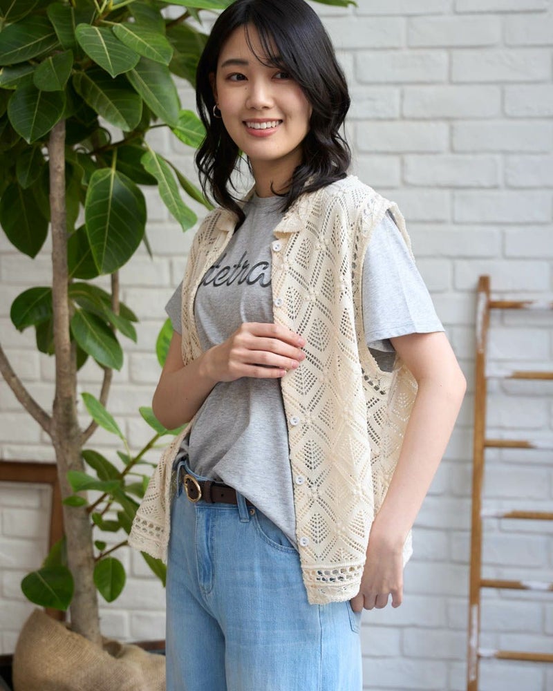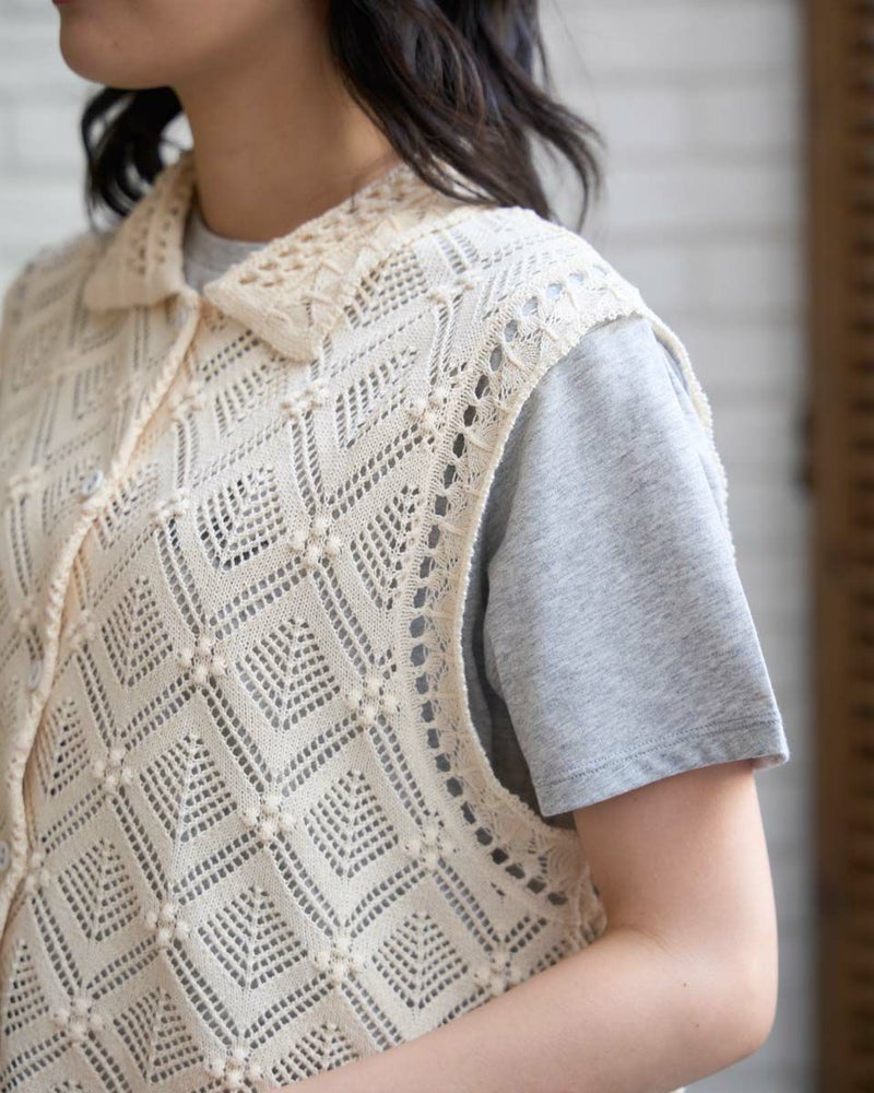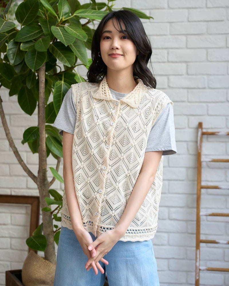 7cmほどのダイヤモチーフで構成された透かし編みのニットジレ。ドライで軽いタッチのストレート糸から繰り出される大胆な透けと繊細な編み目が印象的なアイテム。襟や裾のスカラップやダイヤの間にあしらわれた小さな丸いポンポン飾りなど甘さの効いたクラフト感も魅力です。襟が醸す品の良さもポイント。パールやレザー小物とも相性が良く半袖Tシャツや、ノースリーブに羽織り、スラックスと合わせたオフィススタイルもお洒落で素敵です。ニュートラルカラーで合わせやすく、チノパンや楊柳のワンピース、カゴバックなど多国籍のクラフトミックスもおススメです。 モデル身長: 166 cm 着用サイズ: M サイズ Golden Bear White Label (WOMEN) ニット (WOMEN) 【着用アイテム】468U3451 メローカットソー 468U3461 ロゴTシャツ 468U3750 レーススカート
