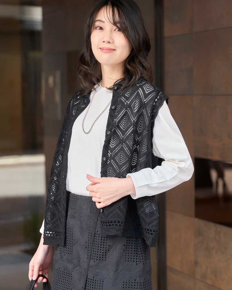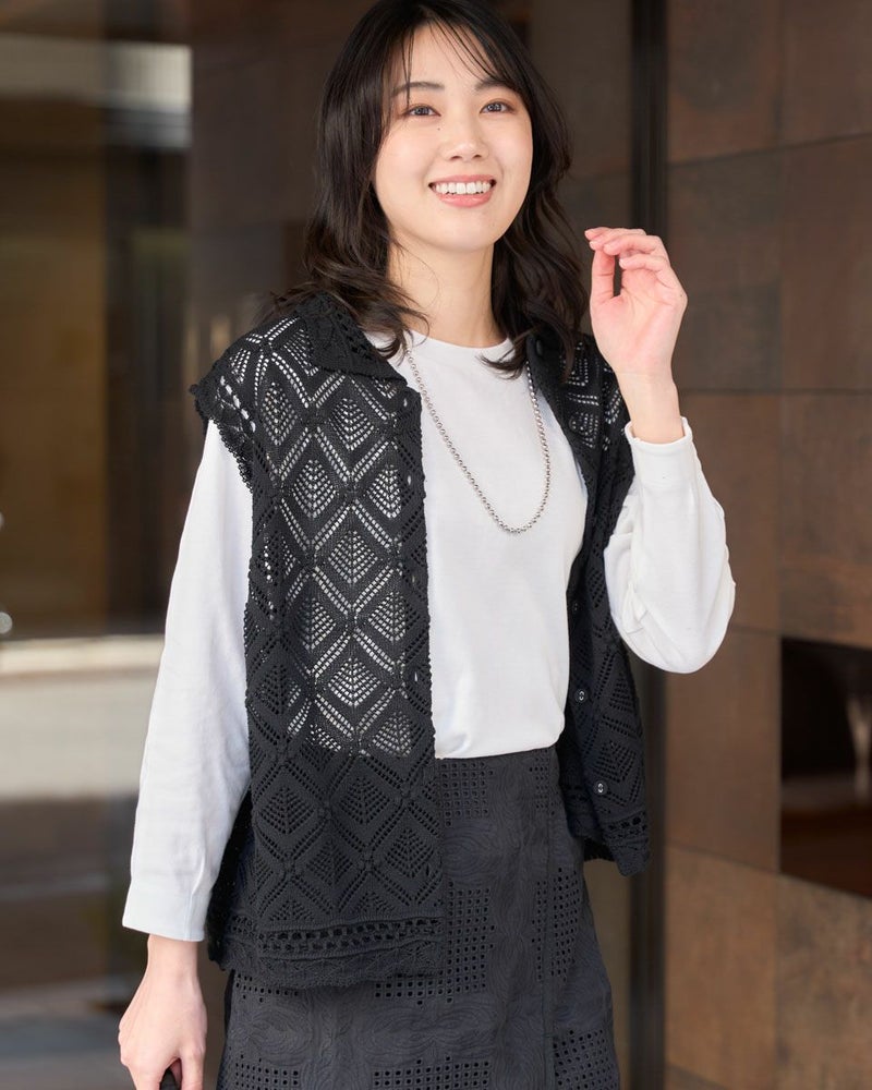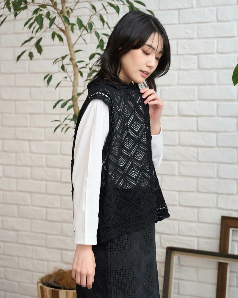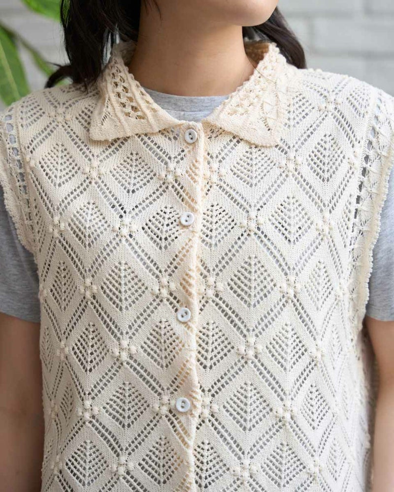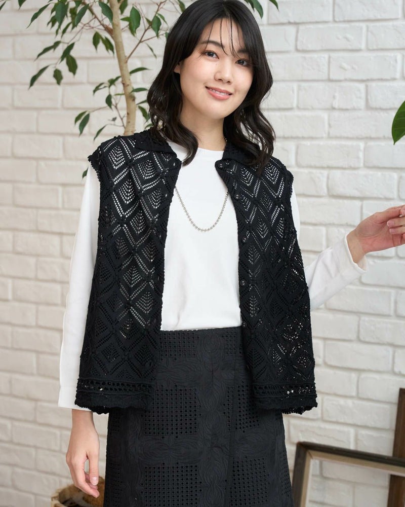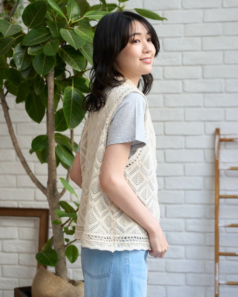 7cmほどのダイヤモチーフで構成された透かし編みのニットジレ。ドライで軽いタッチのストレート糸から繰り出される大胆な透けと繊細な編み目が印象的なアイテム。襟や裾のスカラップやダイヤの間にあしらわれた小さな丸いポンポン飾りなど甘さの効いたクラフト感も魅力です。襟が醸す品の良さもポイント。パールやレザー小物とも相性が良く半袖Tシャツや、ノースリーブに羽織り、スラックスと合わせたオフィススタイルもお洒落で素敵です。ニュートラルカラーで合わせやすく、チノパンや楊柳のワンピース、カゴバックなど多国籍のクラフトミックスもおススメです。 モデル身長: 166 cm 着用サイズ: M サイズ Golden Bear White Label (WOMEN) ニット (WOMEN) 【着用アイテム】468U3451 メローカットソー 468U3461 ロゴTシャツ 468U3750 レーススカート