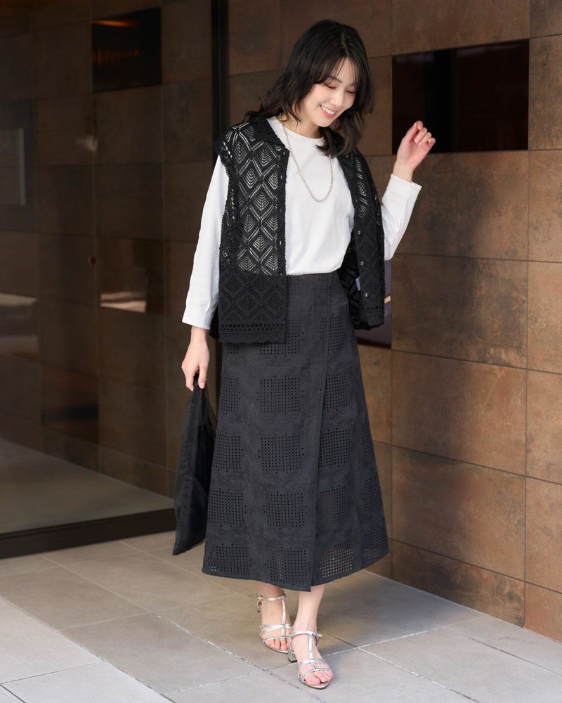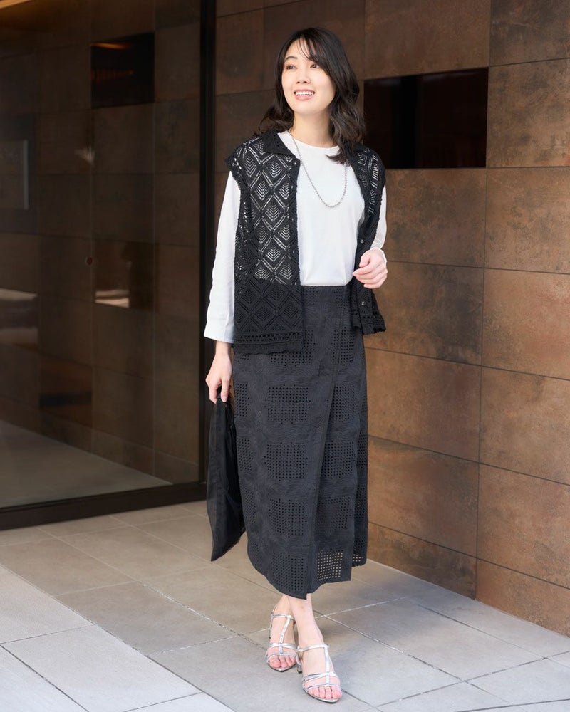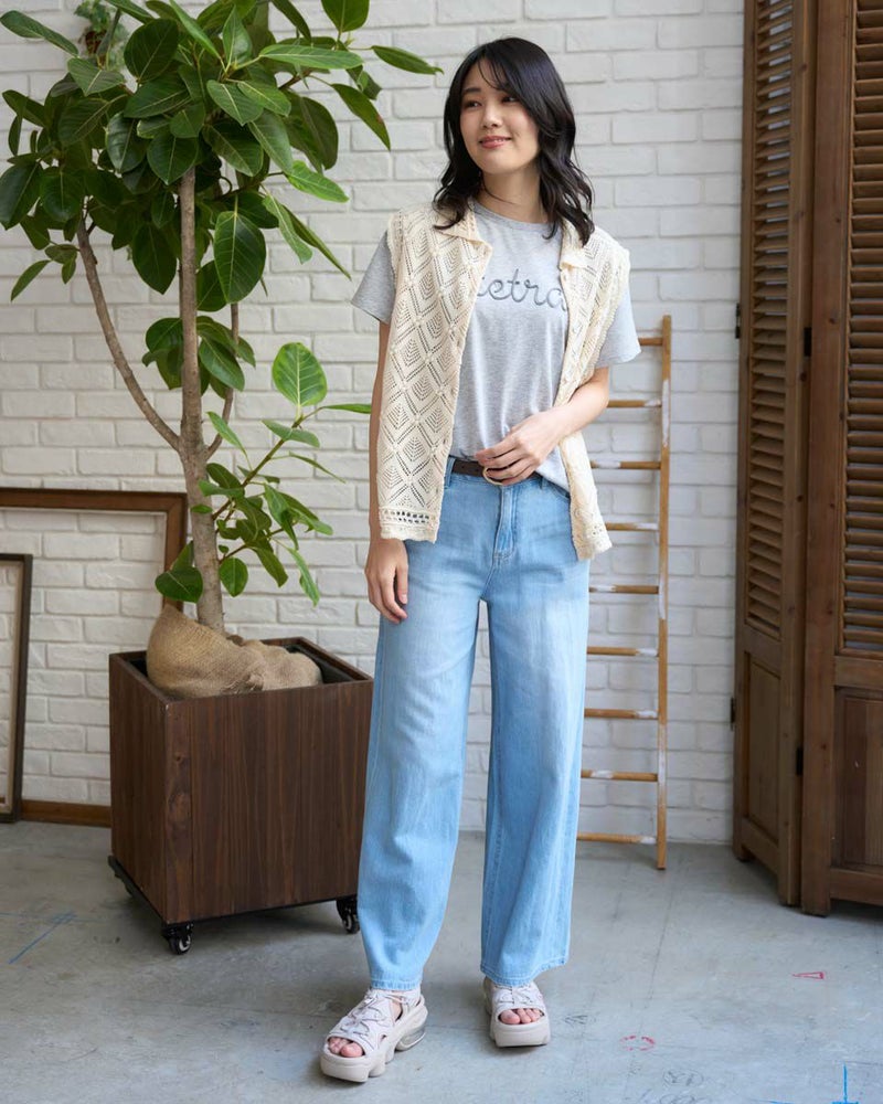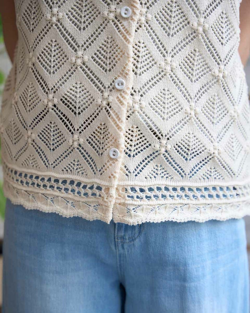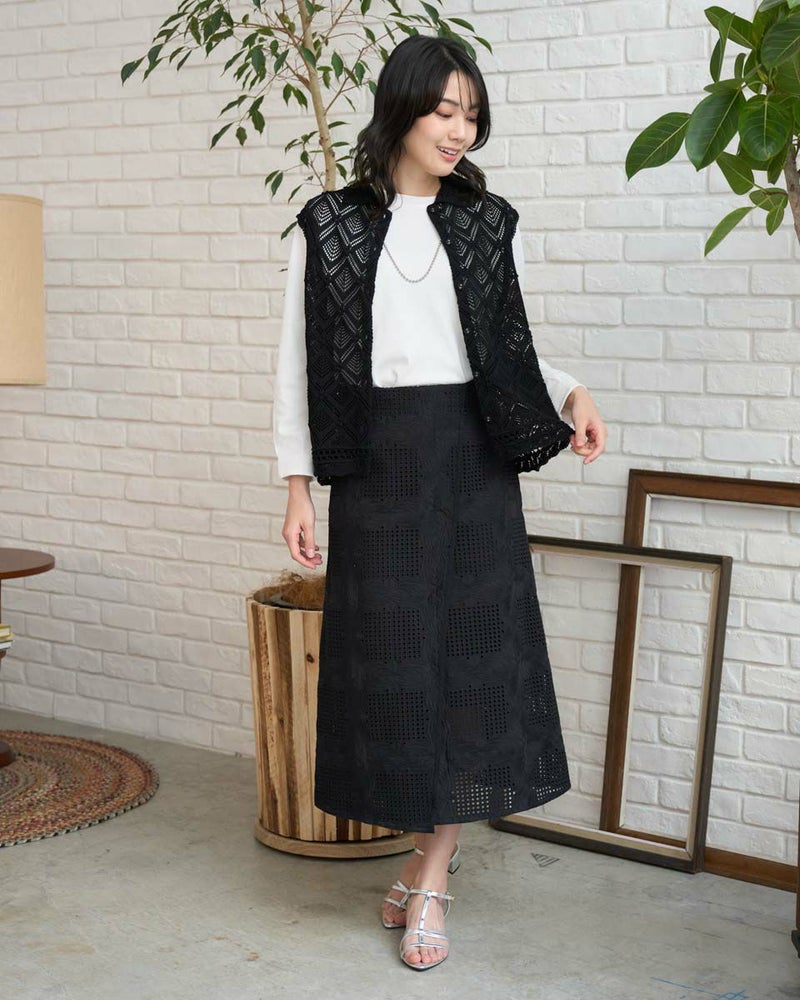 7cmほどのダイヤモチーフで構成された透かし編みのニットジレ。ドライで軽いタッチのストレート糸から繰り出される大胆な透けと繊細な編み目が印象的なアイテム。襟や裾のスカラップやダイヤの間にあしらわれた小さな丸いポンポン飾りなど甘さの効いたクラフト感も魅力です。襟が醸す品の良さもポイント。パールやレザー小物とも相性が良く半袖Tシャツや、ノースリーブに羽織り、スラックスと合わせたオフィススタイルもお洒落で素敵です。ニュートラルカラーで合わせやすく、チノパンや楊柳のワンピース、カゴバックなど多国籍のクラフトミックスもおススメです。 モデル身長: 166 cm 着用サイズ: M サイズ Golden Bear White Label (WOMEN) ニット (WOMEN) 【着用アイテム】468U3451 メローカットソー 468U3461 ロゴTシャツ 468U3750 レーススカート