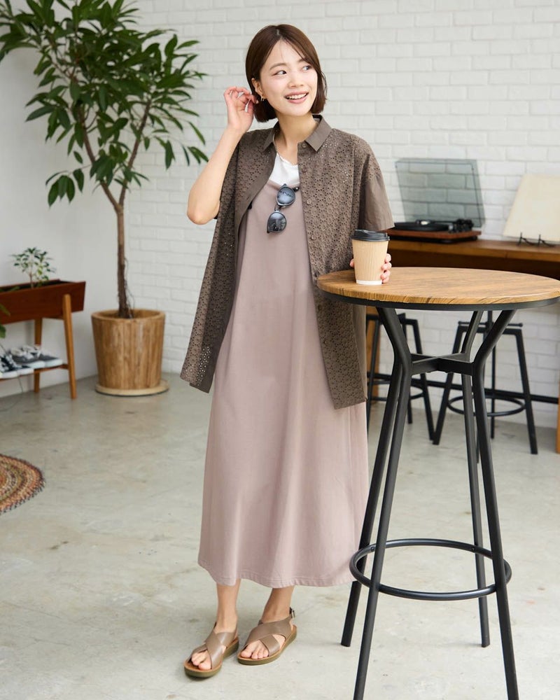 オーガニックコットンを使用したシャツです。前身頃と後ろヨークはレース。襟・前立て・袖・後ろ身は無地になります。ドロップショルダーで半袖丈です。