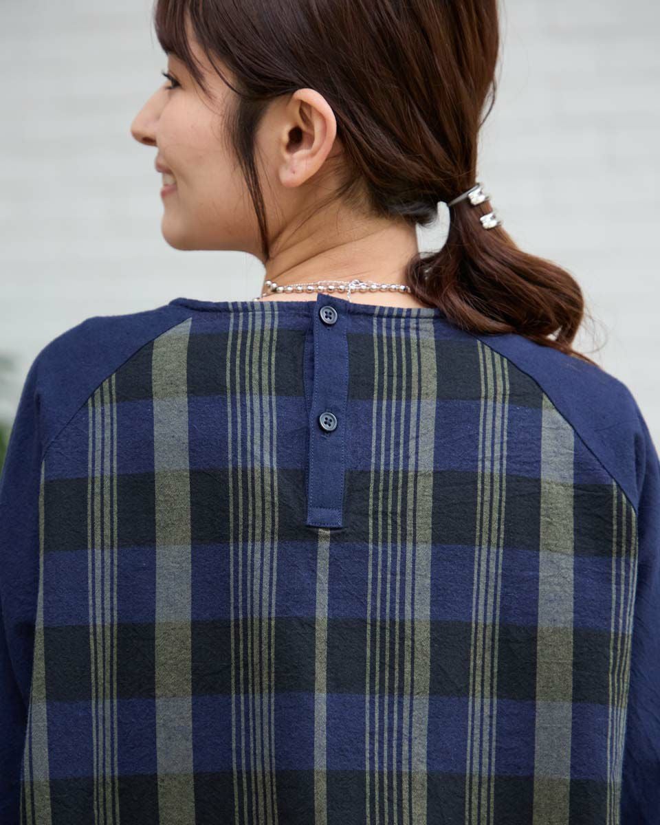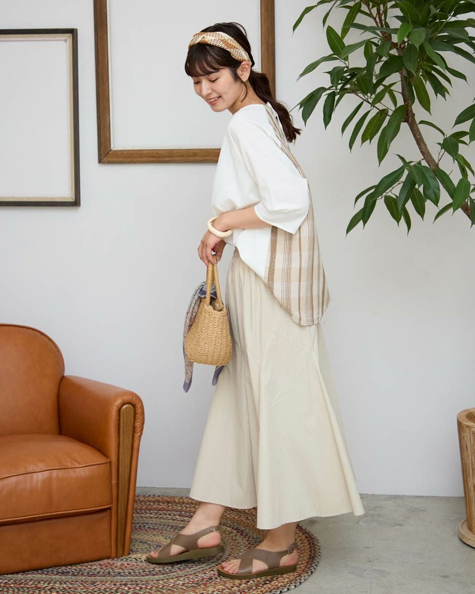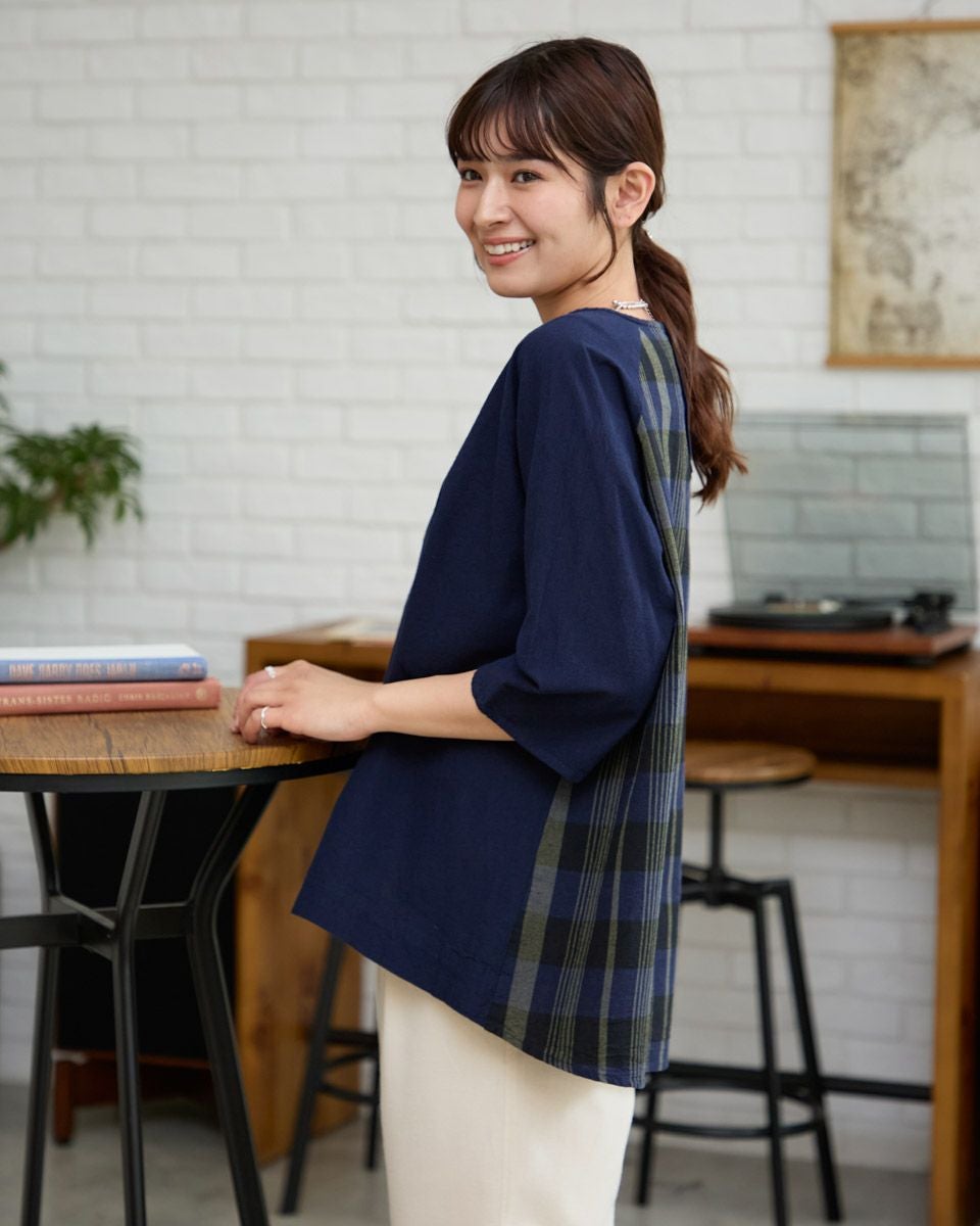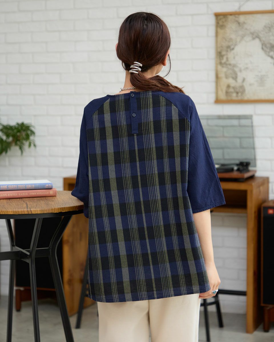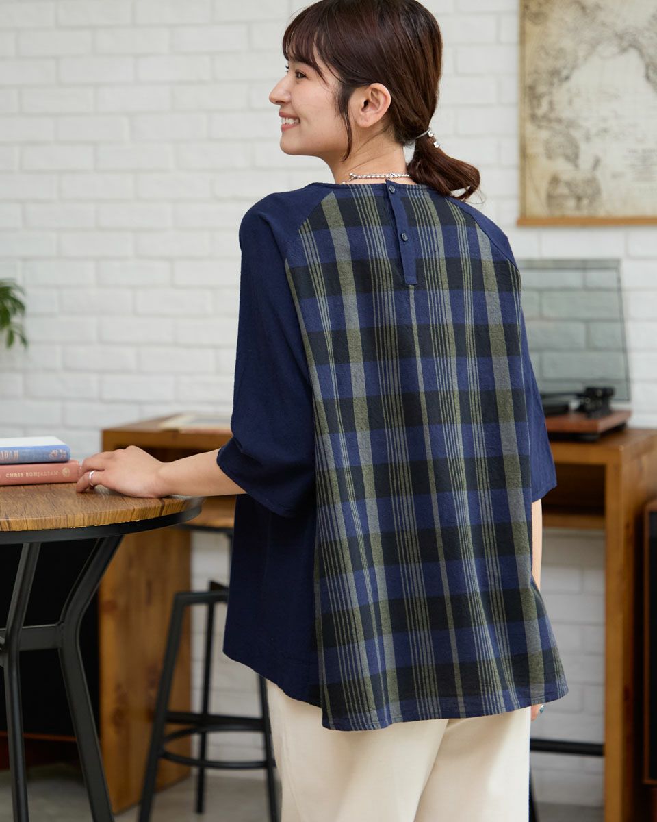 チェック+無地ブラウス