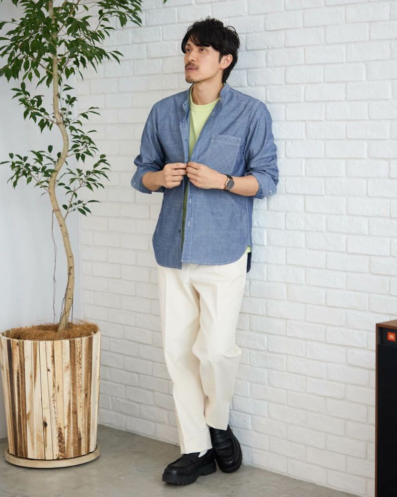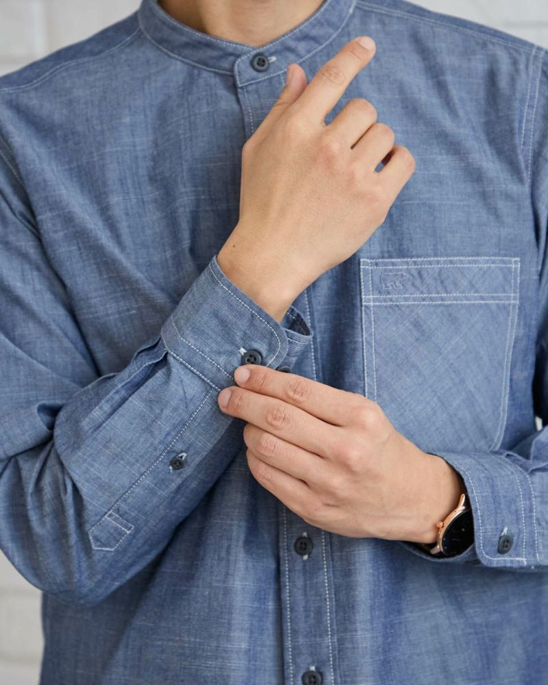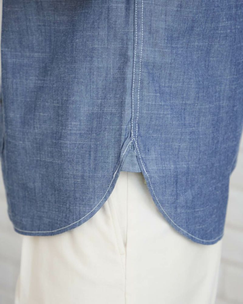 表情のあるダンガリー生地のバンドカラーシャツです。経糸にスラブ糸を使用することでナチュラルな風合いに仕上げました。
