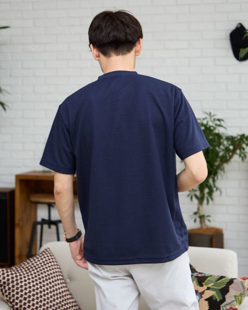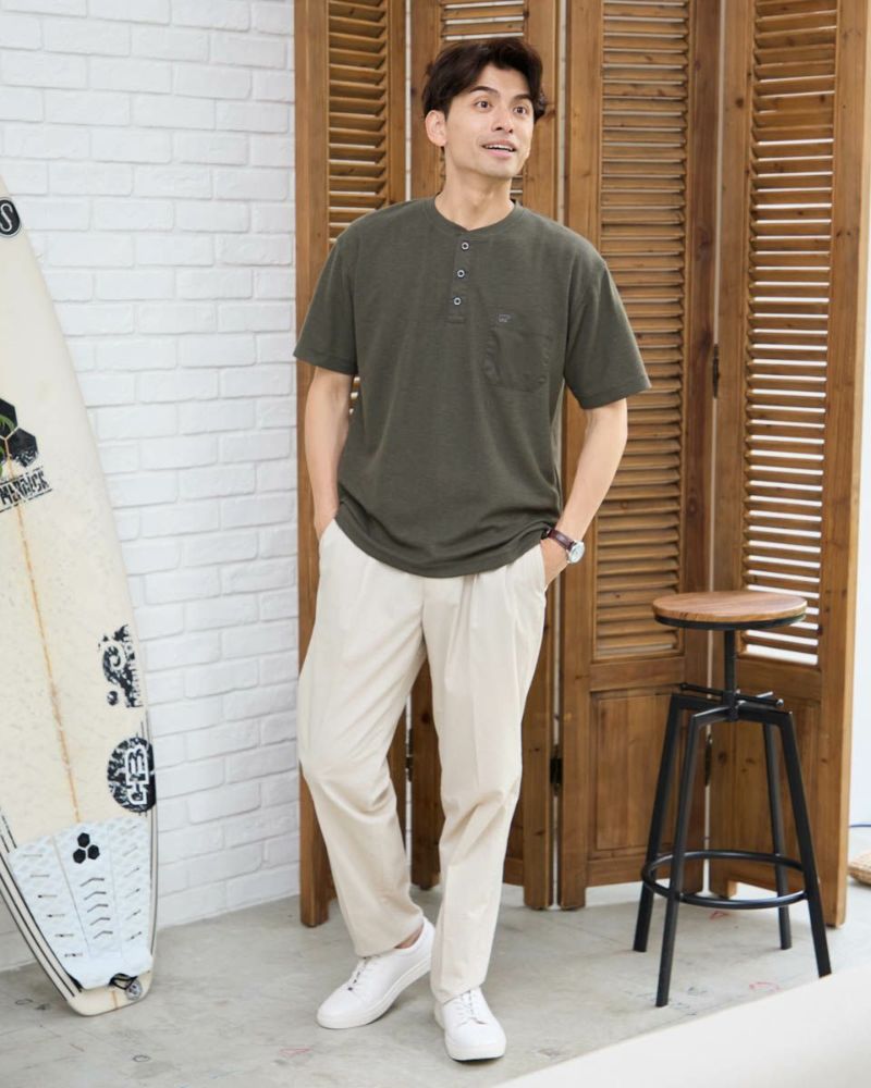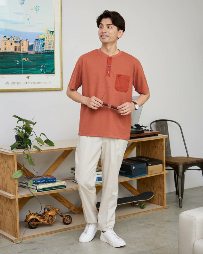 表情のあるワッフル鹿の子生地を使用したヘン リーネックTシャツです。前立てとポケット部分を身生地と同色の布帛で切り替えました。ライトアウターなどの羽織りアイテムのインナー使いとして重宝するTシャツです。 モデル身長: 180 cm 着用サイズ: L サイズ Golden Bear Men's カットソー (Men's) 【着用アイテム】314R4710 イージーパンツ 314R5701 スラックス
