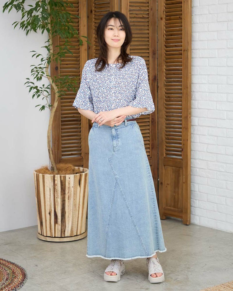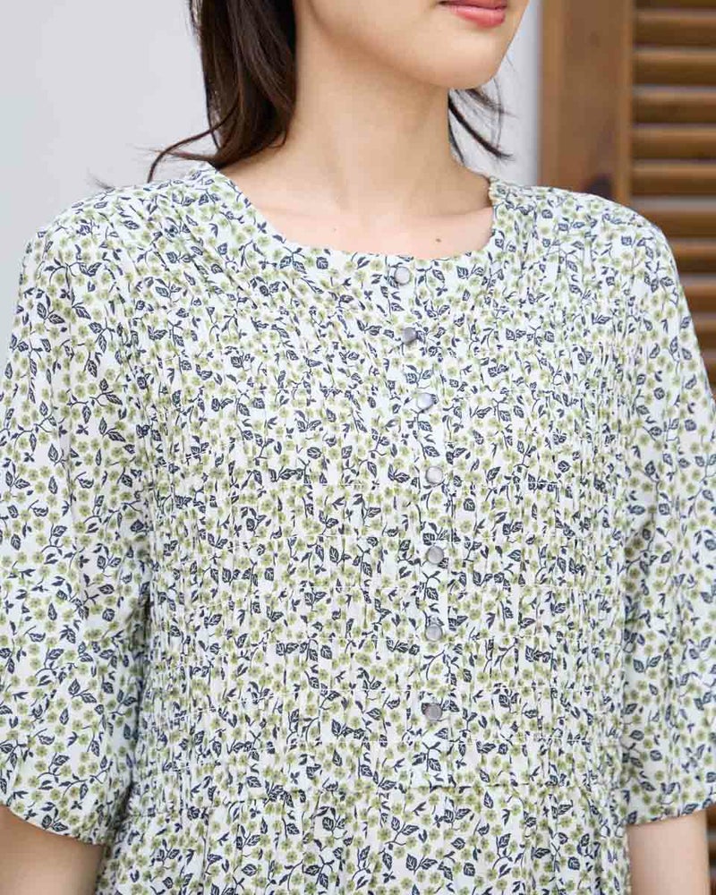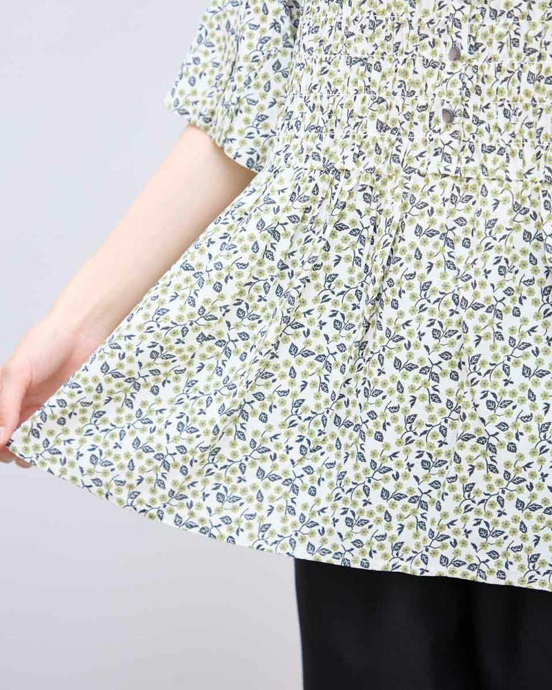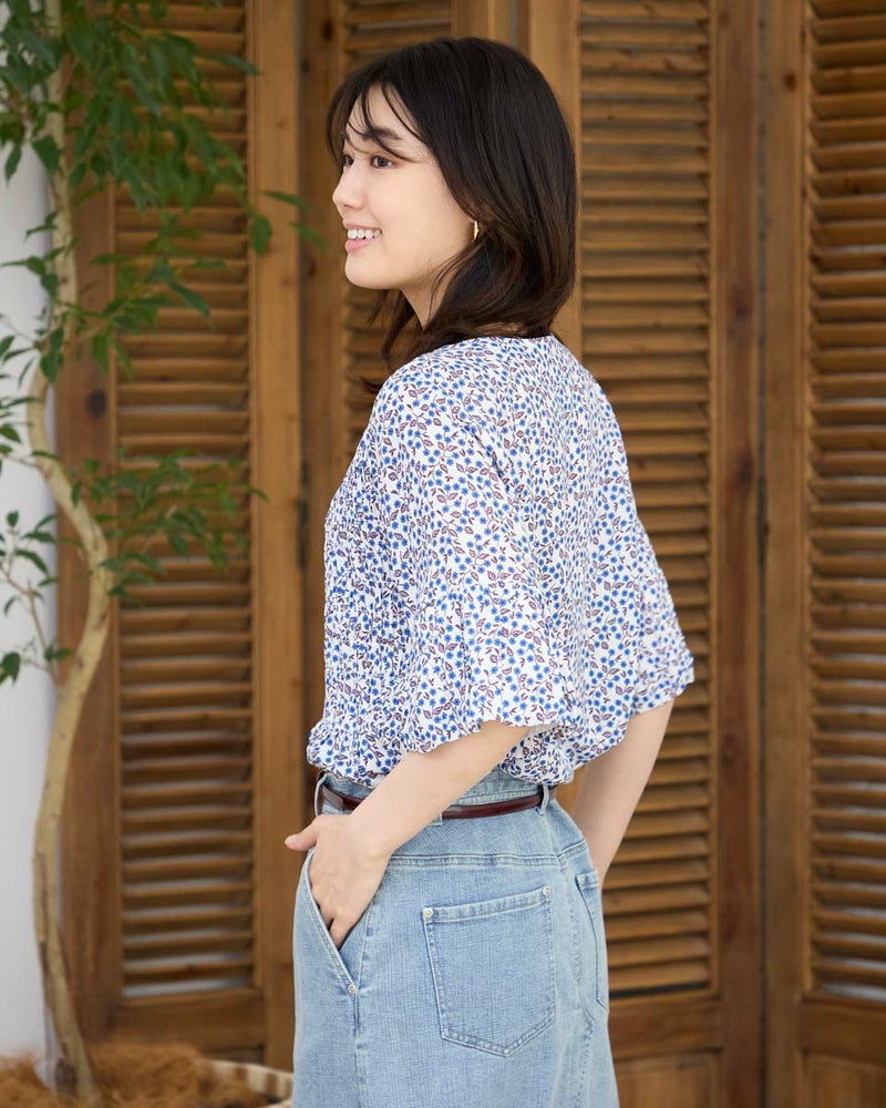 麻のナチュラルさと滑らかなレーヨンをブレンドした素材を使用。バストに入れた沢山のギャザーやバルーンの袖口も立体感はキープしレーヨンの効果でほどよく落ち身体のボリュームを拾わない点が魅力です。腹部を覆う着丈でパンツ合わせがお薦め。甘い香りを放つ一日花のハマナスが柄のイメージ。刹那的で美しい悲しみの花言葉が大人っぽくスクエアネックにスキンジュエリーを添えた着こなしも素敵です。