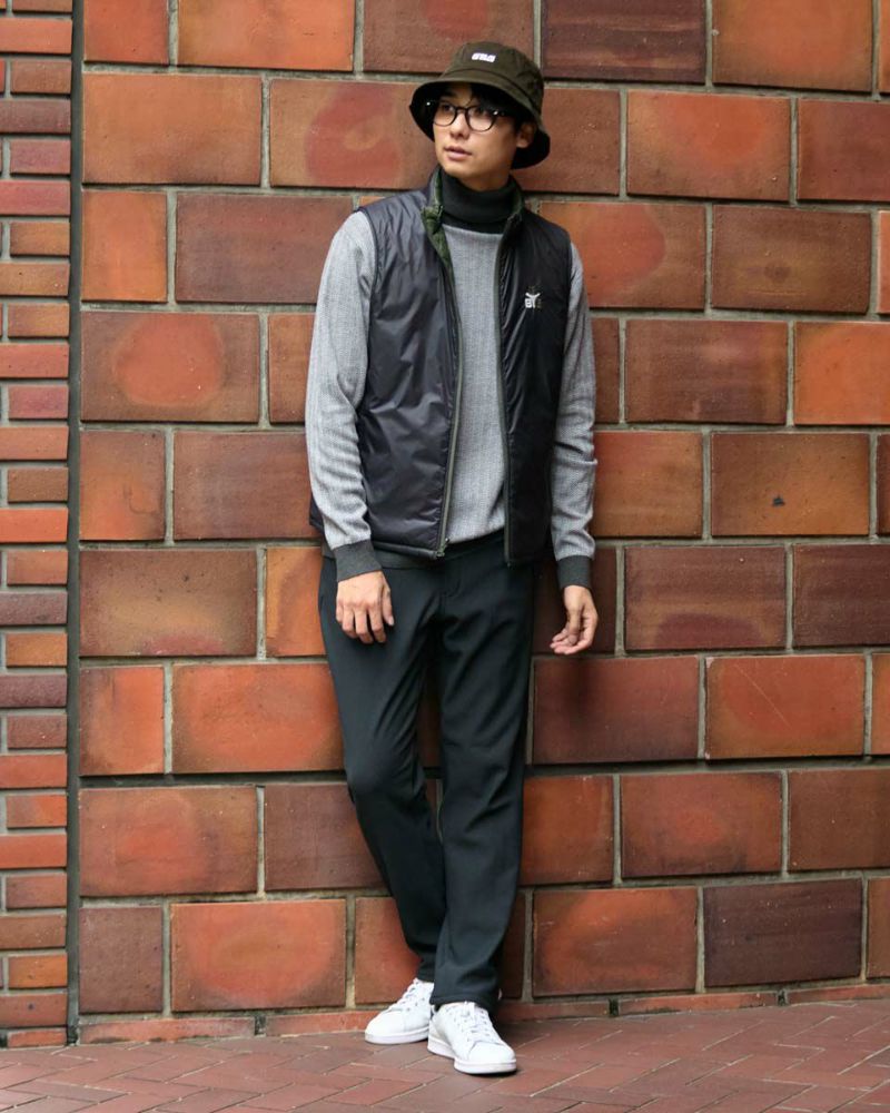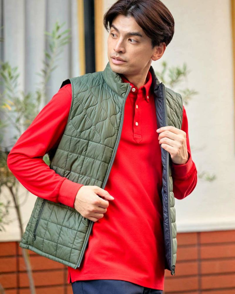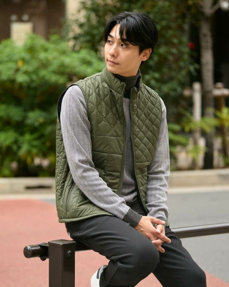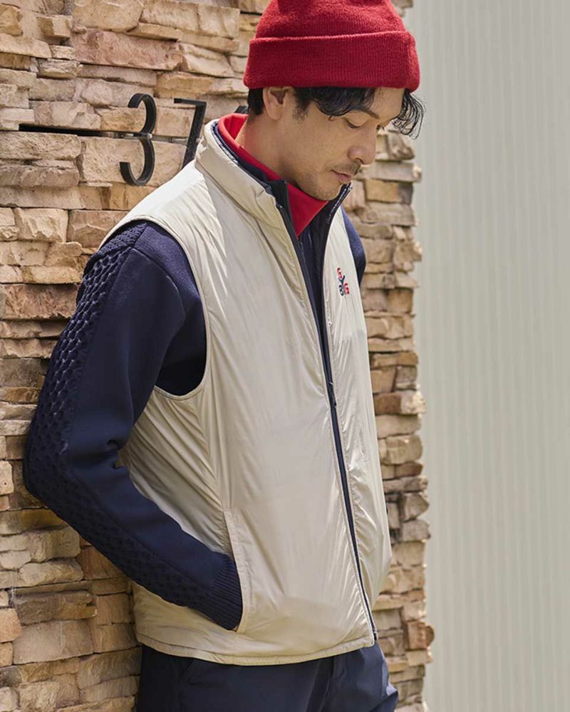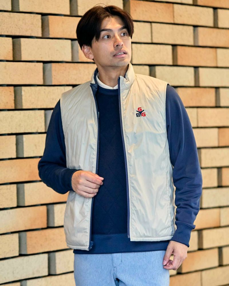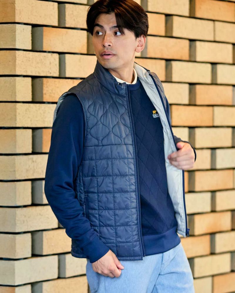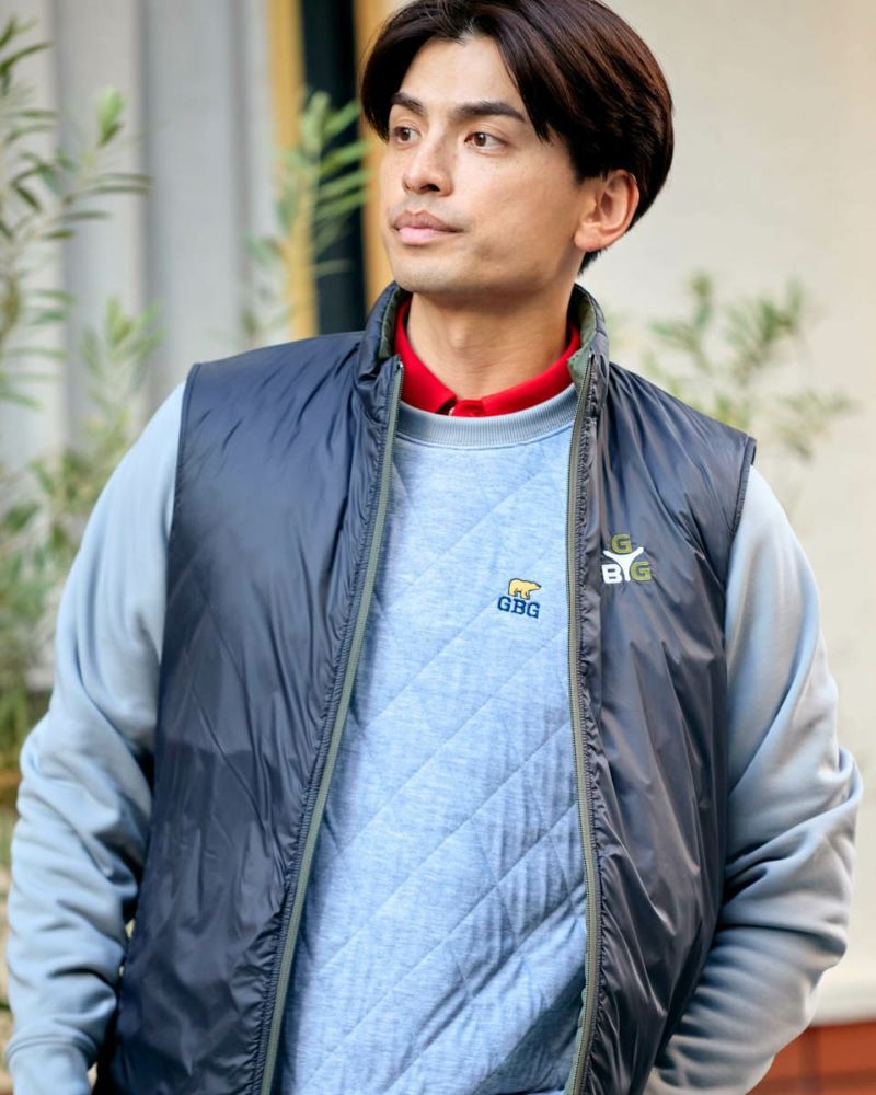中綿にナノテク素材“グラフェン”を使用した軽量リバーシブルベストです。表面は異なるキルトステッチを組み合わせた、クレイジーデザイン。裏面はシンプルでスポーティ。着合わせに応じて変わる表情をお楽しみください! はっ水性に優れた生地を使用し、軽い!(Lサイズ:260g)更に蓄熱保温付き!機能的かつ遊び心の効いた、今シーズンのオススメアイテムです! モデル身長: 180 cm 着用サイズ: L サイズ GB GOLF アウター (Men's) 【着用アイテム】 TRADタートルネックニット (品番: 312QE611 ) SPIKEハーフZIPスウェット (品番: 312QD422 ) GBGスラックス (品番: 312QC703 ) ハイブリッドスウェット (品番: 312QD423 ) GBGパンツ (品番: 312QD705 )