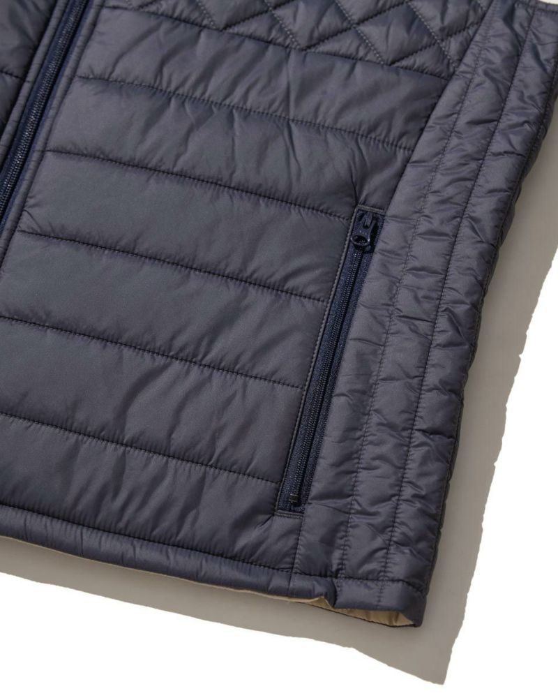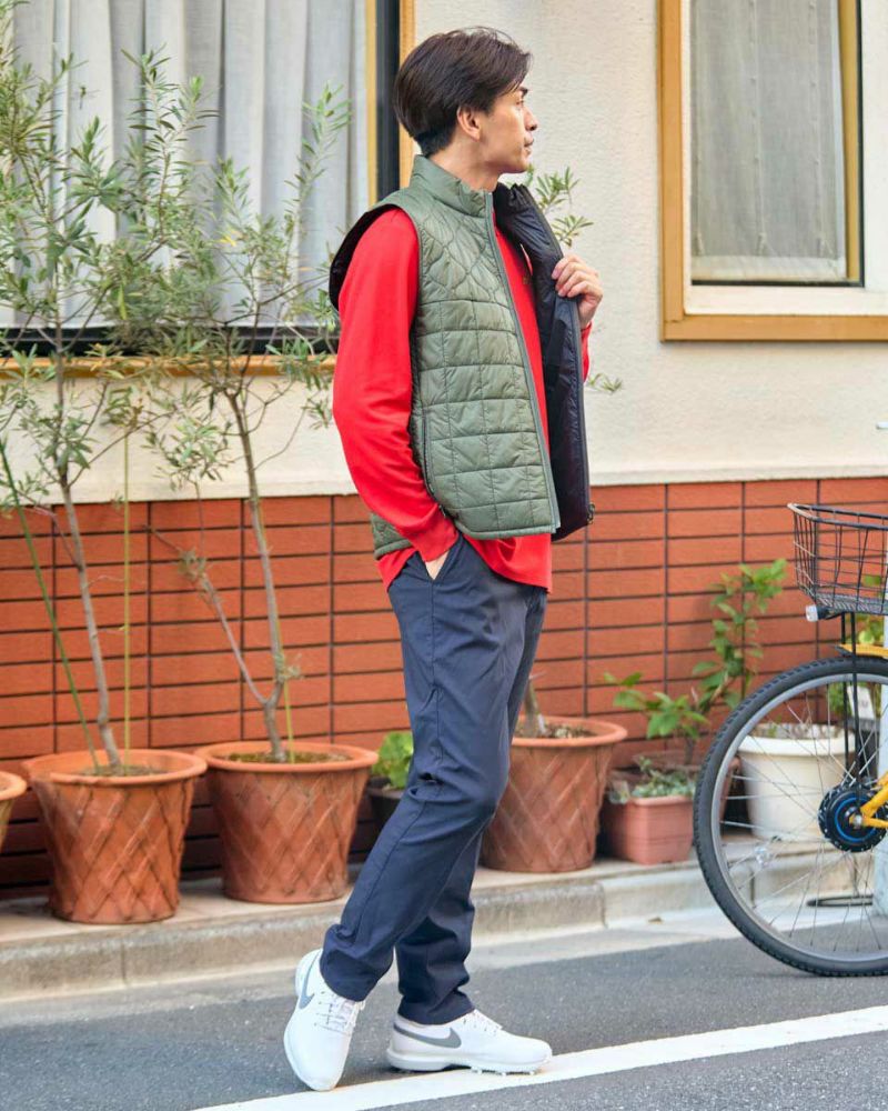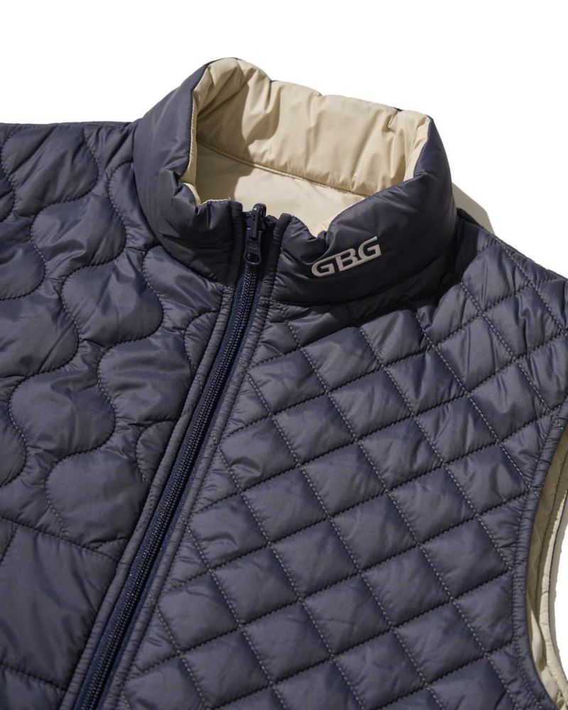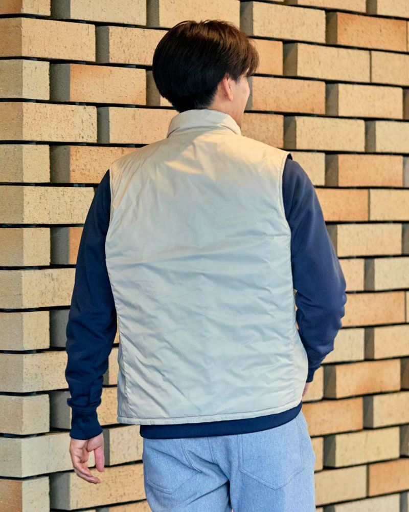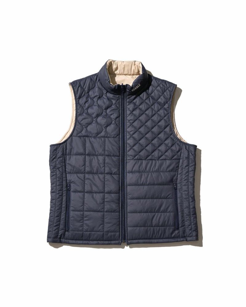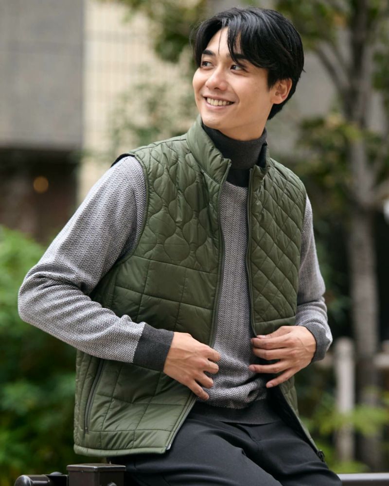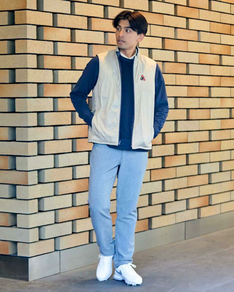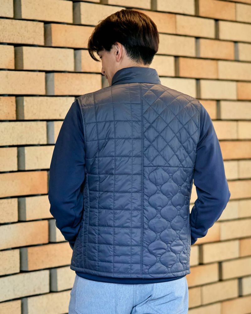 中綿にナノテク素材“グラフェン”を使用した軽量リバーシブルベストです。表面は異なるキルトステッチを組み合わせた、クレイジーデザイン。裏面はシンプルでスポーティ。着合わせに応じて変わる表情をお楽しみください! はっ水性に優れた生地を使用し、軽い!(Lサイズ:260g)更に蓄熱保温付き!機能的かつ遊び心の効いた、今シーズンのオススメアイテムです! モデル身長: 180 cm 着用サイズ: L サイズ GB GOLF アウター (Men's) 【着用アイテム】 TRADタートルネックニット (品番: 312QE611 ) SPIKEハーフZIPスウェット (品番: 312QD422 ) GBGスラックス (品番: 312QC703 ) ハイブリッドスウェット (品番: 312QD423 ) GBGパンツ (品番: 312QD705 )
