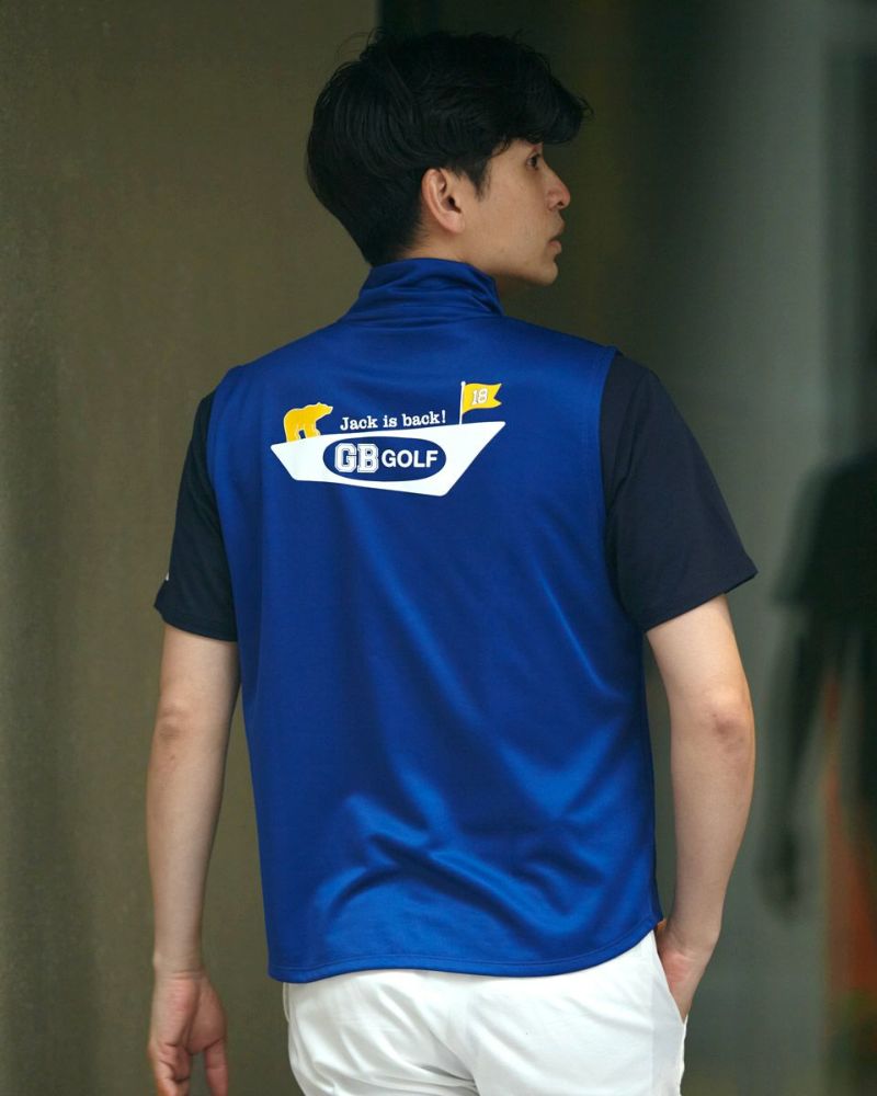 ストレッチ性・吸水速乾性に優れたカットソーベストです。ジャックニクラウスが、マスターズ復活優勝した際の名言「Jack is back!」を後身にプリントしました。ゴルフシーンでも彼が後押ししてくれる事間違いなし!