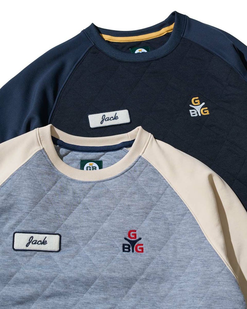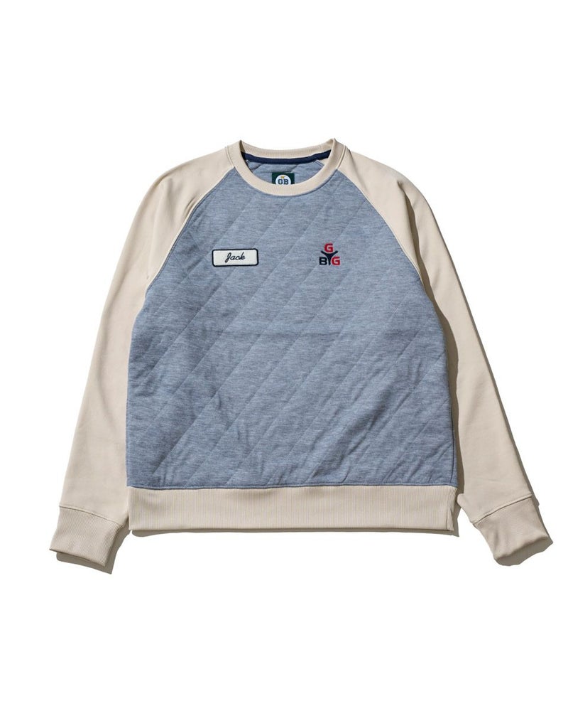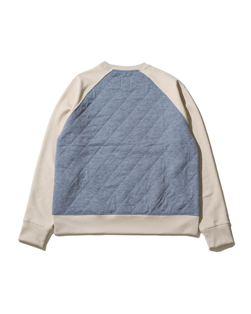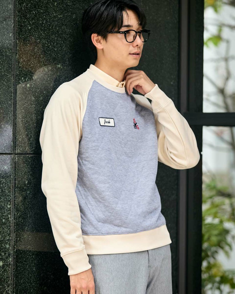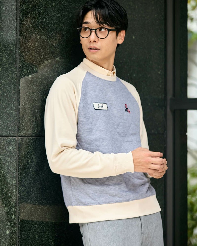 異素材をドッキングさせたハイブリッドなクルーネックスウェットです。スイングしやすよう、袖部分は軽くて弾力のある素材をチョイスしました。