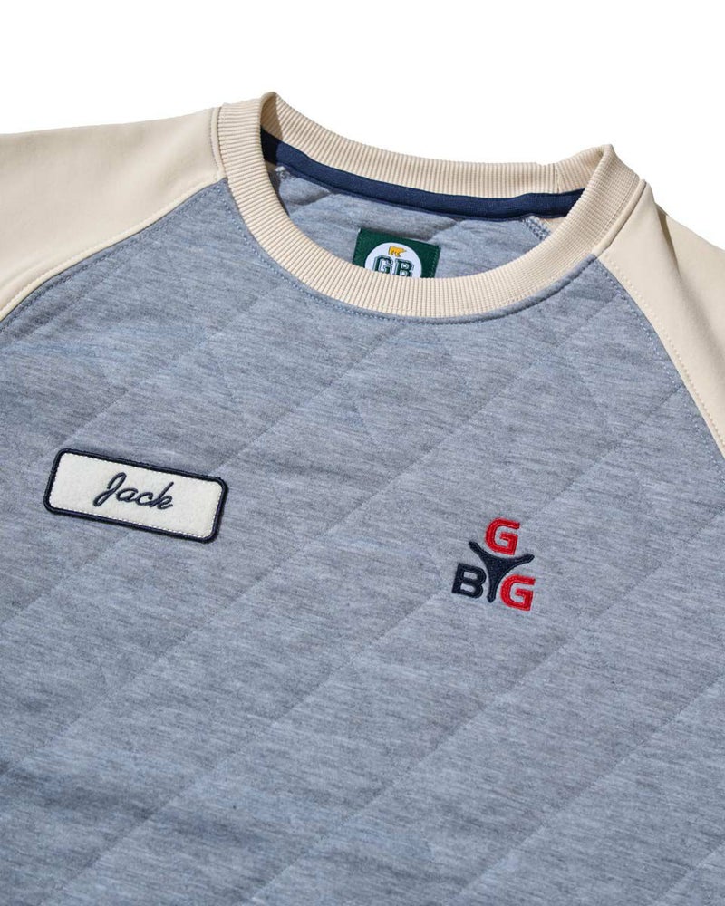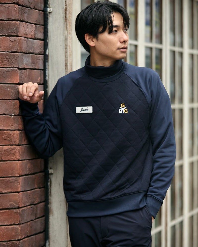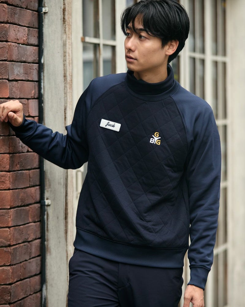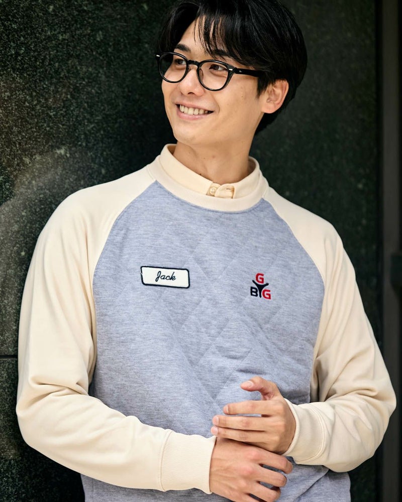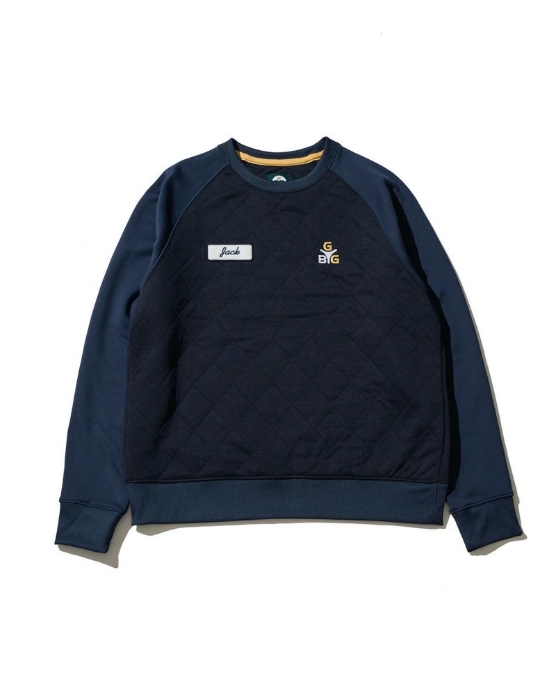 異素材をドッキングさせたハイブリッドなクルーネックスウェットです。スイングしやすよう、袖部分は軽くて弾力のある素材をチョイスしました。