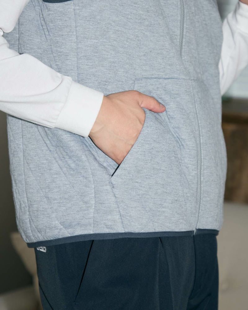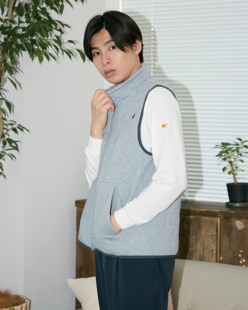 カジュアルな着こなしにも使える薄中綿のキルティングベストです。胸元のポケットはキルティングデザインを生かし、すっきりと仕上げました。もこもこしすぎない厚みなので、秋口はアウターとして、寒くなってきたら、インナーとして長い期間お使いいただけます。