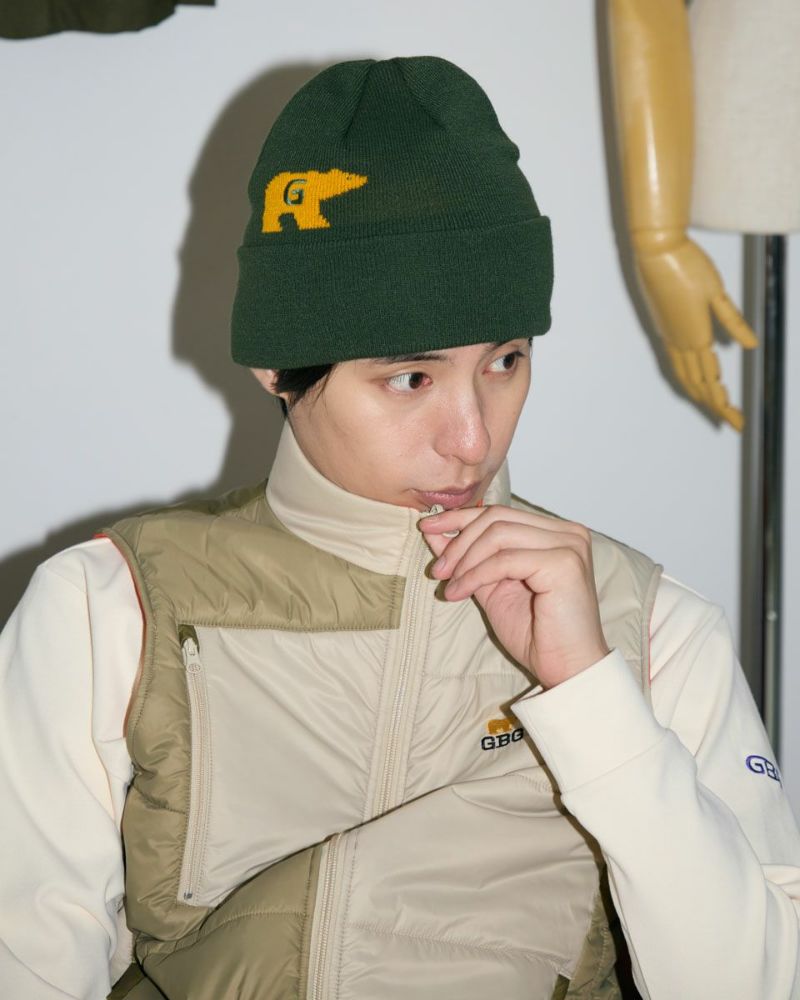 金熊のロゴが印象的なビーニーです。ロゴは正面よりも少し左右にずらして被ると、よりこなれた印象になります。寒い時期のゴルフはもちろん、普段のお散歩やお買い物などのカジュアルシーンでも大活躍するアイテムです。