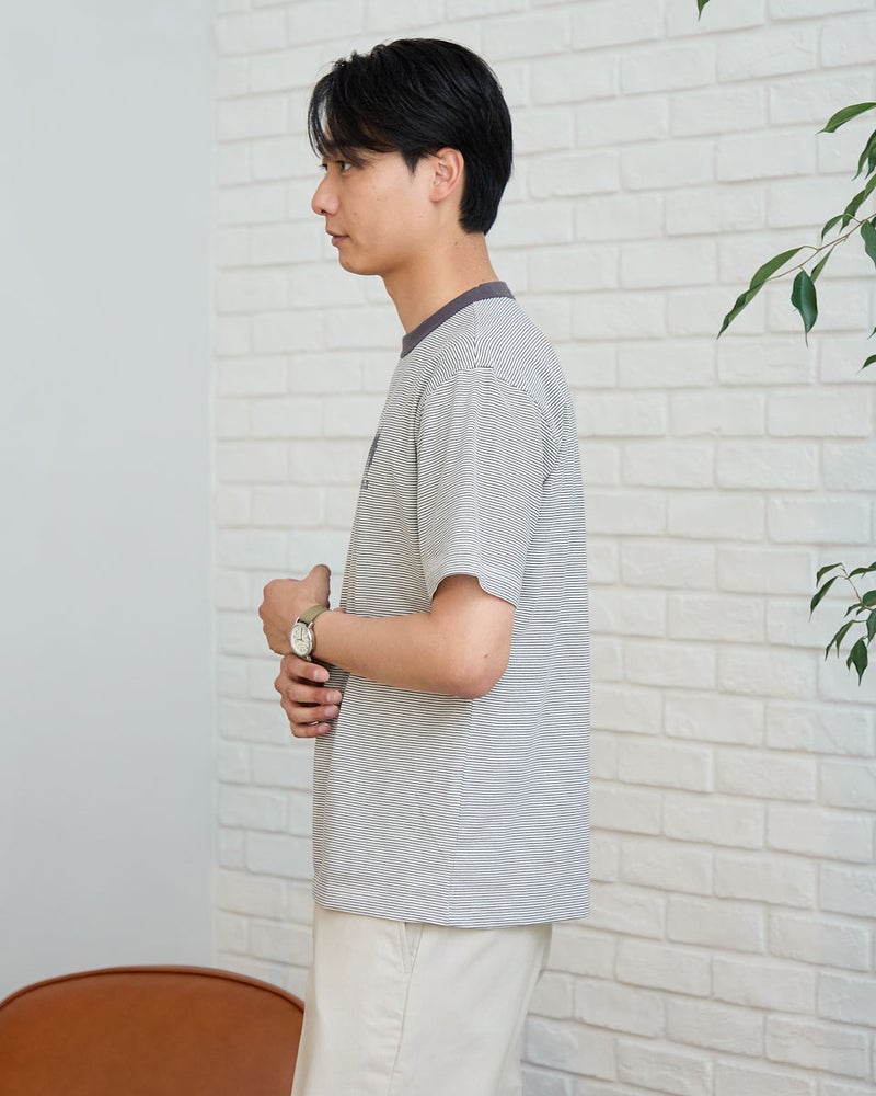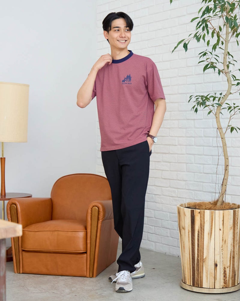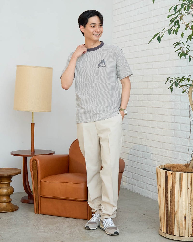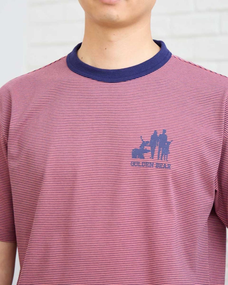 家族とクマをモチーフにしたファミリーベアのプリントを施したクルーネックTシャツです。無地のように着用いただけるミジンボーダーに仕上げました。プリントは古着のような表情にするためにクラックプリントで表現しました。 モデル身長: 180 cm 着用サイズ: L サイズ Golden Bear Men's カットソー (Men's) キッズサイズはこちら ウィメンズサイズはこちら 家族コーディネートアイテムはこちら