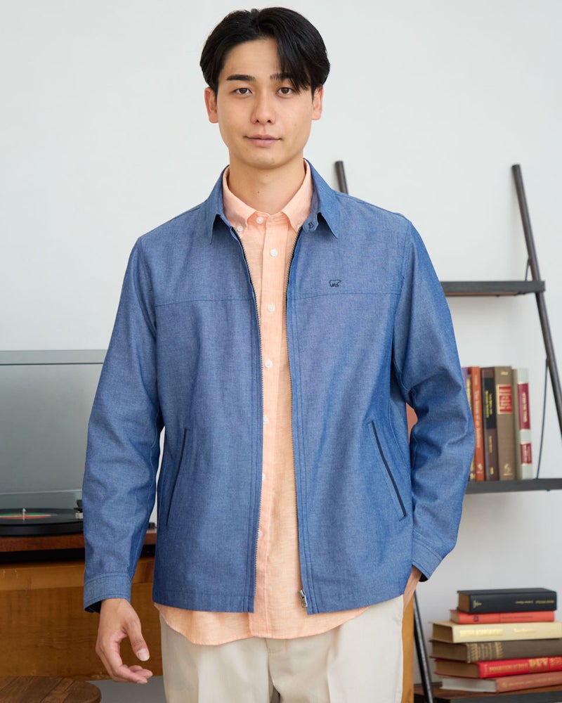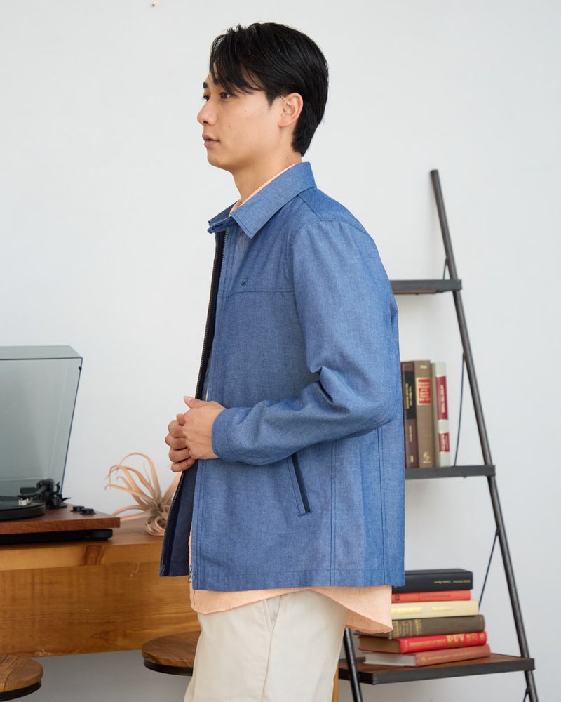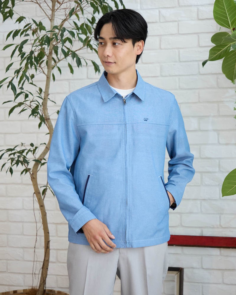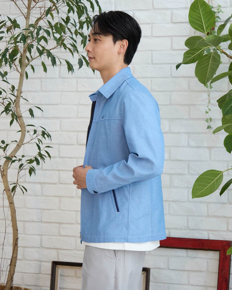 シャツ感覚で軽く羽織れるZIPブルゾンです。表情のある綿/ポリエステル混のオックス素材を使用しました。ポケット口、カフス裏、襟裏に別生地素材を使用した配色がアクセントです。