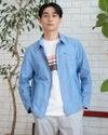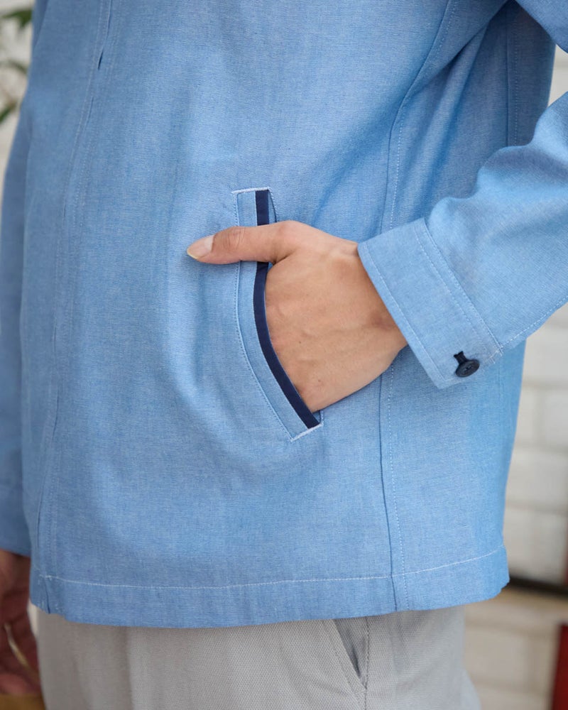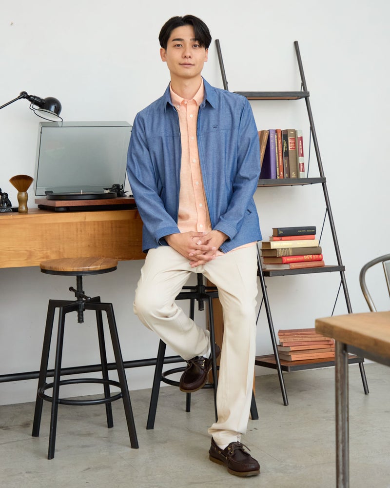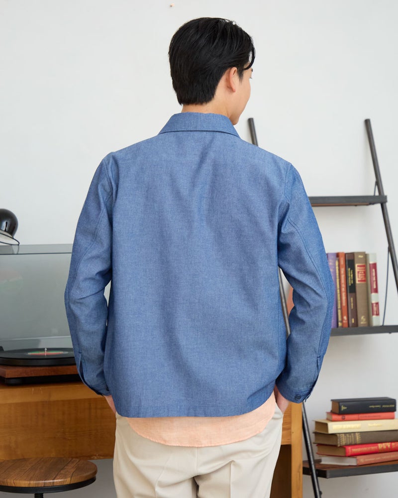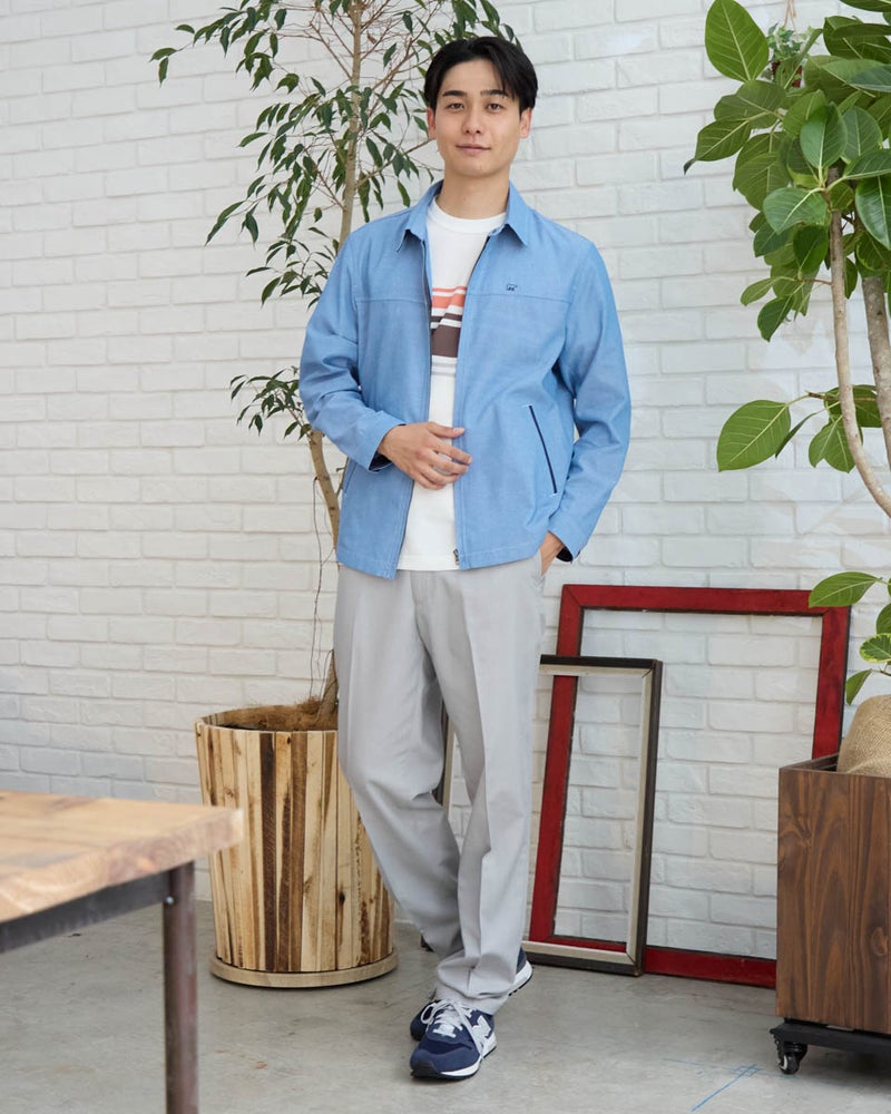 シャツ感覚で軽く羽織れるZIPブルゾンです。表情のある綿/ポリエステル混のオックス素材を使用しました。ポケット口、カフス裏、襟裏に別生地素材を使用した配色がアクセントです。