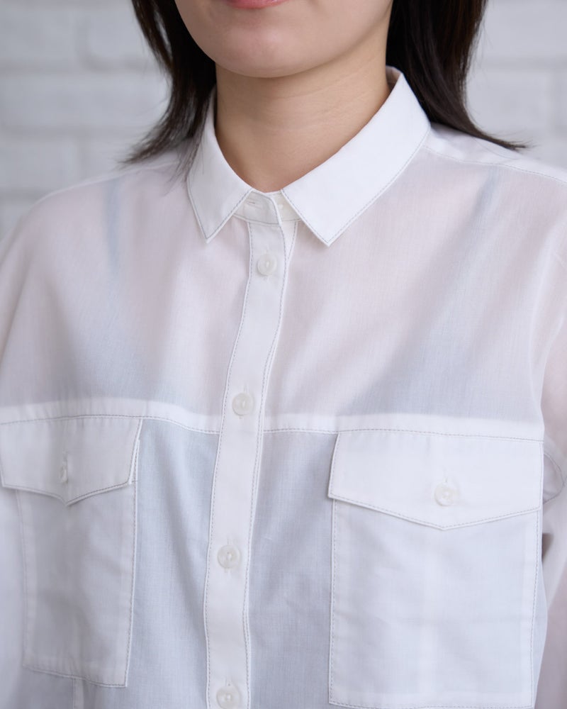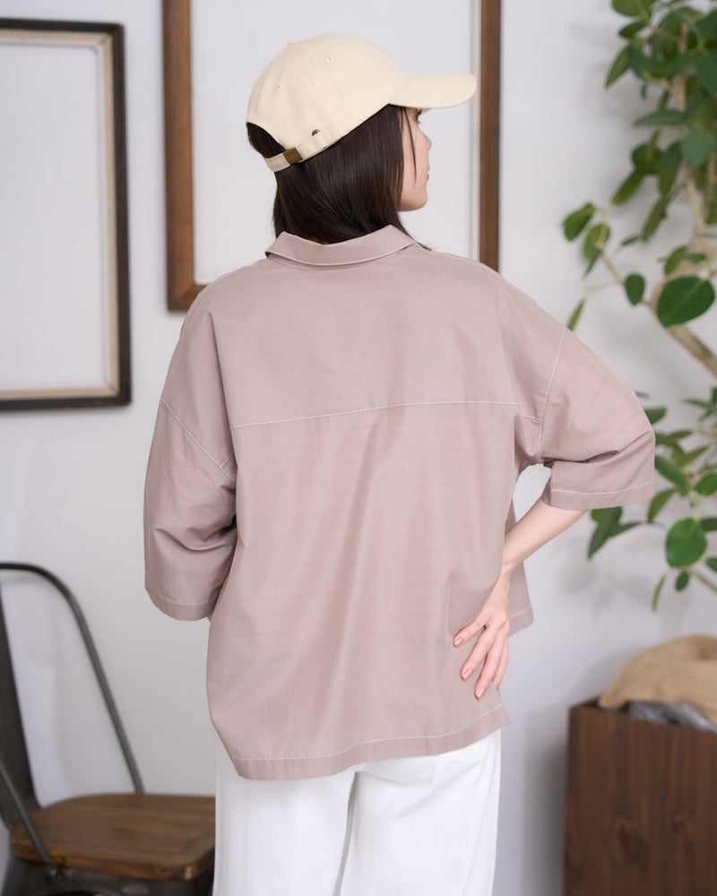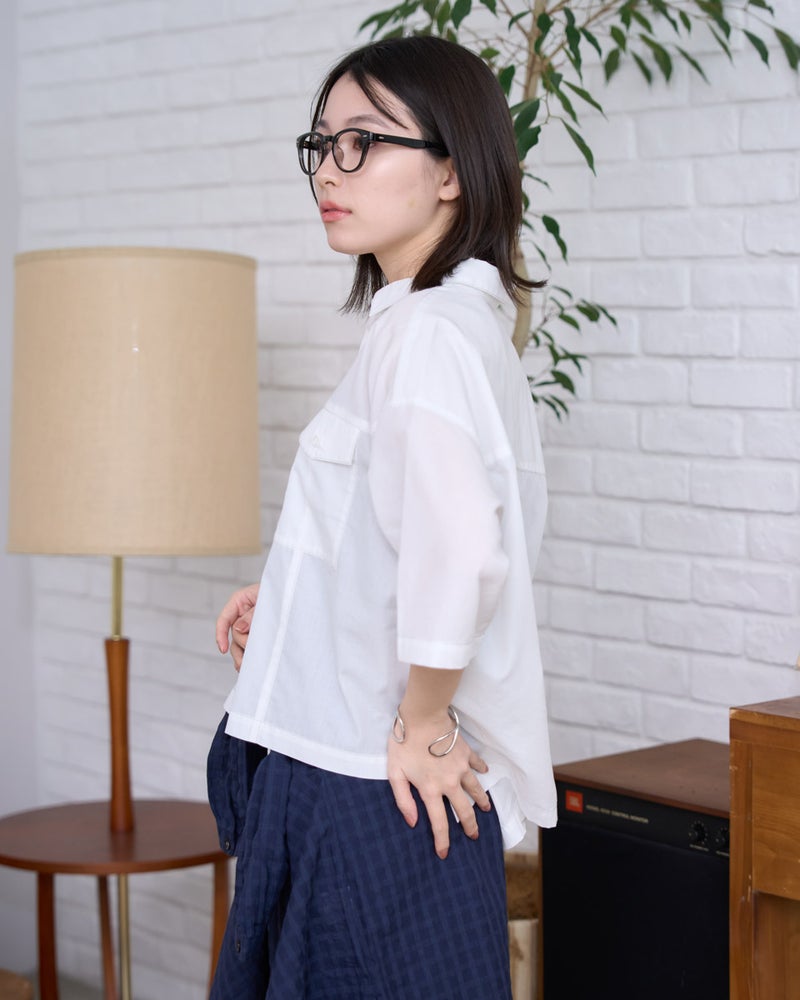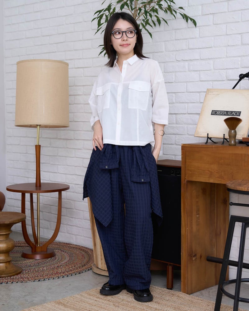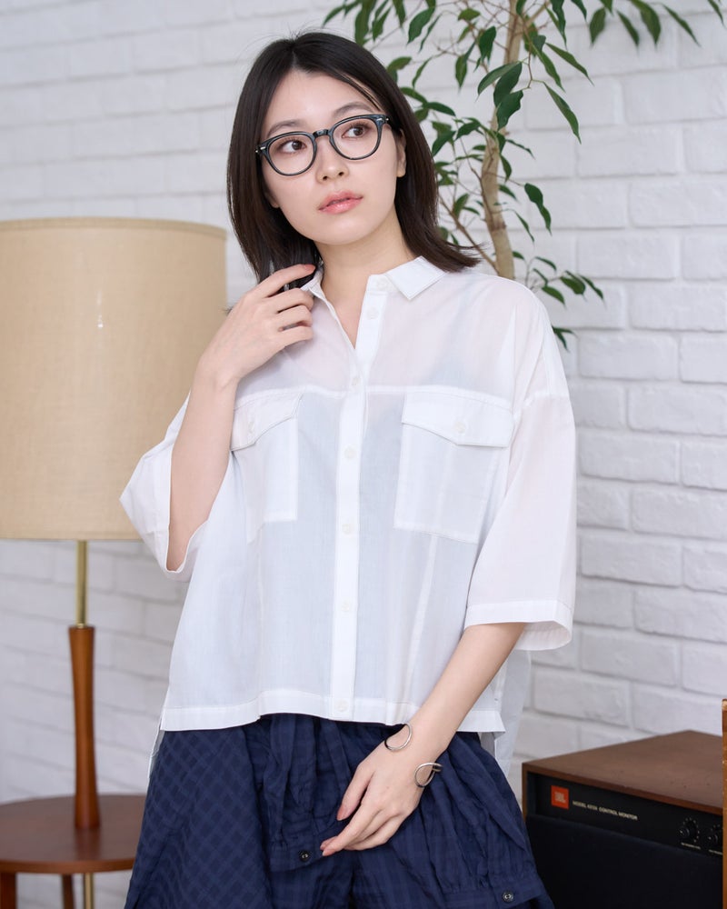 胸元のフラップポケットがアクセントになった、ワークテイストを上品に昇華させたシャツ。程よくハリのある素材を使用し、崩れすぎないきちんとしたシルエットを追求しました。ゆとりのあるサイズ感で動きやすく、前を開けて羽織りとして使うのもおすすめ。アクティブに動きたい街歩きや、旅行の際の軽快なレイヤードスタイルにぴったりの一着です。 モデル身長: 162 cm 着用サイズ: M サイズ Golden Bear WOMEN ブラウス (WOMEN) 【着用アイテム】467U4305 麻混チュニックシャツ 467U4702 麻混ストレートパンツ 468U4751 ワイドデニムパンツ
