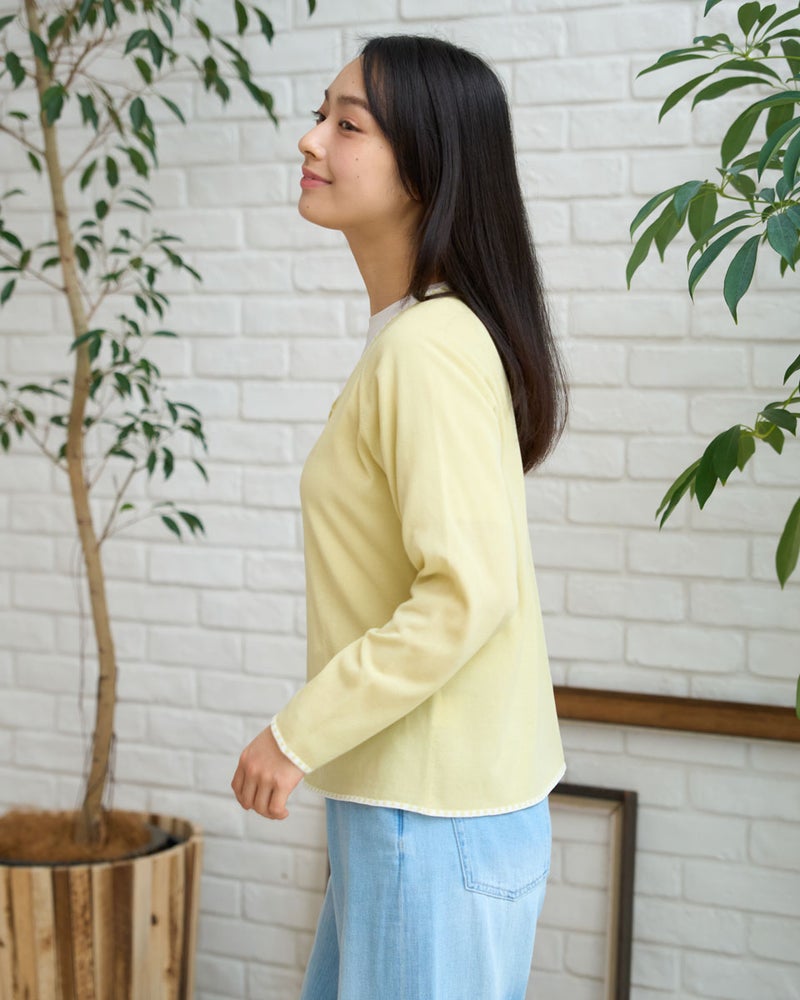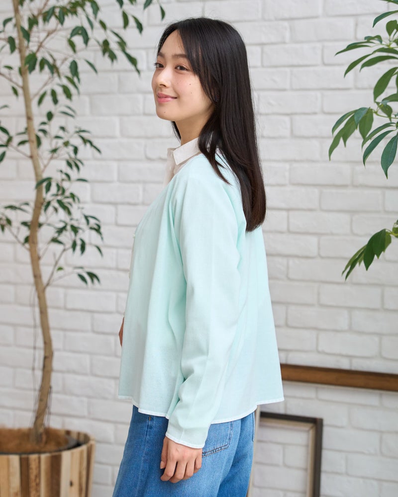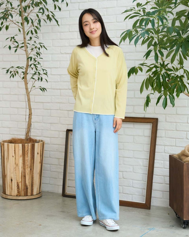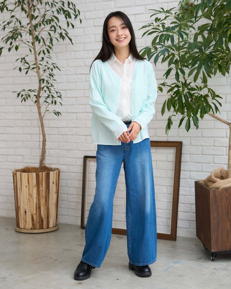 強い日差しから肌を守るUVカット機能付き。サラッとした爽やかな肌触りで、夏まで心地よく寄り添ってくれます。前立てや袖口に施した繊細なドビー編みが、シンプルな中に大人の個性を添えてくれます。計算されたVネックは、ボタンを留めても開けても美しく決まる設計。日よけや冷房対策として、毎日のお出かけに欠かせない一着です。 モデル身長: 167 cm 着用サイズ: M サイズ Golden Bear WOMEN ニット (WOMEN) 【着用アイテム】467U4315 綿麻切替シャツ 468U4750 ワイドデニムパンツ