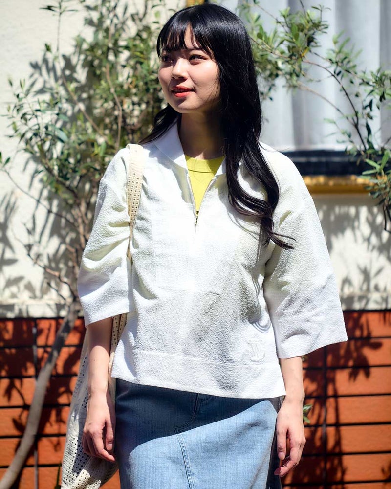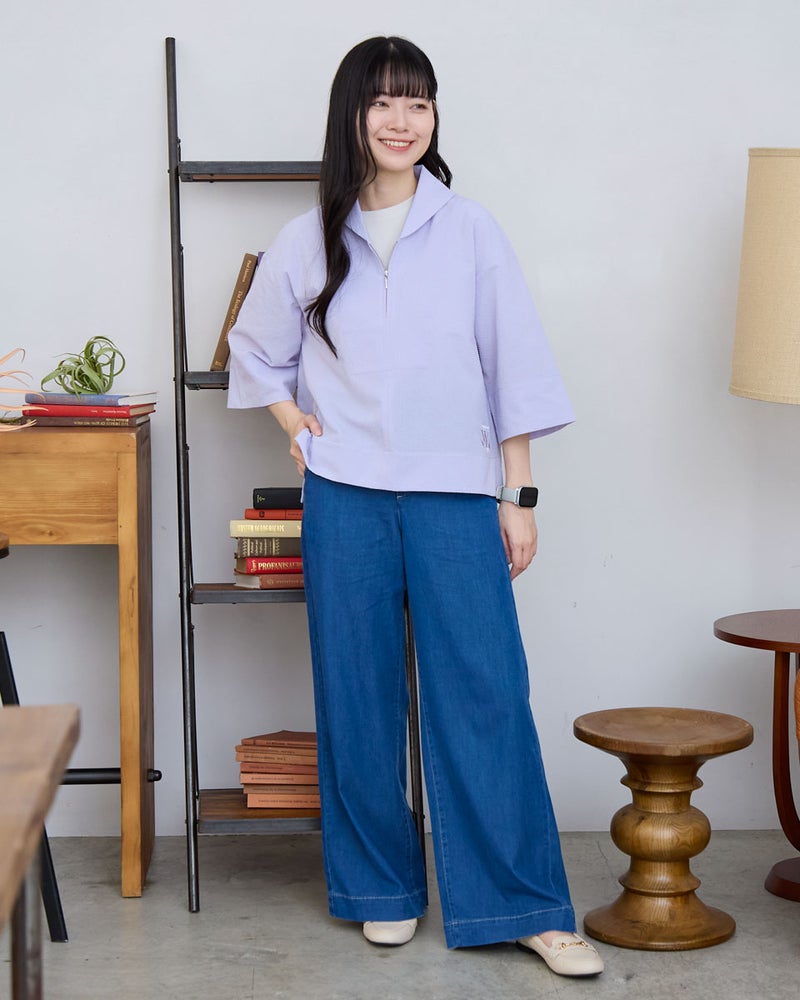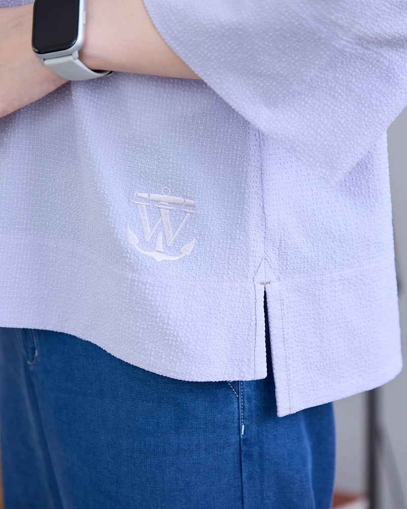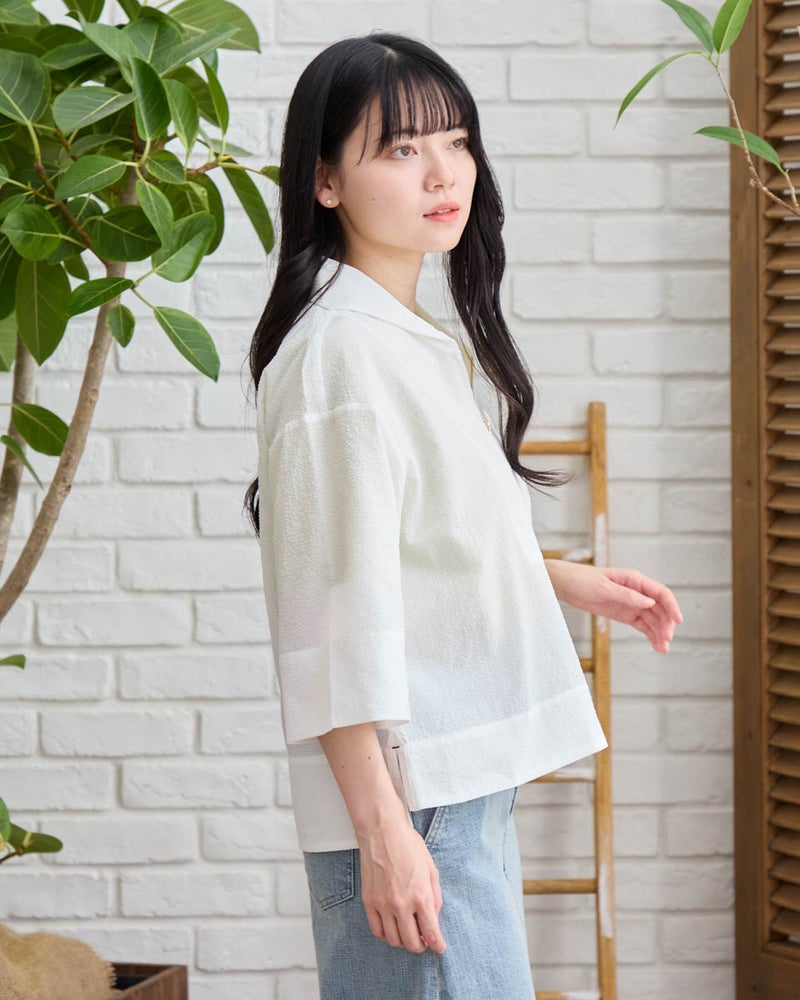 セーラーカラーを大人らしく上品にアレンジしたブラウスです。小さな凹凸が広がるサッカー生地で、肌に触れる面積を減らし、熱や湿気を逃がすため春夏も涼しく快適に着用できます。襟のラインは甘すぎない絶妙なフォルムに整え、顔周りをスッキリと見せます。フロントにあしらったメタルのハーフジップが光り上品な印象に仕上がります。左裾のアンカーモチーフ刺しゅうもポイント。手首が見える7分袖は、ブレスレットやネイルを引き立てます。オフィスや学校行事、休日のお出かけや旅先まで、いつもより少しお洒落を楽しみたい日の主役としておすすめです。 モデル身長: 160 cm 着用サイズ: M サイズ Golden Bear White Label (WOMEN) ブラウス (WOMEN) 【着用アイテム】467U5430 GB天竺Tシャツ 468U4750 ワイドデニムパンツ 468U4051 レーストートバック