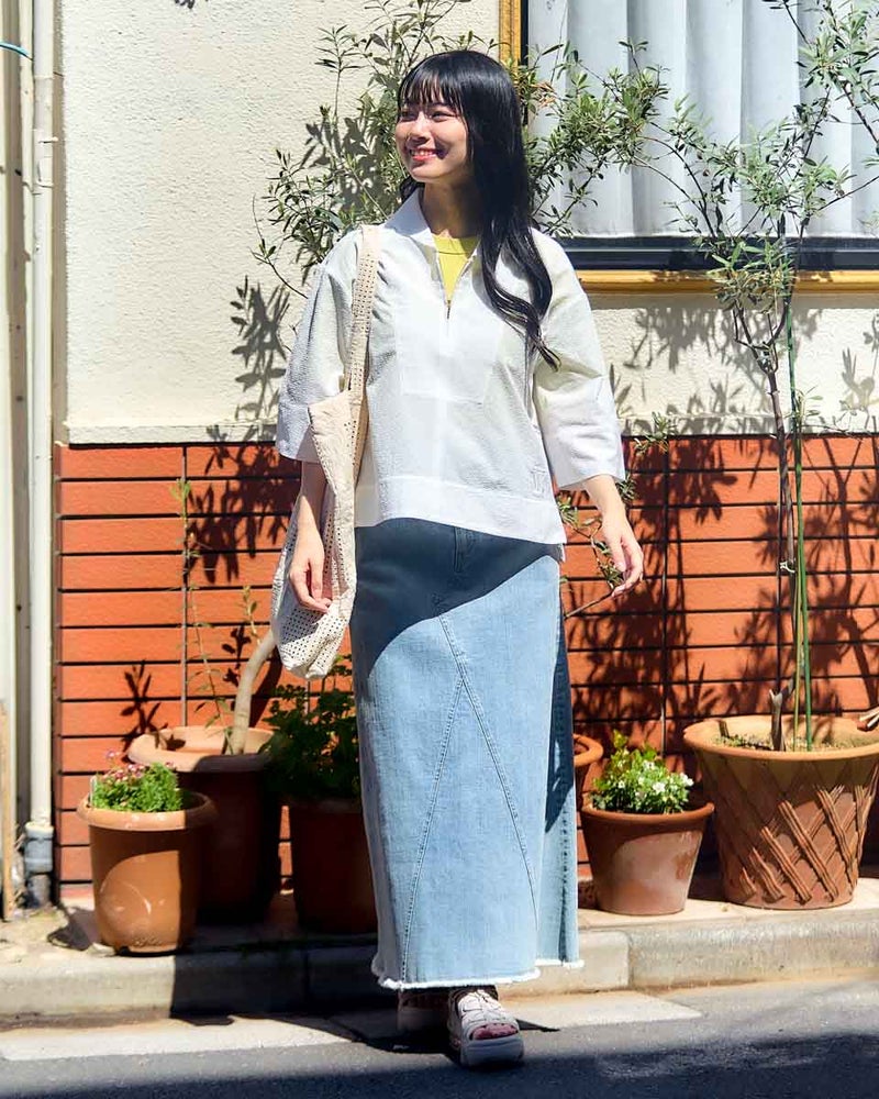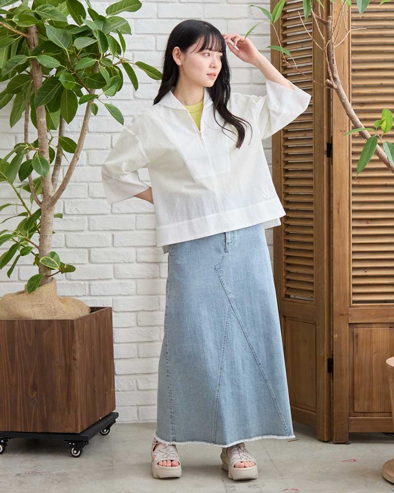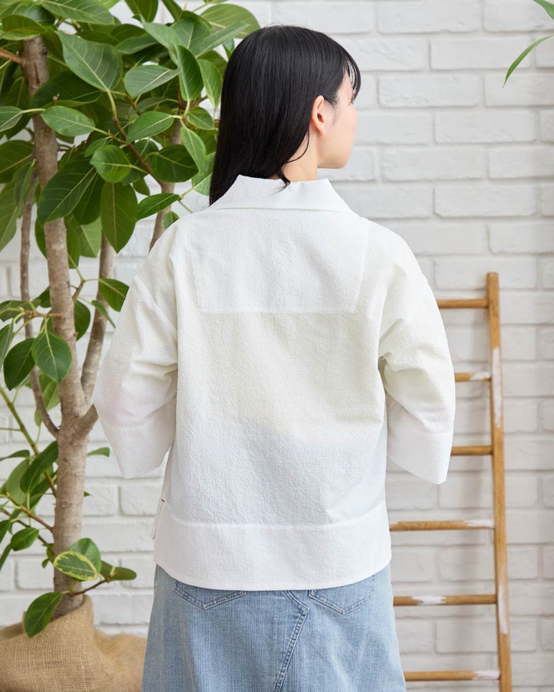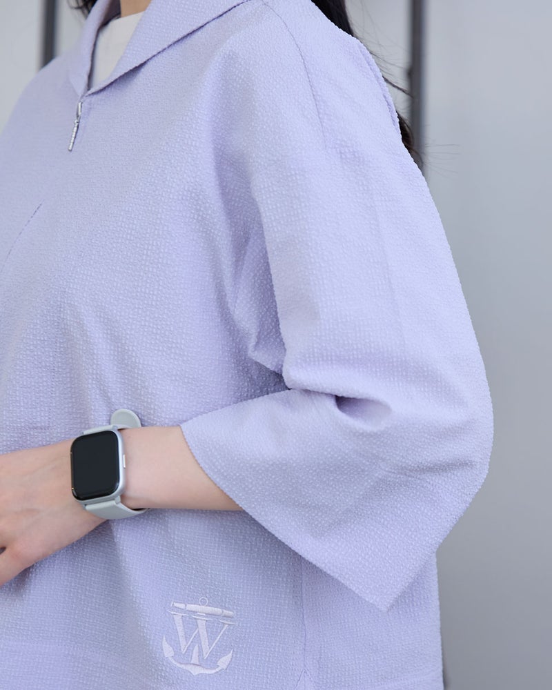 セーラーカラーを大人らしく上品にアレンジしたブラウスです。小さな凹凸が広がるサッカー生地で、肌に触れる面積を減らし、熱や湿気を逃がすため春夏も涼しく快適に着用できます。襟のラインは甘すぎない絶妙なフォルムに整え、顔周りをスッキリと見せます。フロントにあしらったメタルのハーフジップが光り上品な印象に仕上がります。左裾のアンカーモチーフ刺しゅうもポイント。手首が見える7分袖は、ブレスレットやネイルを引き立てます。オフィスや学校行事、休日のお出かけや旅先まで、いつもより少しお洒落を楽しみたい日の主役としておすすめです。 モデル身長: 160 cm 着用サイズ: M サイズ Golden Bear White Label (WOMEN) ブラウス (WOMEN) 【着用アイテム】467U5430 GB天竺Tシャツ 468U4750 ワイドデニムパンツ 468U4051 レーストートバック