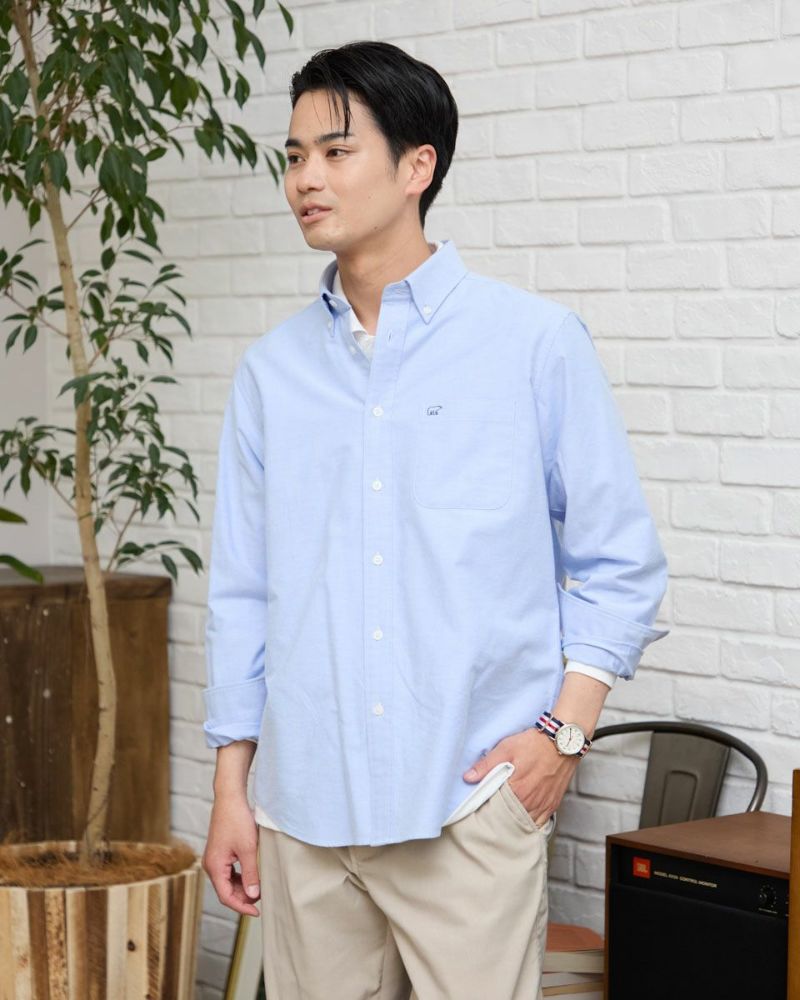 ボタンダウン襟のオックスシャツです。生地は緯糸に太番手を使用し肉感があり、表面にピーチ起毛をかけ製品柔軟洗いをかけることでふっくらとした柔らかな風合いに仕上げました。お洗濯後のアイロンがけが大変・・・なんてこと、ありますよね?イージー加工を施していますのでお手入れが簡単です。ホワイト、ピンク、クリーム、サックスのカラーバリエーション。迷ったらこれ!と言える万能アイテムです。一枚持っているだけで、毎日のコーディネートがぐっと楽になります。 モデル身長: 176 cm 着用サイズ: L サイズ Golden Bear Men's シャツ (Men's) レディースサイズはこちら 【着用アイテム】317RC101 ブレザー 314RC412 ラガーシャツ 314R8452 長袖ポロシャツ 314R8701 チノパン 314R8703 イージーパンツ