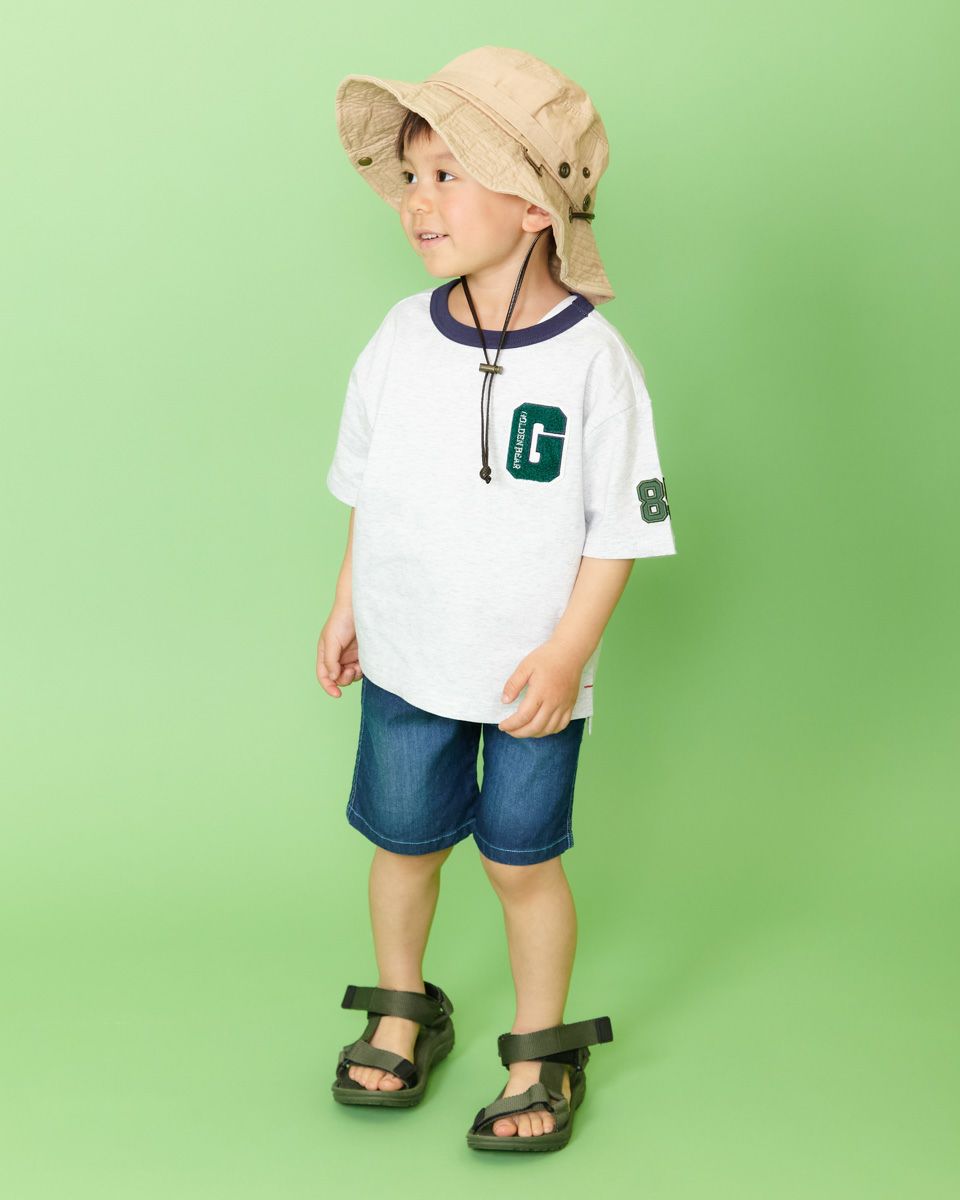 胸元のパイル生地のエンブレムがポイントのTシャツです!少し肩落ちのゆったりめシルエットで、デニムとの相性も抜群♪袖のナンバーアップリケも自慢の1着です! モデル身長: 99 cm 着用サイズ: 100 サイズ Golden Bear KIDS カットソー (KIDS)