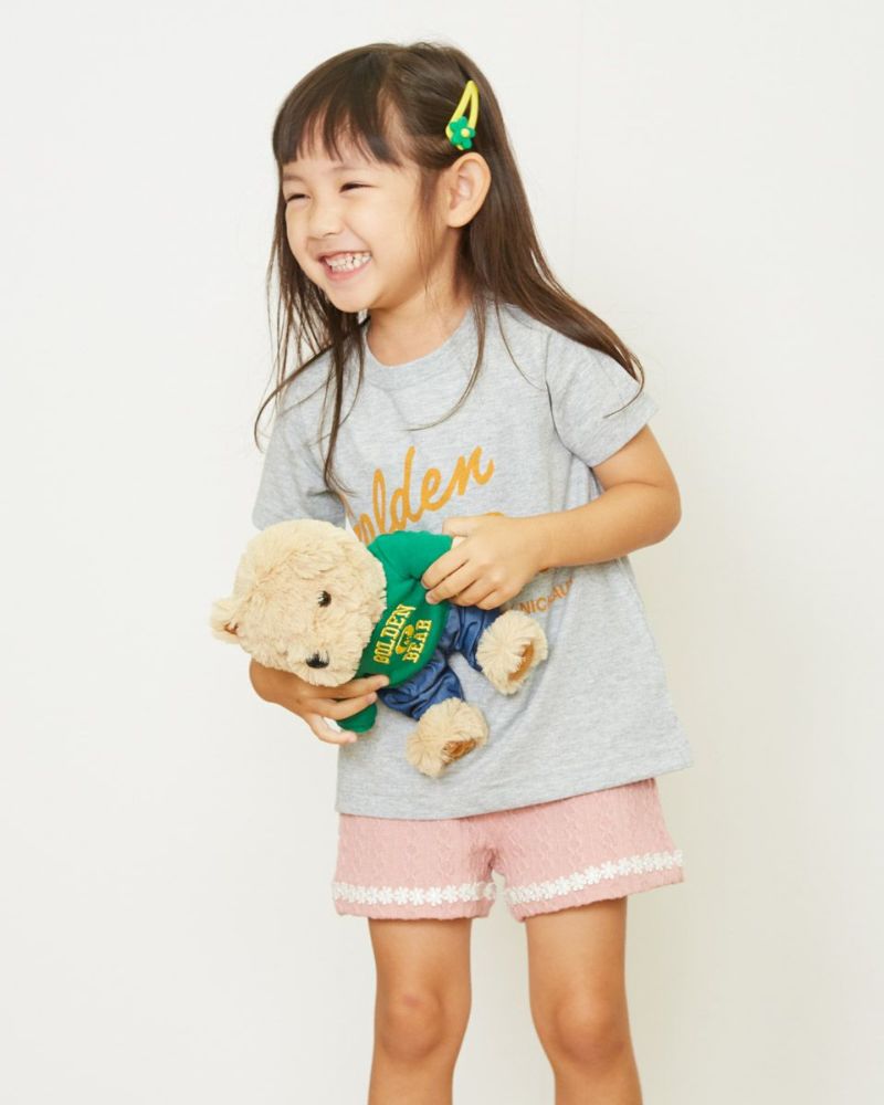 正面にロゴをプリントしたベーシックTシャツ。襟は太めのフライスでヨレにくいしっかりとした仕様にしました。カジュアルなコーディネートにおすすめのアイテムです。ゴールデンベアロゴとくまプリントがポイント!