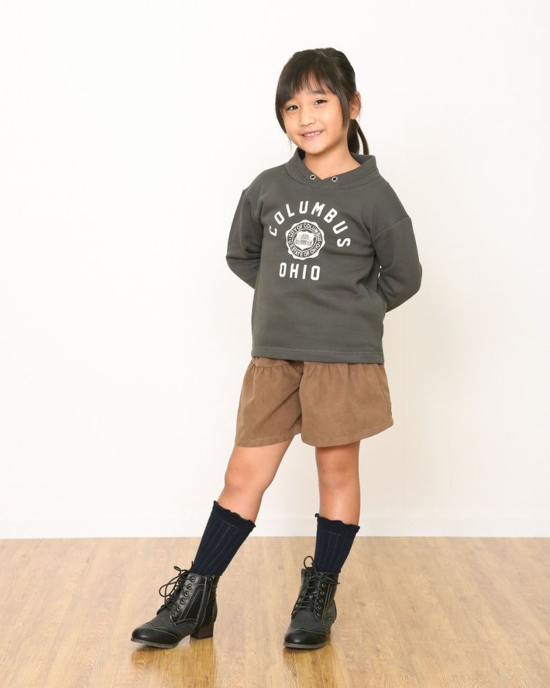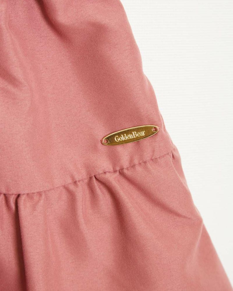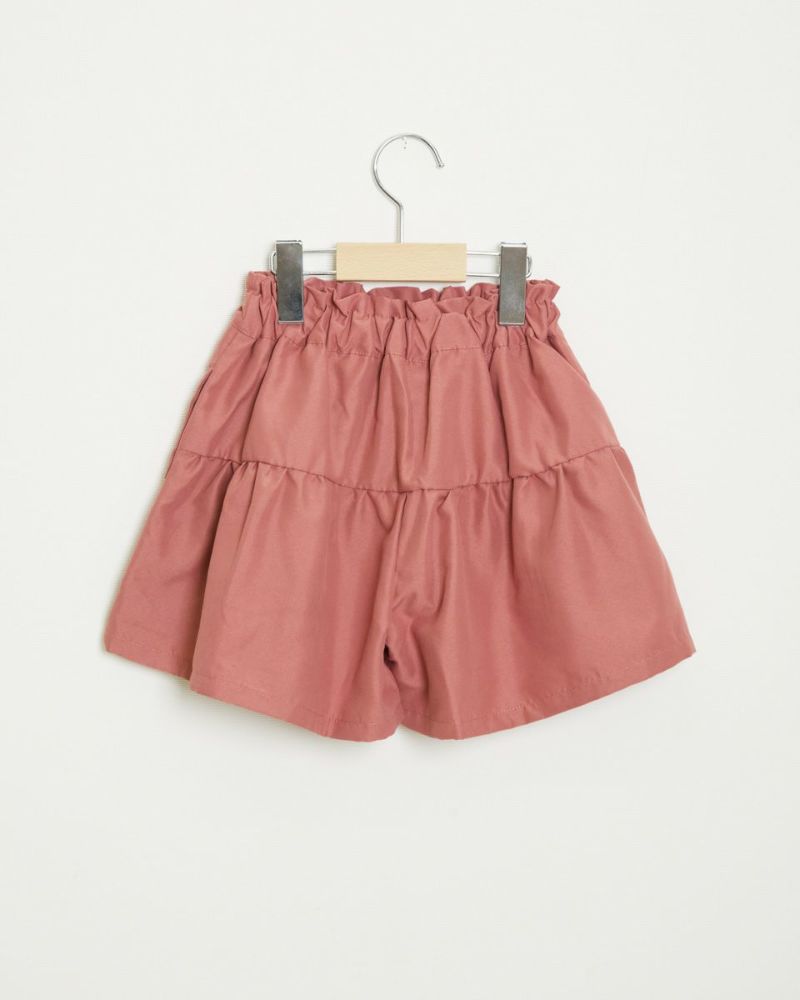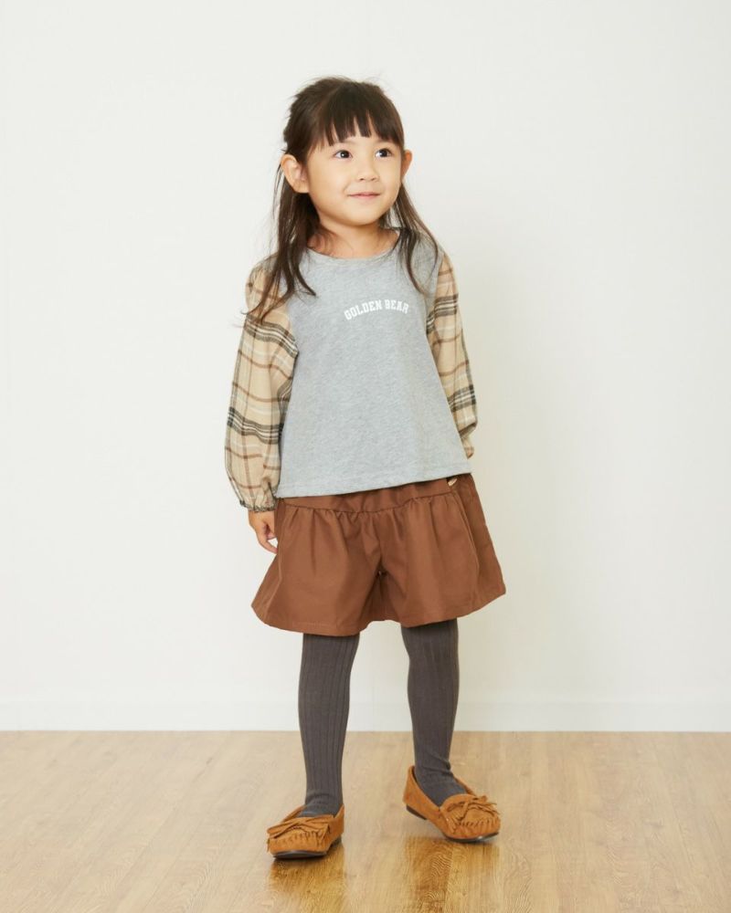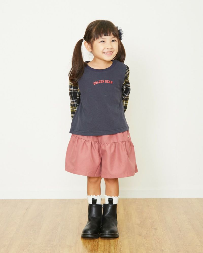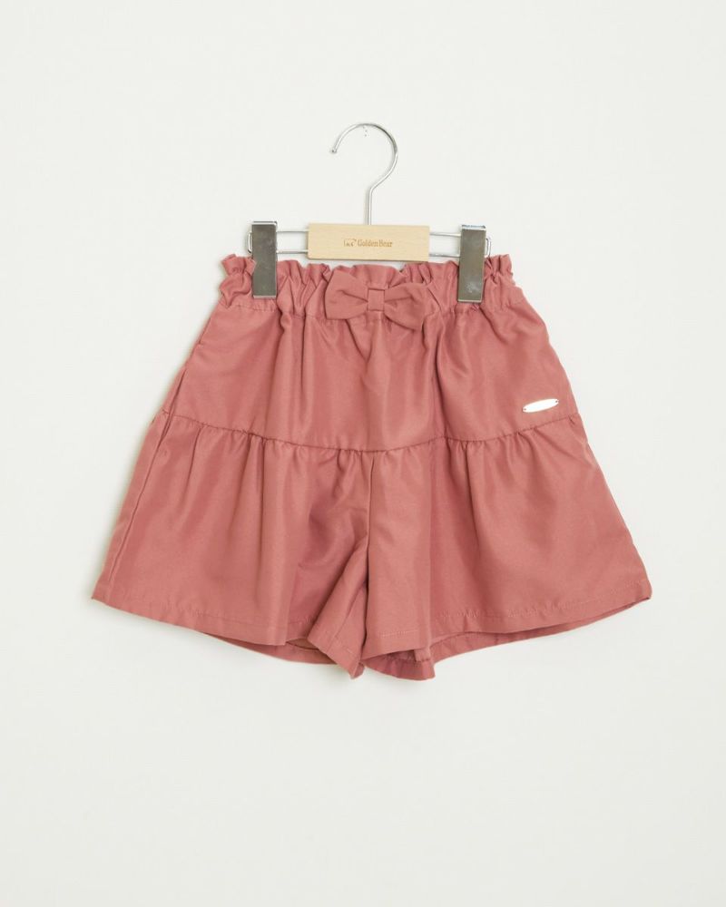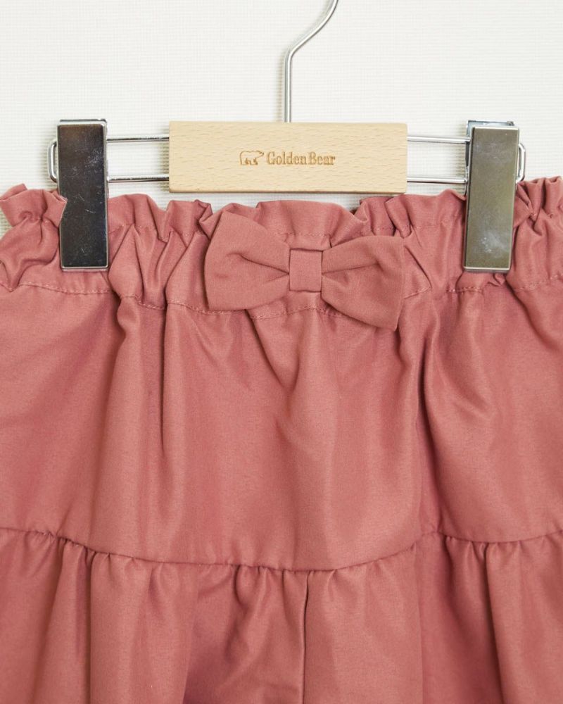 ウエストのリボンと切替ティアードがとてもかわいいキュロットです。ウエストゴム使いの穿きやすく、やわらかく肌触りのよいスエード素材を使用しています。両脇にポケット付き。Golden Bearのロゴをあしらったゴールドのロゴプレートもよいアクセントになっています。甘めのピンクとアクティブな印象にもなるモカの2色展開です。